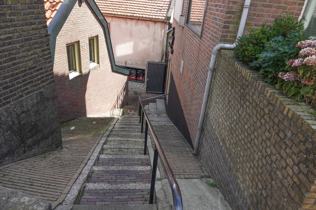 Urk ligt hoog. Dat merkten wij, doordat we vanaf de haven naar boven liepen en we zagen ook steile trappen naar beneden.