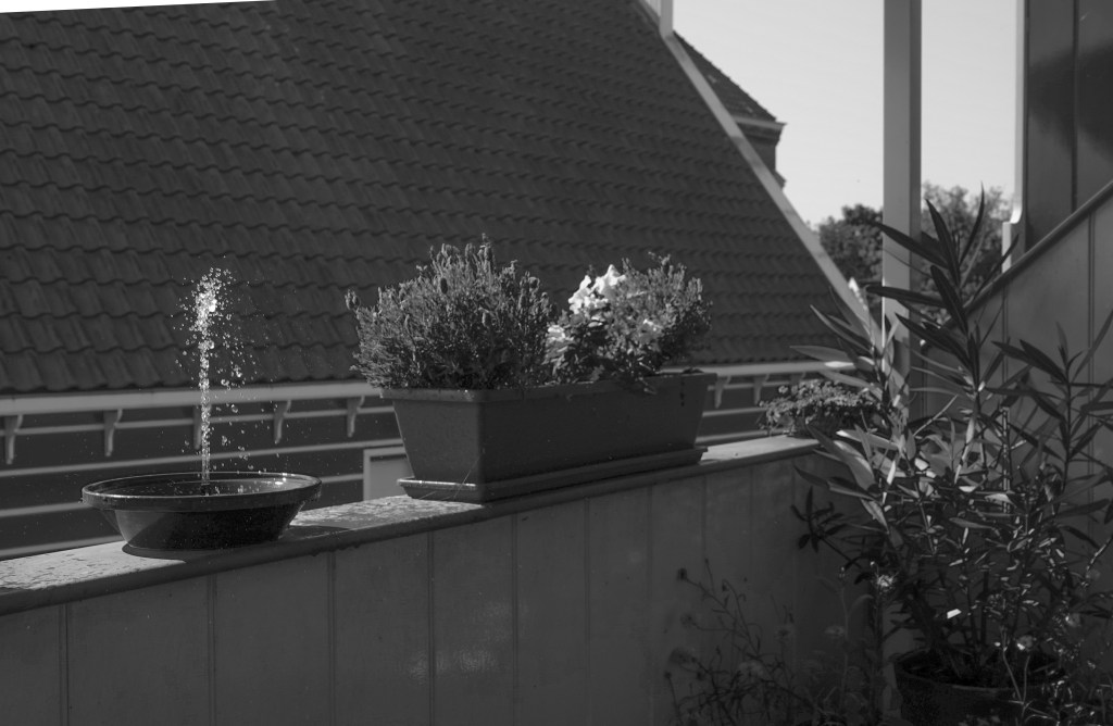 Eigenlijk naar aanleiding van reacties van gisteren op mijn foto van het fonteintje, heb ik wat meer foto’s gemaakt van dat fonteintje en mijn balkon. De laatste dagen zat ik er veel. Lekker onder de luifel van het zonnescherm en bij het rustgevende geklater van de fontein.