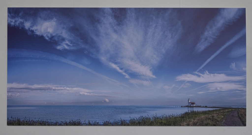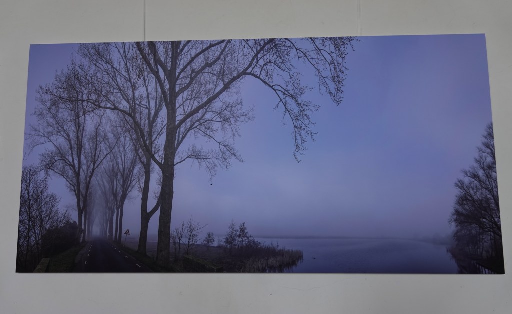 Een interview met fotograaf Albert Roosenburg (78) maakte mij helemaal nieuwsgierig. De man woont in Zuiderwoude, maar groeide op in Zuid-Limburg. Op fotografiegebied is het een allrounder. Hij maakt portretfoto’s, maar draait ook zijn hand niet om voor culinaire fotografie en stillevens. Maar hier in het dorpskerkje zien we alleen landschapsfotografie. Er hangen acht enorme fotopanelen, die allemaal het Waterlandse landschap rond Zuiderwoude als thema hebben en dan vooral het gedeelte boven de horizon.