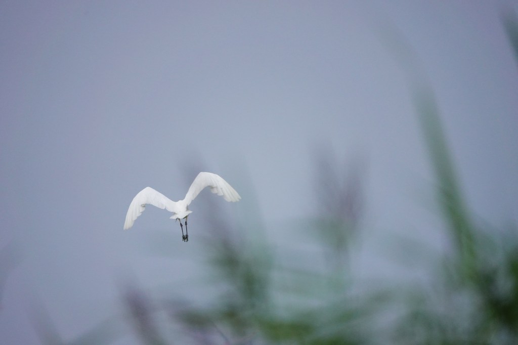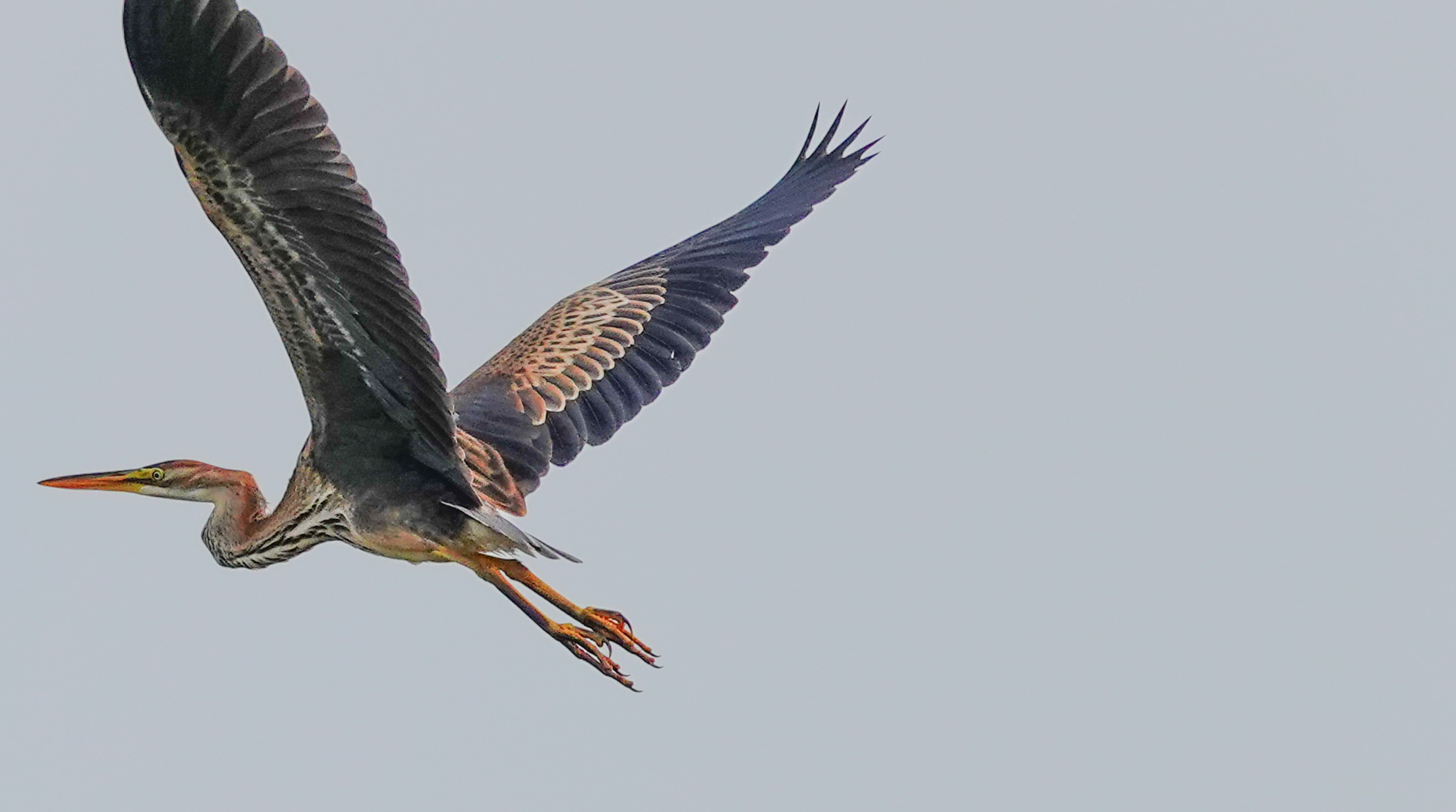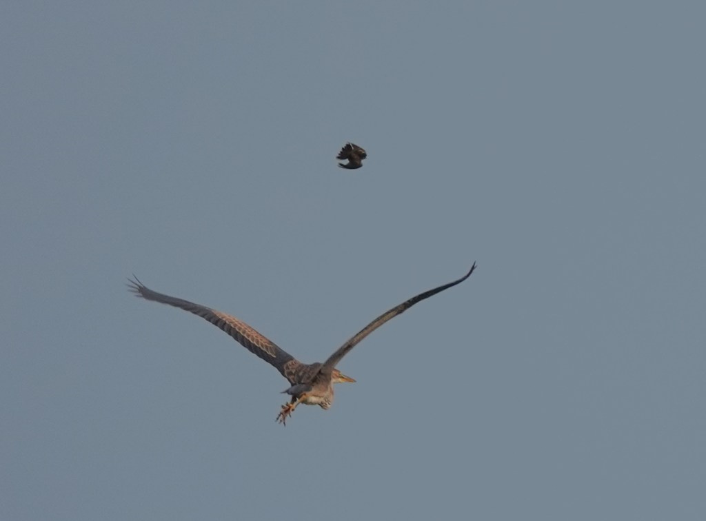 De purperreiger schoot weer vanuit de rietkraag omhoog. Deze soort is duidelijk heel wat schuwer dan de blauwe reiger.