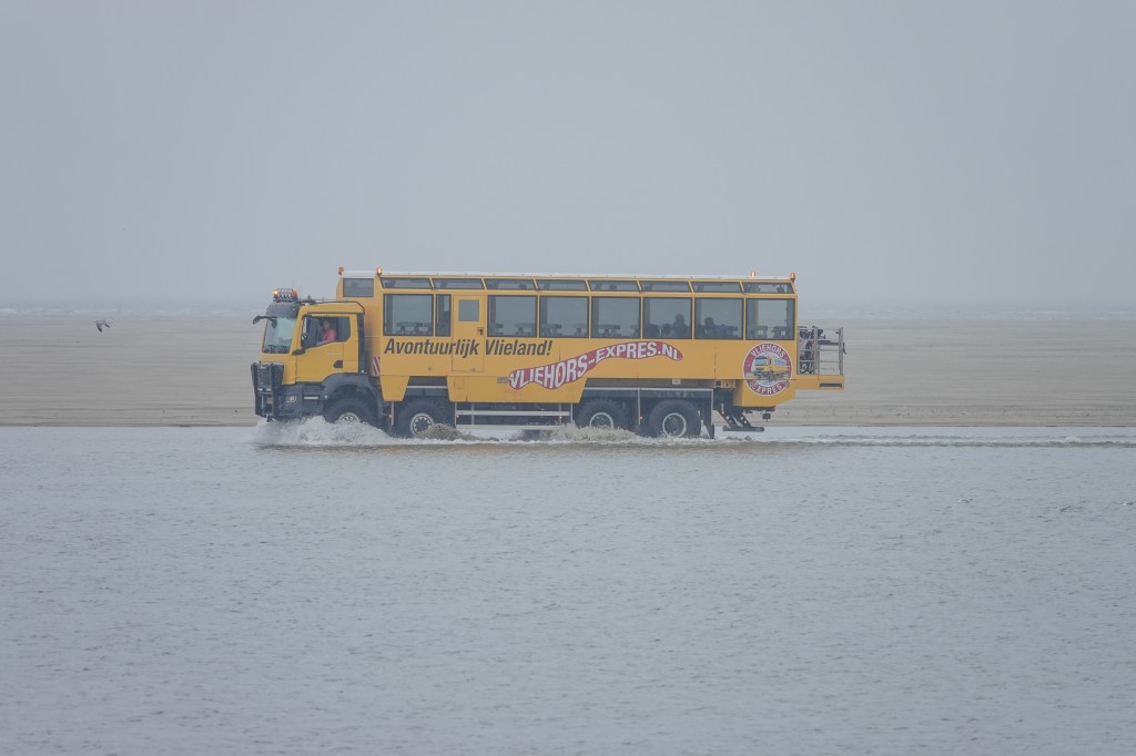 Daar zagen we een grote bus aankomen met amfibie-eigenschappen. Hij maalt er dan ook niet om, als hij een stukje door het water moet rijden.