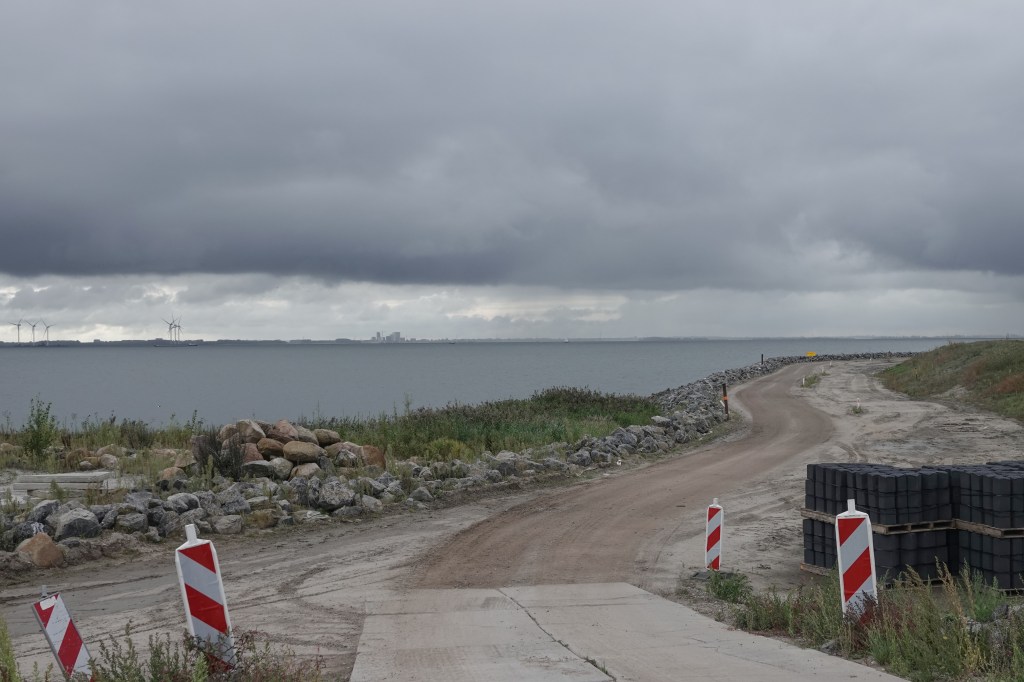 We sloegen af naar Uitdam. Daar konden we van dichtbij even bekijken hoe de stand van zaken is met de dijkverzwaring. Langs de hele kust van het IJsselmeer moet dat gebeuren.