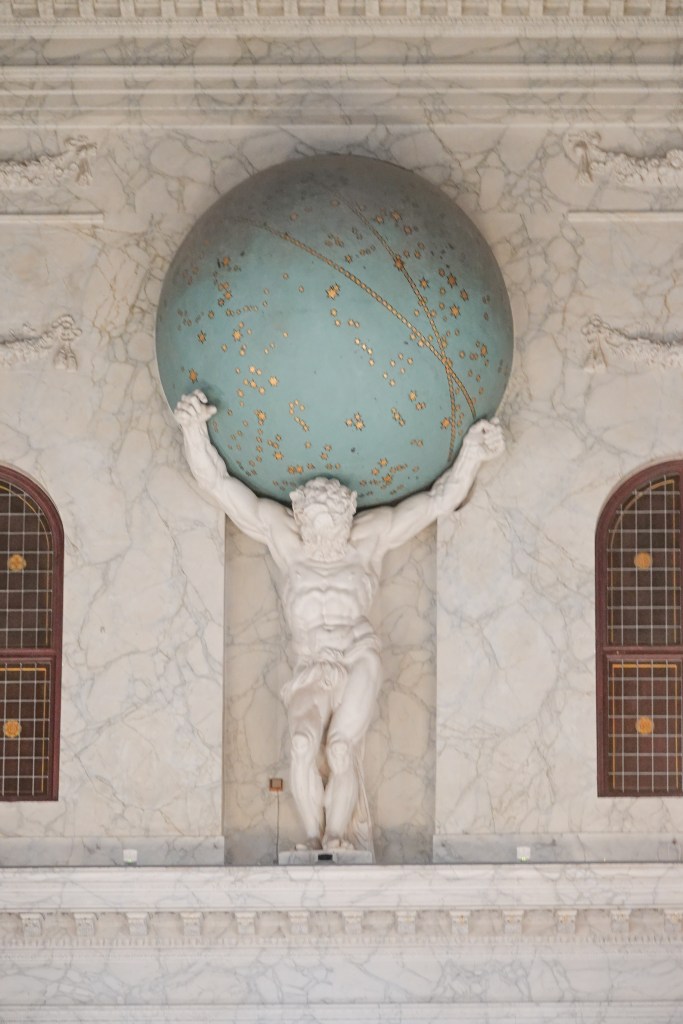 Atlas, die ik wel kende van het dak van het paleis, omdat ik vroeger voorlas over Wiplala, stond dus niet alleen buiten, maar ook hier binnen.