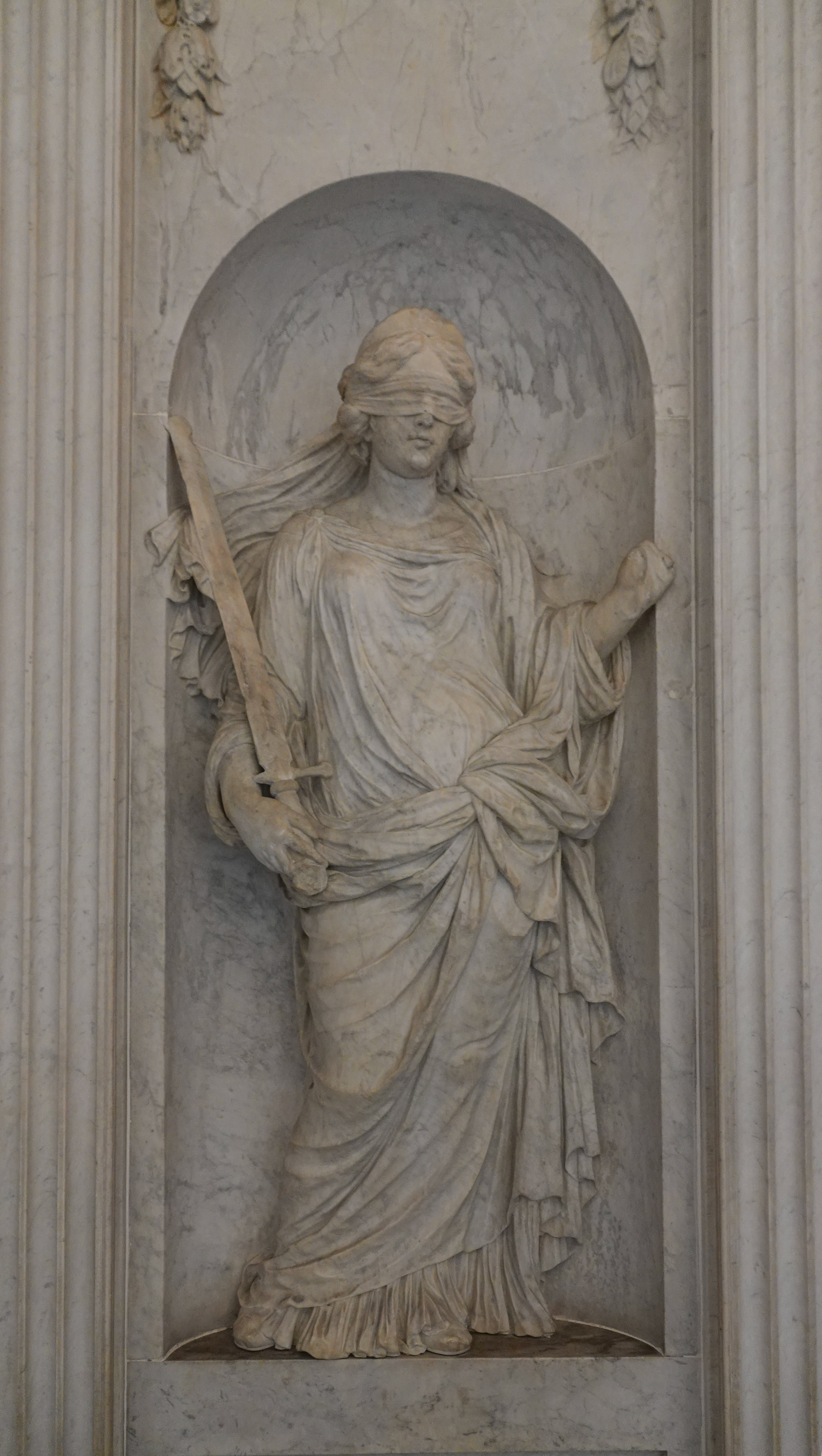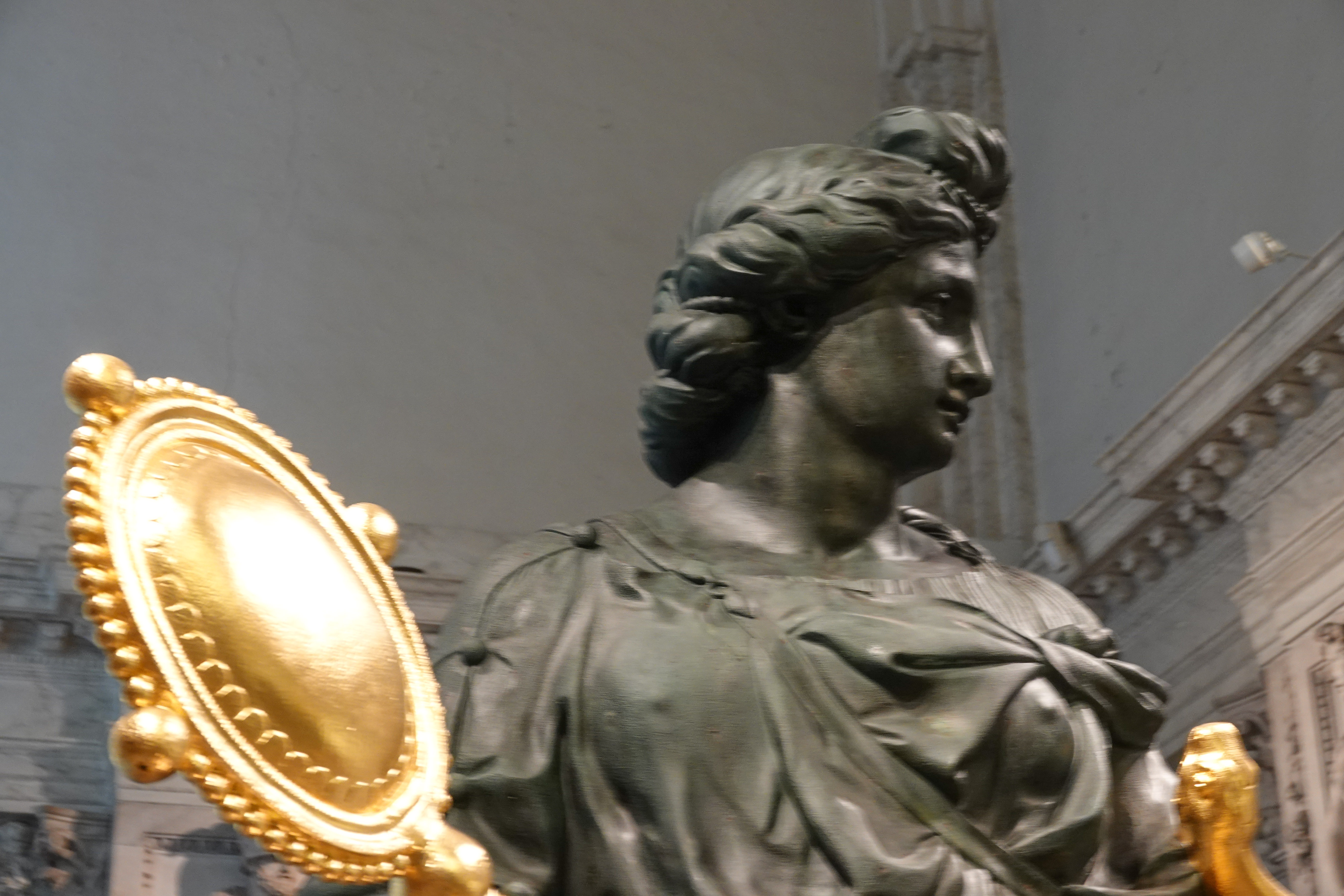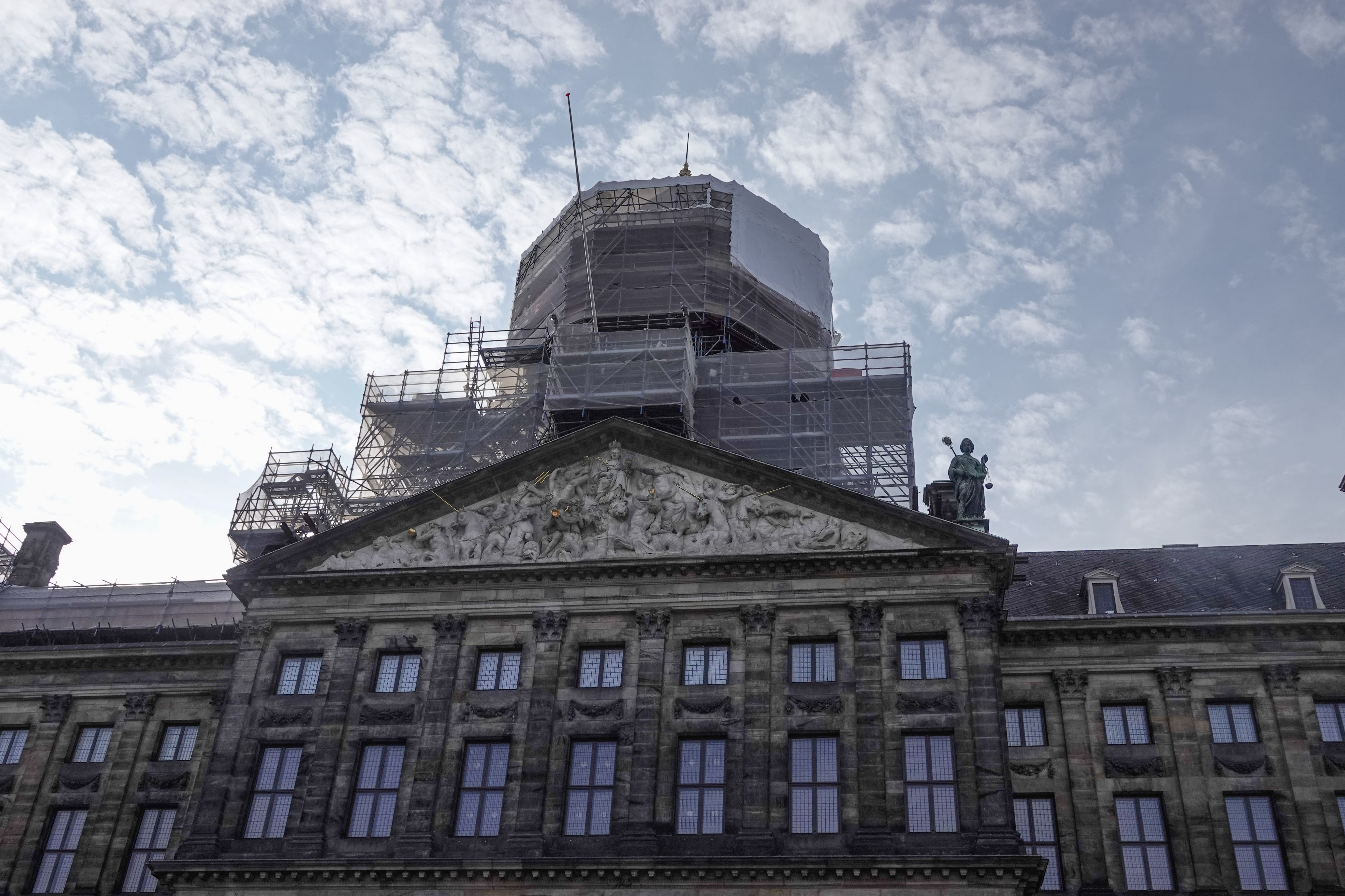 Ook stond er één van de zes meterhoge bronzen beelden, die normaal op het dak staan hier op de grond. Dit is Prudentia. Ze is 3,8 meter hoog en weegt 3000 kilo. Geen storm die haar omver blaast. De andere vijf, Justitia, Vigilantia, Temperantia , Vrede en Atlas, zullen ook nog wel aan de beurt komen voor een opknapbeurt.