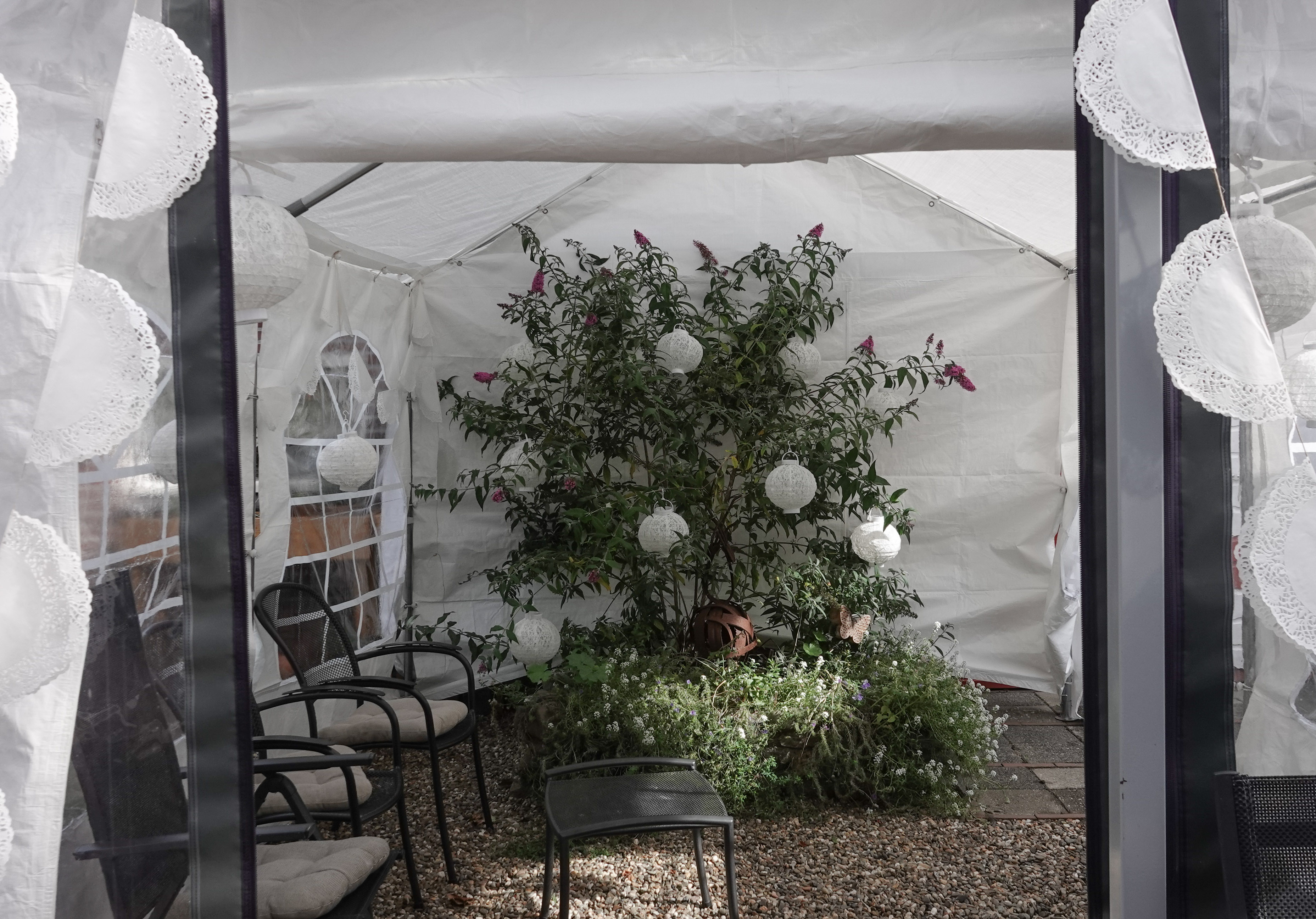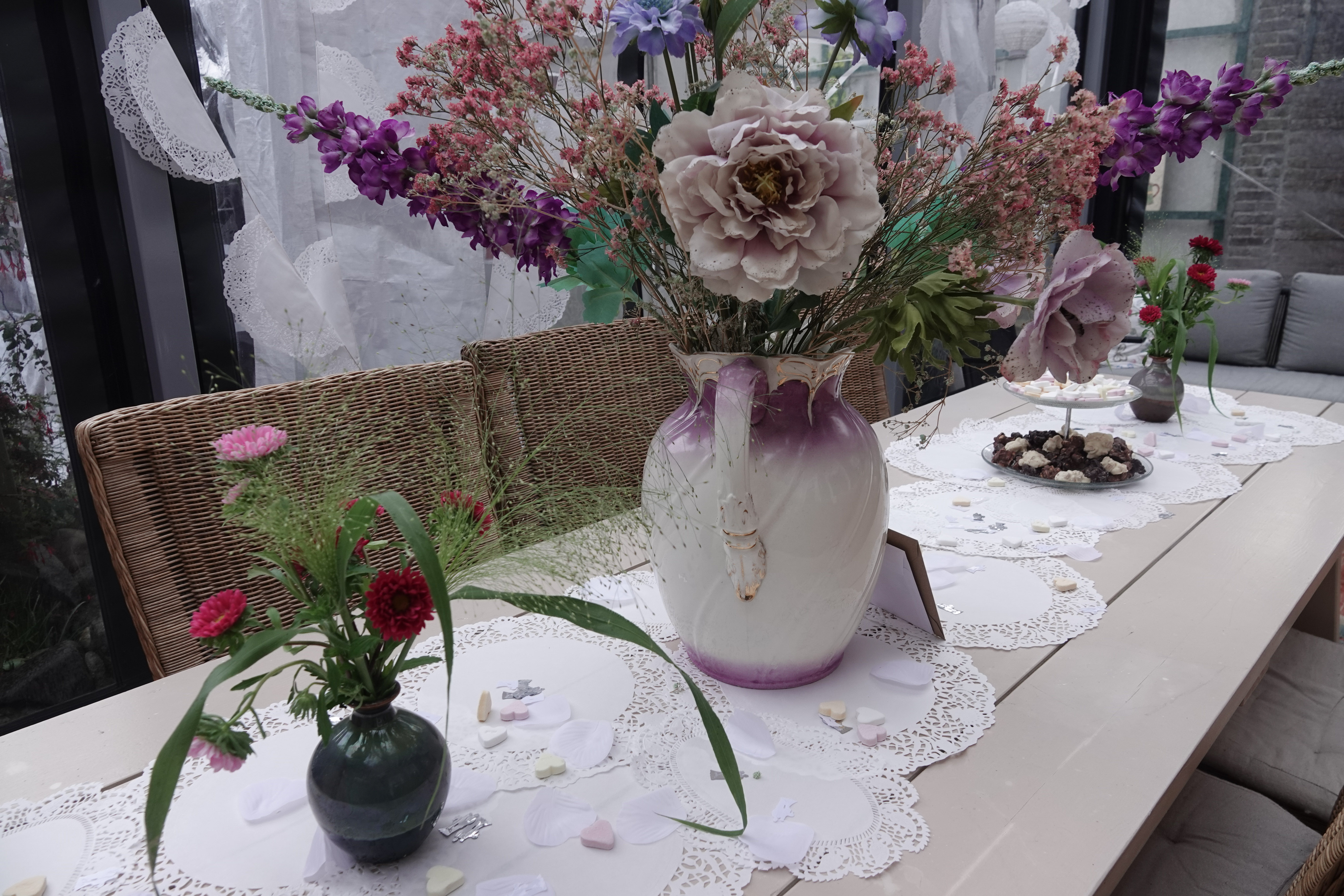 Er moest ook nog geluncht worden en daarvoor togen we naar het huis van mijn zus. Zij had haar tuin aangekleed als feestlokatie. Het kleine gezelschap deed zich daar te goed aan de lunch en alle verwennerijen.
