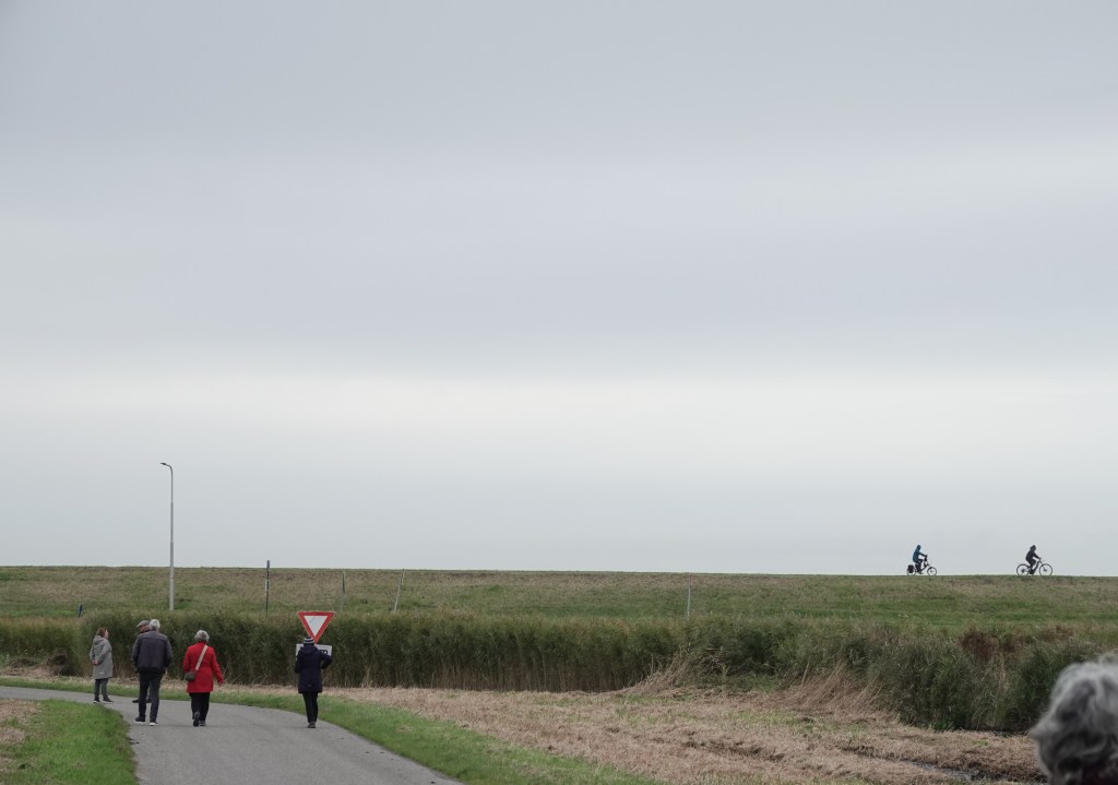 Voordat we aan de wandeling met de wandelgroep van Huis aan het Water begonnen klommen we de dijk op van de Gouwzee. Er waren eerder in de week grote groepen krooneenden en anderszins gesignaleerd, dus die wilden wij ook bewonderen. Helaas lagen de eenden uit het gezichtsveld te dommelen,