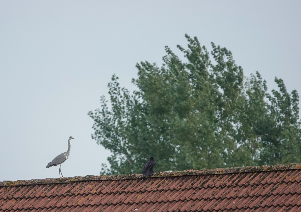 Het klapstuk was een reiger op een dak, die het aan de stok kreeg met een kraai.
