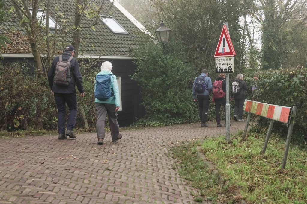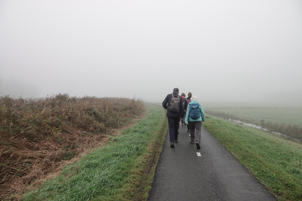 We liepen richting mijn dorp over de dijk langs de Purmerringvaart. Het was de weg die ik net gefietst had. In de aanprijzing van deze route waren ons prachtige vergezichten beloofd. En inderdaad zou je vanaf hier de kerkjes van ons dorp al fraai hebben kunnen zien liggen. Helaas was het een kleine wereld vandaag.