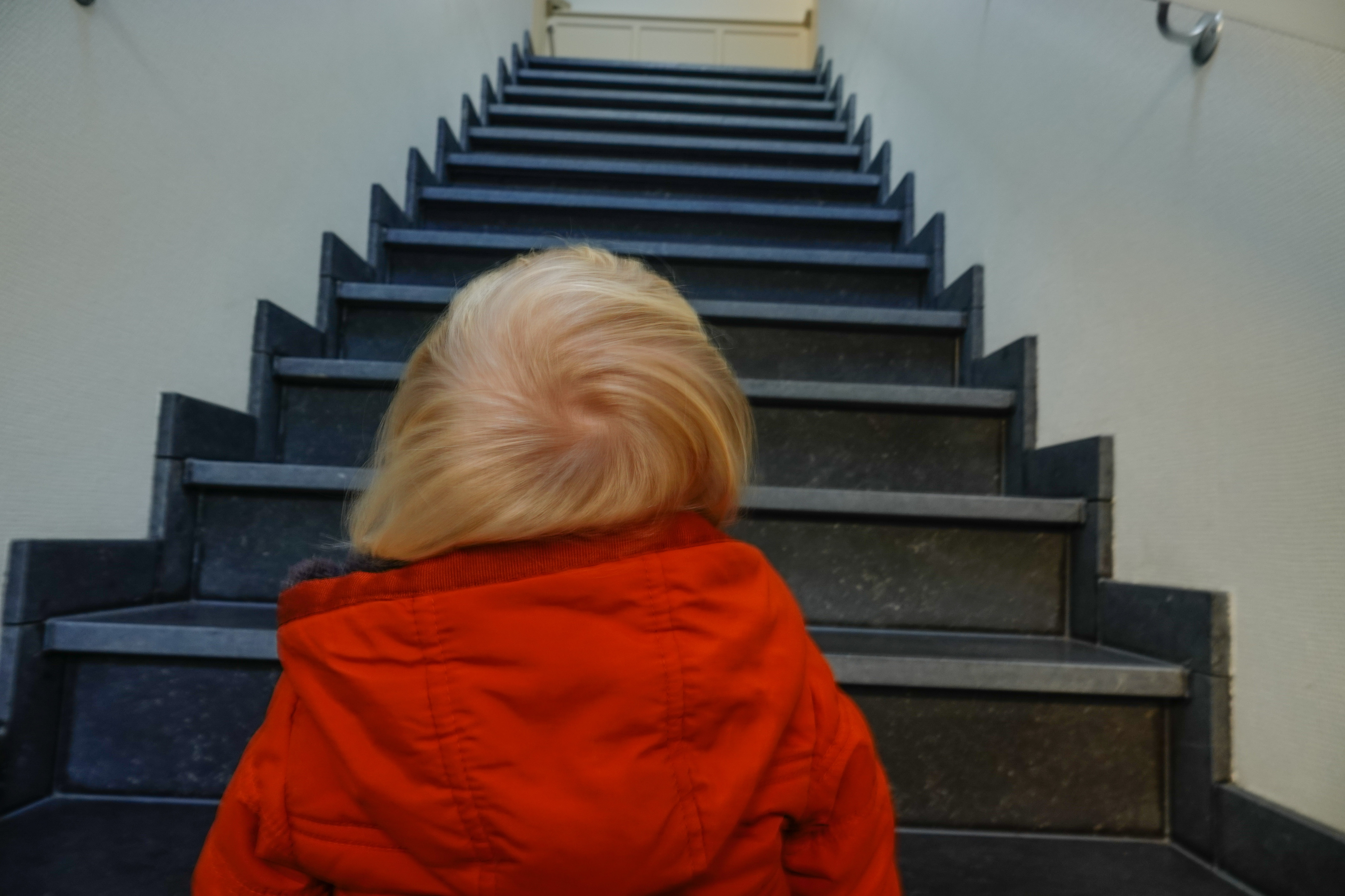 Boekjes vindt hij vooral leuk om zelf in te bladeren, maar de inhoud beklijft nog niet. Hij zegt nog bijna niets, maar met wijzen en wat klanken maakt hij zich goed verstaanbaar. De trap in mijn hal loopt hij zo op, aan mijn hand. Hij probeert nu al om als een volwassene bij elke tree door te stappen. Hij zal het traplopen sneller onder de knie hebben dan zijn zus. Zij stapt nu nog omhoog terwijl ze haar tweede voet weer bijsluit bij de eerste.