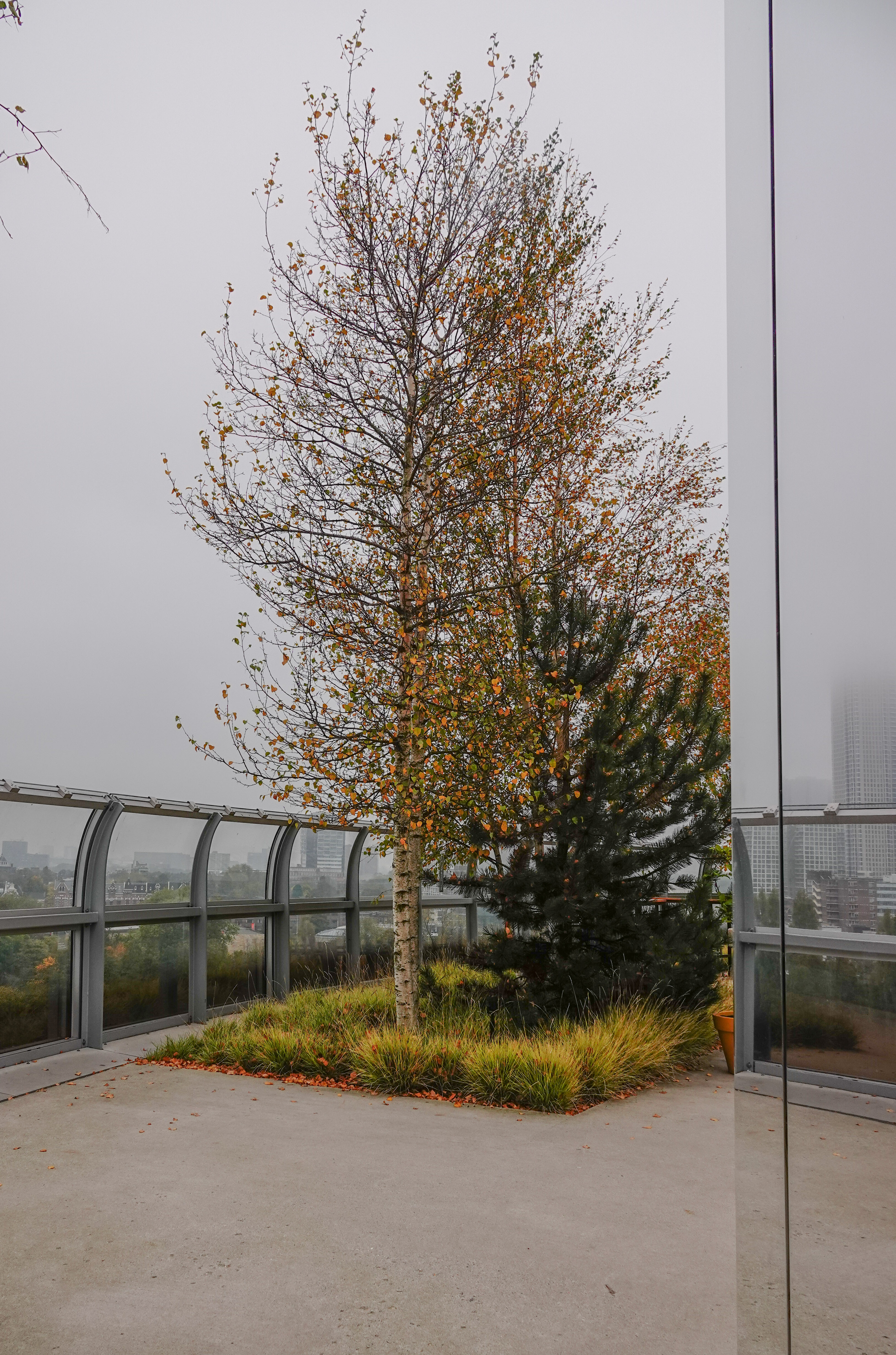 Eenmaal binnen namen we de lift naar de bovenste etage. Een bijzondere ervaring om op dat dakterras tussen de bomen en struiken te lopen. Het uitzicht had beter gekund, maar daarover later meer.