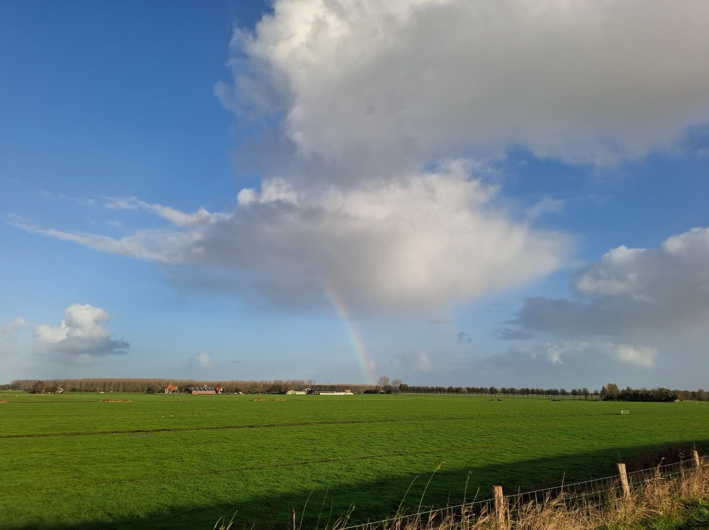 Op maandagmorgen stond zoals gewoonlijk weer een wandeling gepland met de mensen van Huis aan het Water. Na drie dagen grijs weer scheen de zon weer eens. Dat geeft meteen een heel andere aanblik. Op de heenweg naar Katwoude zag ik een regenboog. Daar hoort regen bij, maar die stond pas voor in de middag op de planning.