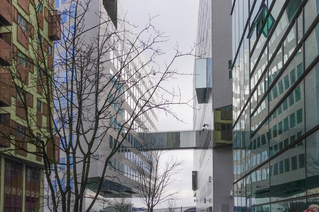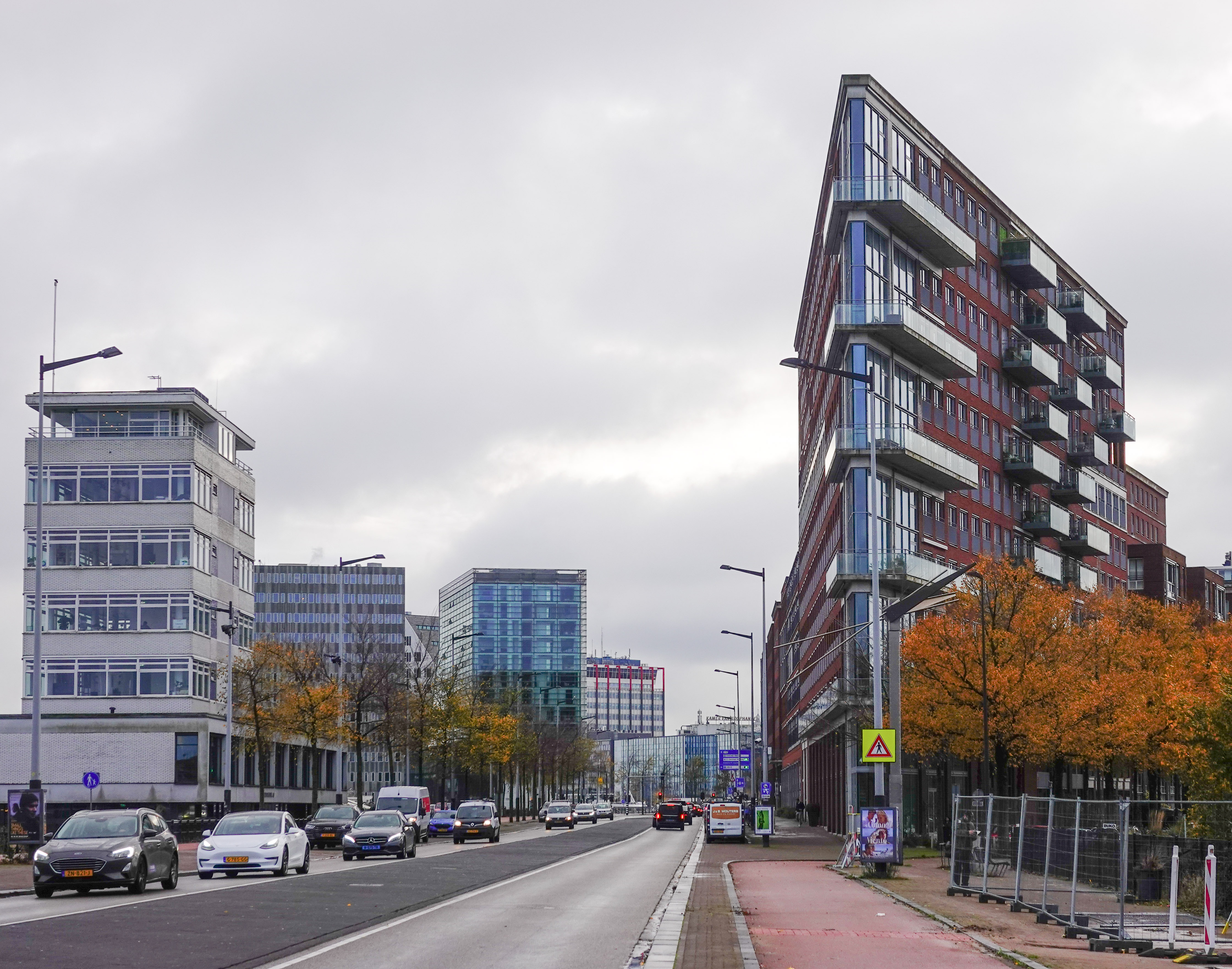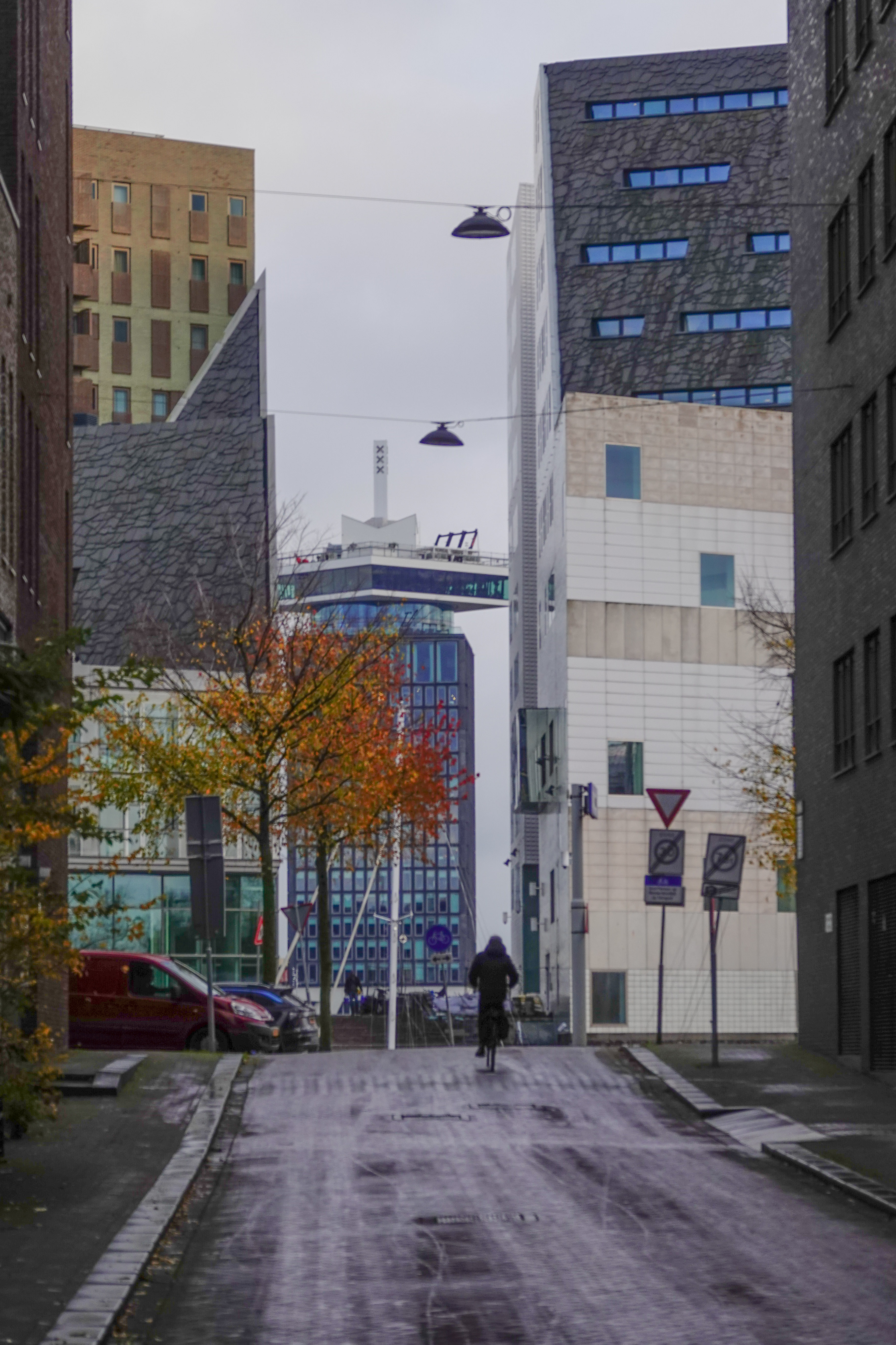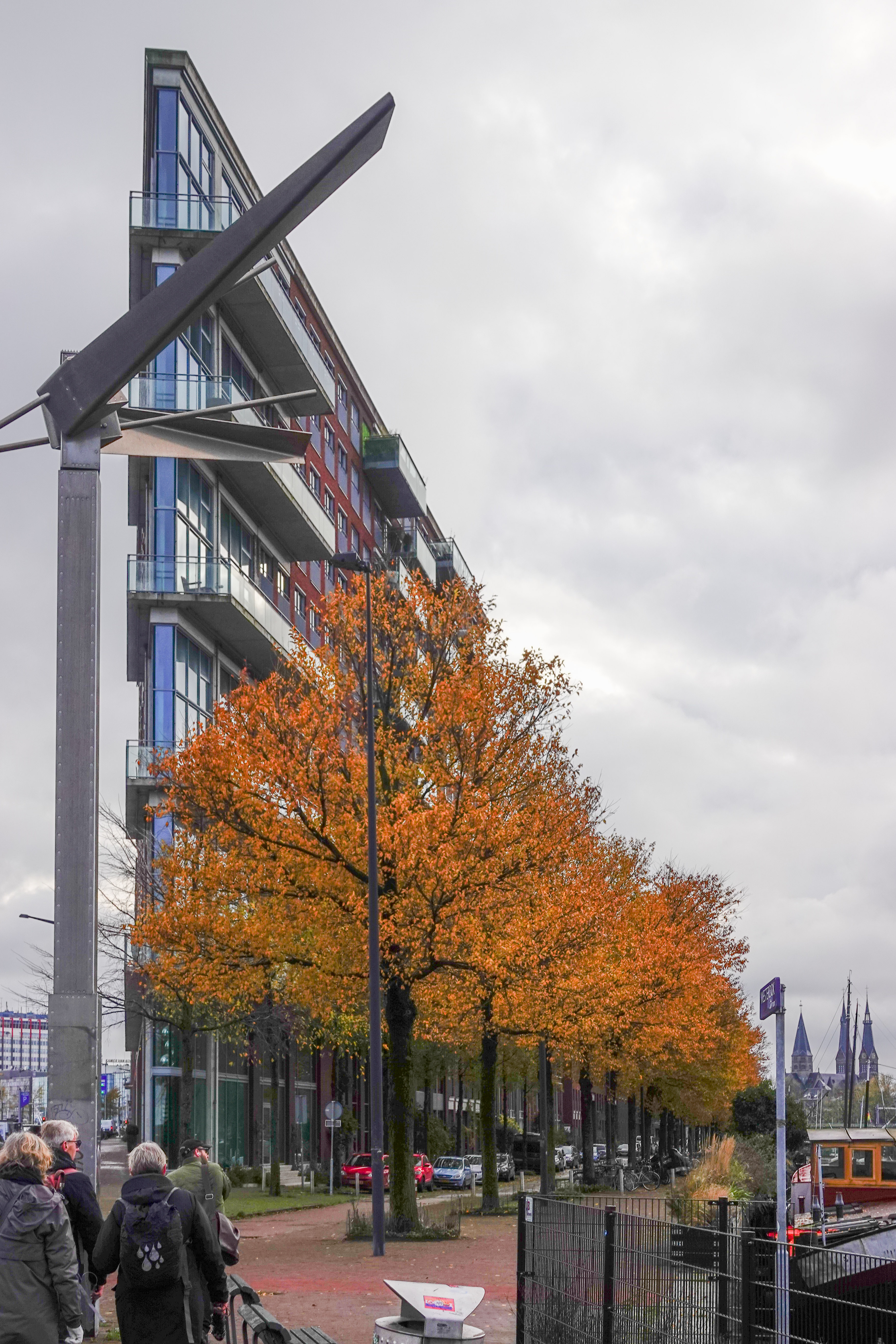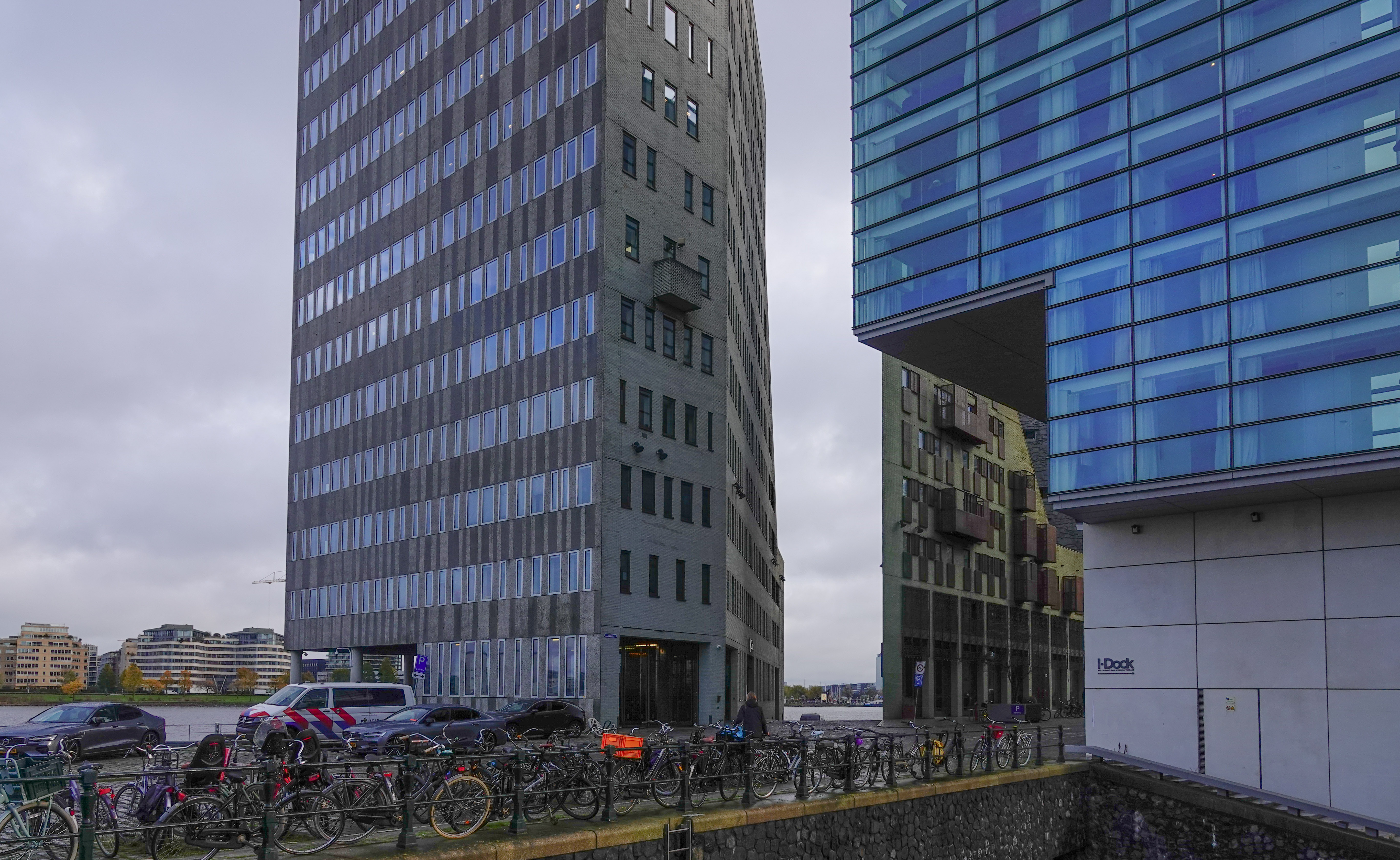 Dan bereiken we de IJkade en lopen tussen hoge markante gebouwen door