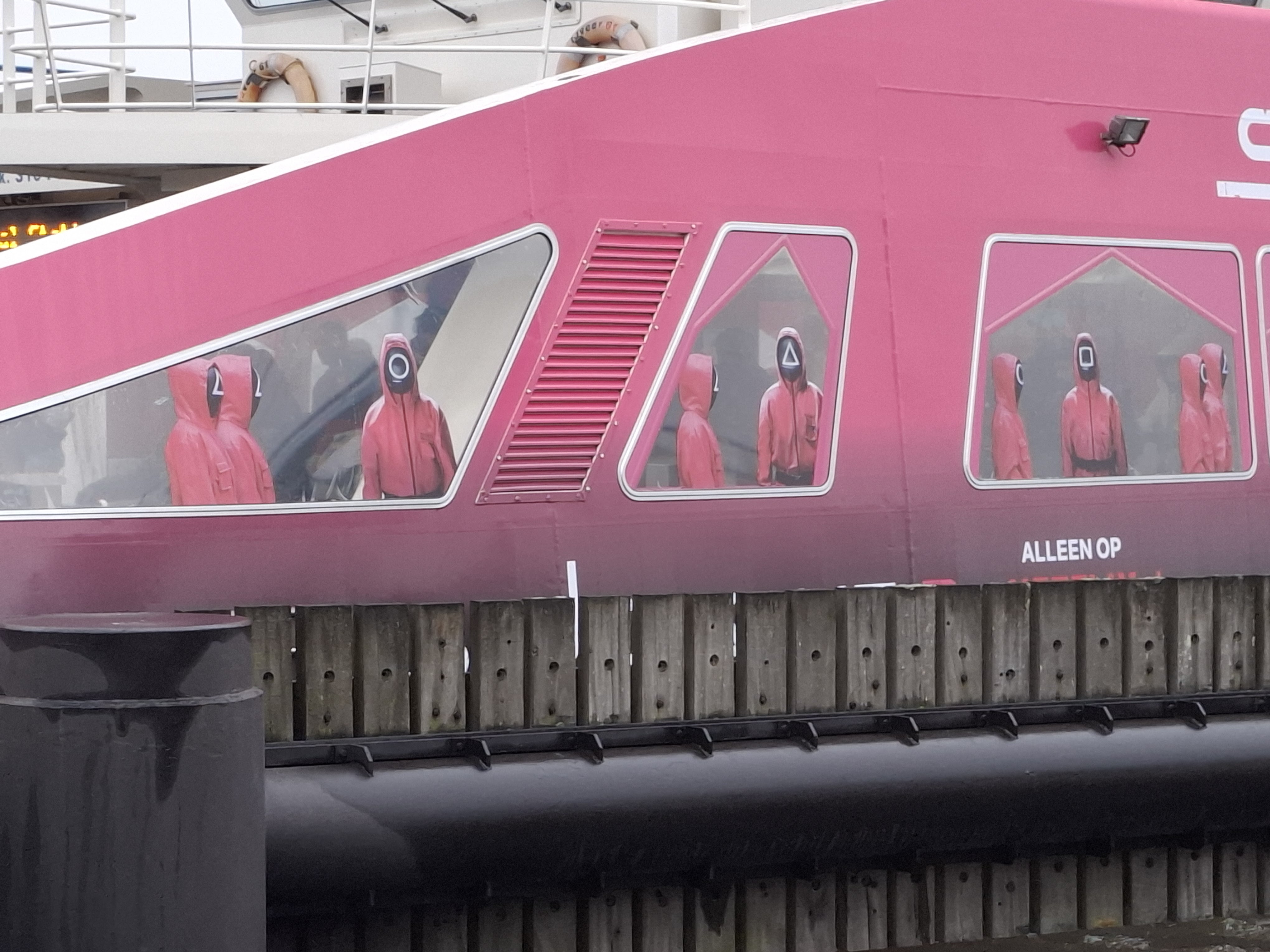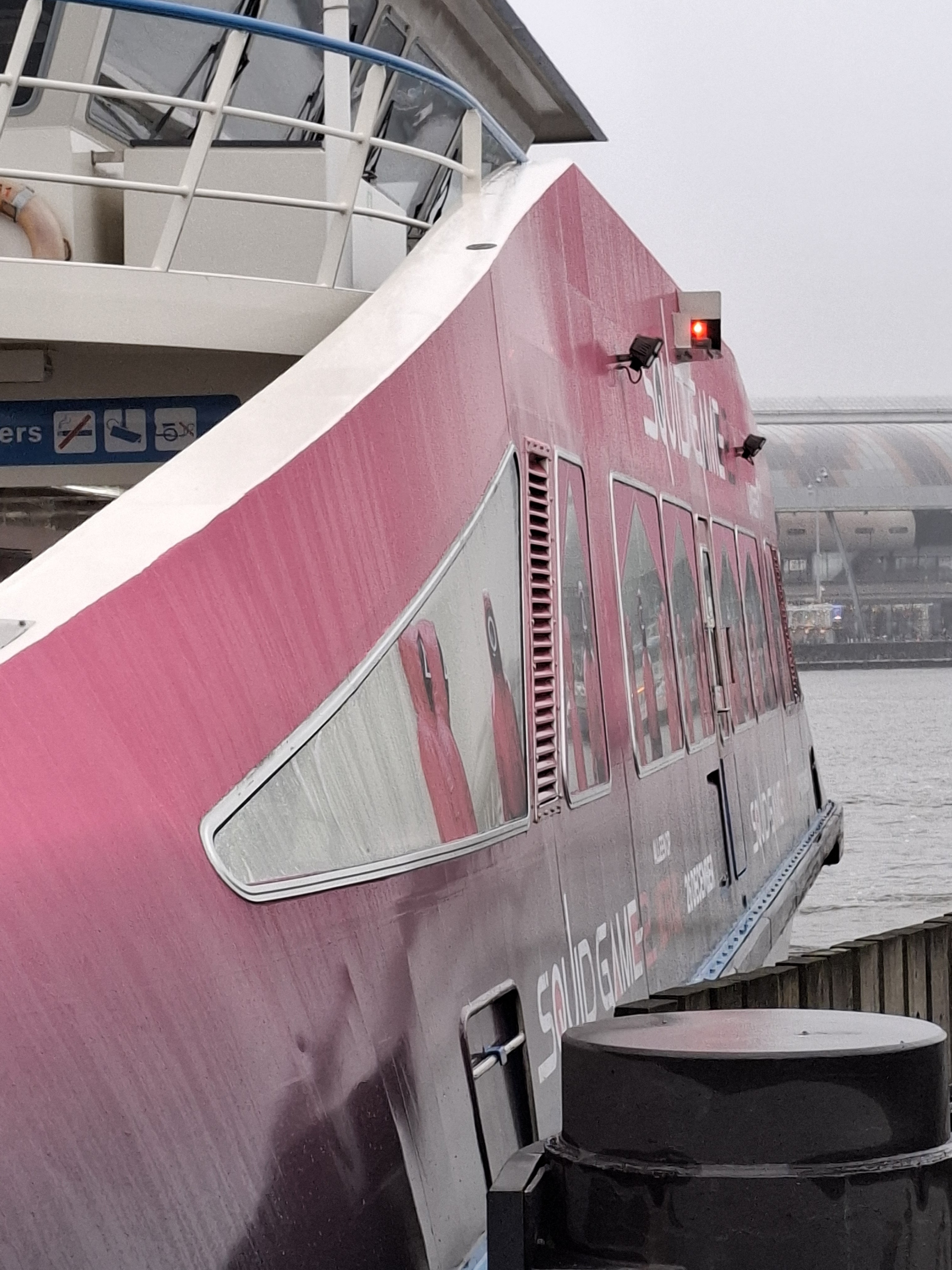 Eye ligt aan de overkant van ’t IJ in Amsterdam. Daarom moesten we heen en terug met de pont. Toevallig was de pont, die wij op de heenweg namen roze, F’s lievelingskleur. Op de terugweg hebben we, eerlijk is eerlijk, getreuzeld en lieten de blauwe pont vertrekken. We moesten toch echt weer met de roze. Oma’s mogen verwennen, hé?