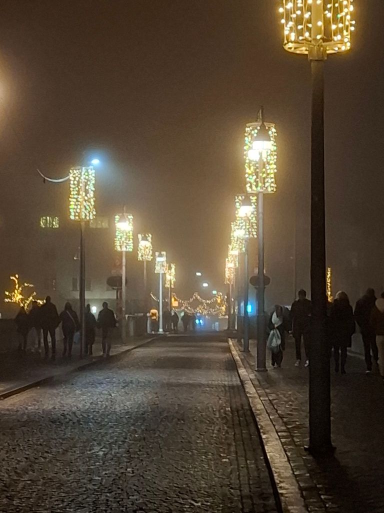 Vervolgens loop ik later op de avond door de mistige stad over de Oude Brug