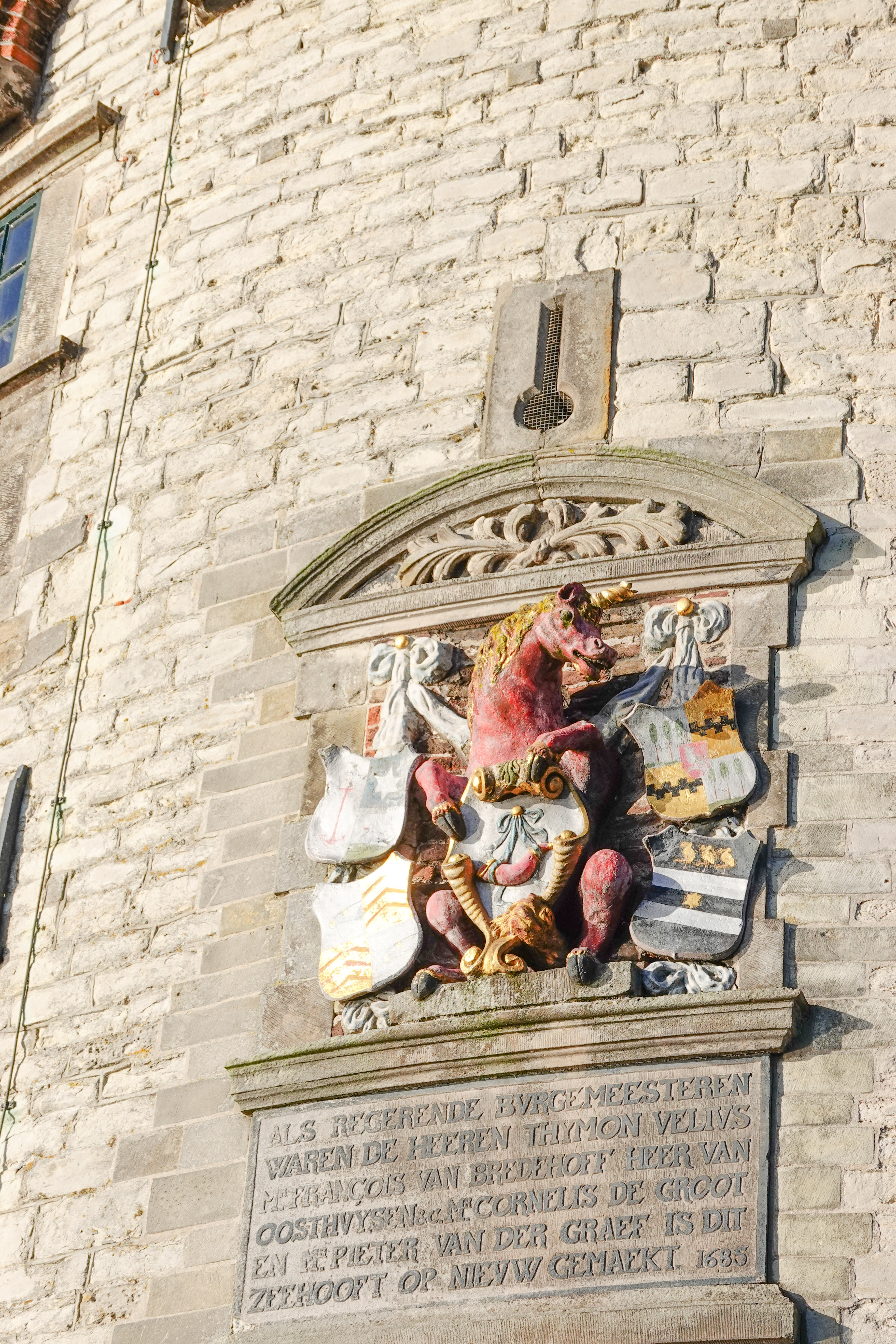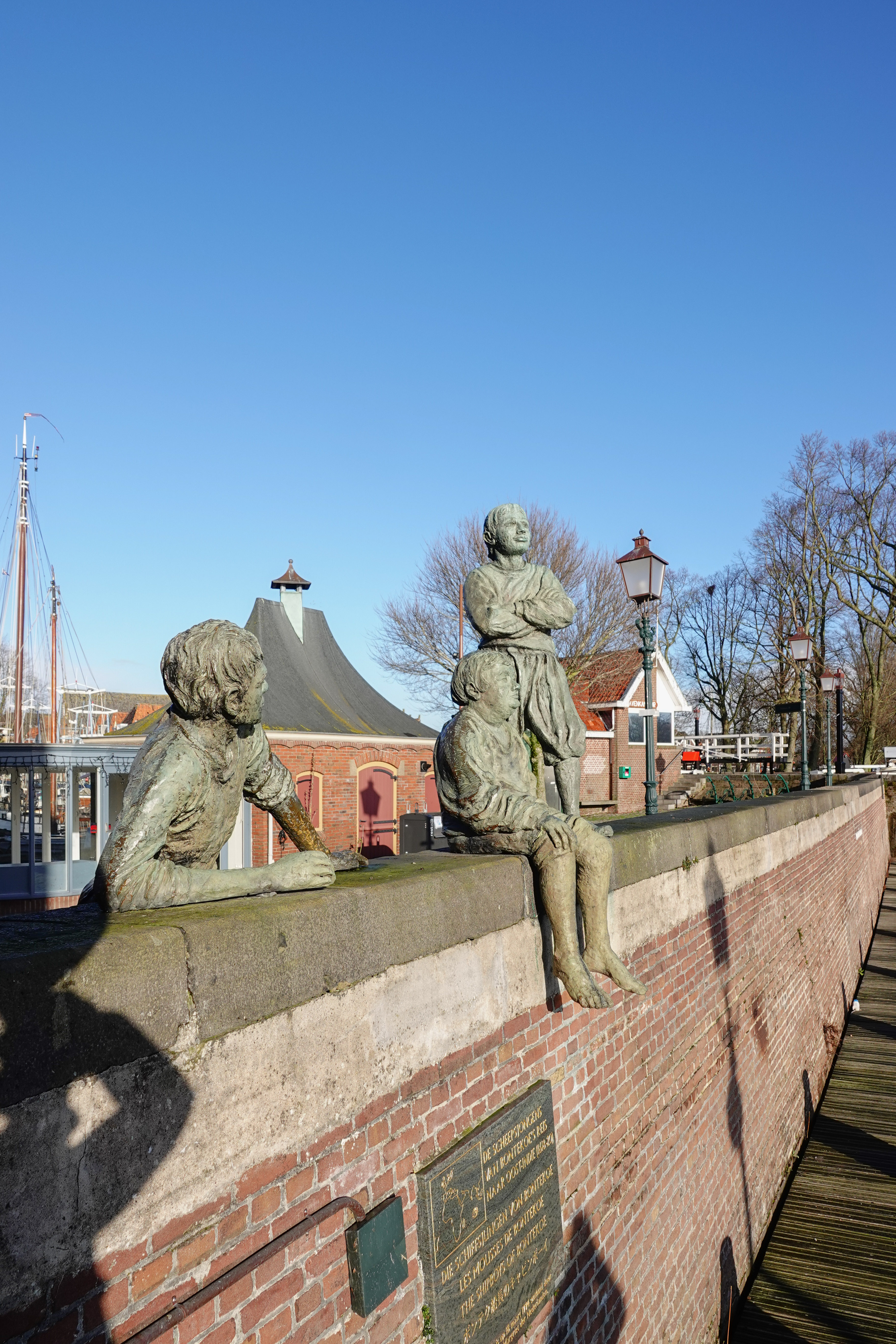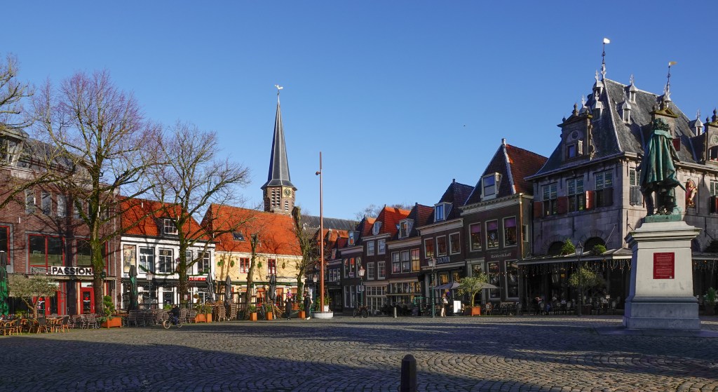 Wat als bedoeling had om een soort van museum te bezoeken werd een stadswandeling. Het museum bleek gesloten maar wij, C , I en ikzelf zaten er niet mee. Het was tenslotte een dag met prachtig weer. De zon scheen overwegend, dus hadden we een goede reden om van dat mooie weer te genieten. Hoorn is een leuke stad en in de zon helemaal prachtig. Ik zal willekeurig wat laten zien. We starten op ‘De Roode Steen’ het stadshart van Hoorn met het bekritiseerde beeld, vanwege het slavernijverleden, van de alhier geboren VOC-gouverneur Jan Pieterszoon Coen,