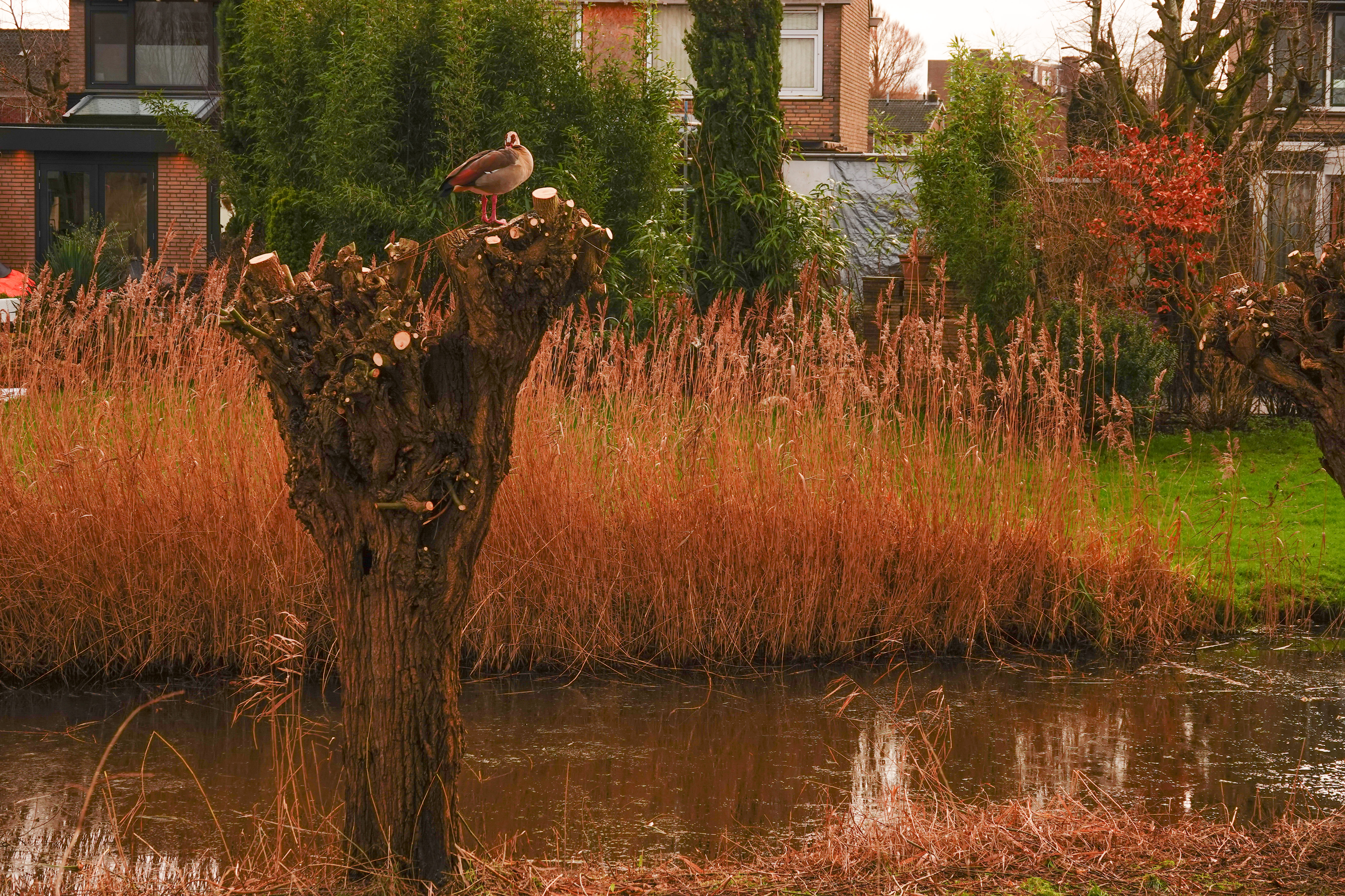 Een koppeltje nijlganzen hadden een net geknotte wilg als zitplaats gekozen.