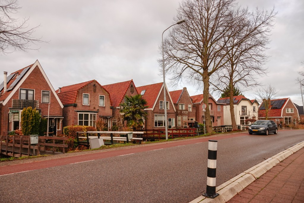 en liepen de Zuidoostbeemster in. Eigenlijk een buitenwijk van Purmerend, maar het ligt in de polder de Beemster. Het is een weg zonder voetpad. Dat loopt wat onrustig voor een groep wandelaars als ons.