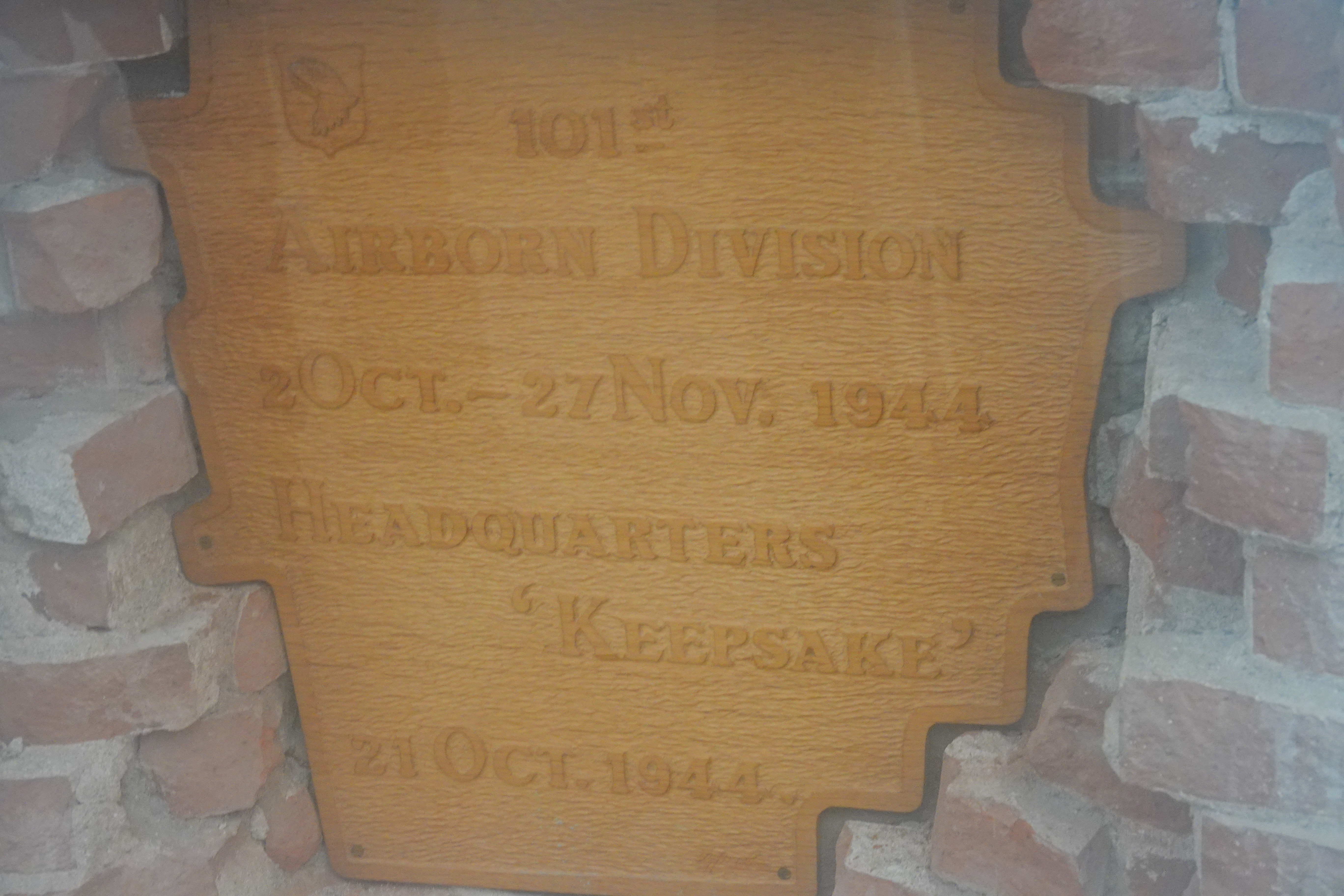 Toevallig kwam er een vuilnisauto aan, die de poort openmaakte en wij glipten mee naar binnen het terrein op. Wij zochten daar een monument van een granaatinslag, dat hier zou zijn volgens ons routeboekje. Tijdens WOII was dit huis het hoofdkwartier van de Amerikaanse 101ste Airborne Divisie.