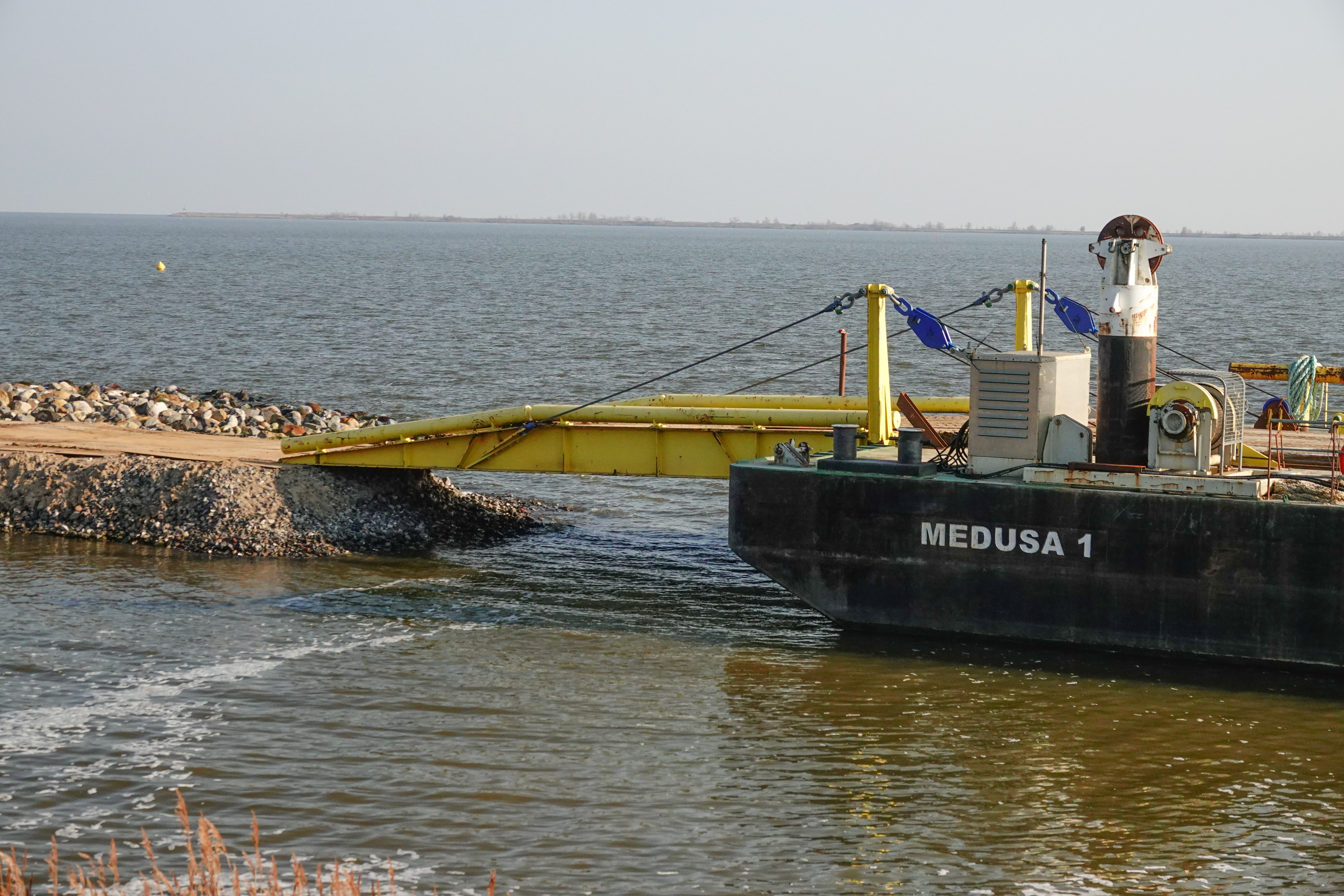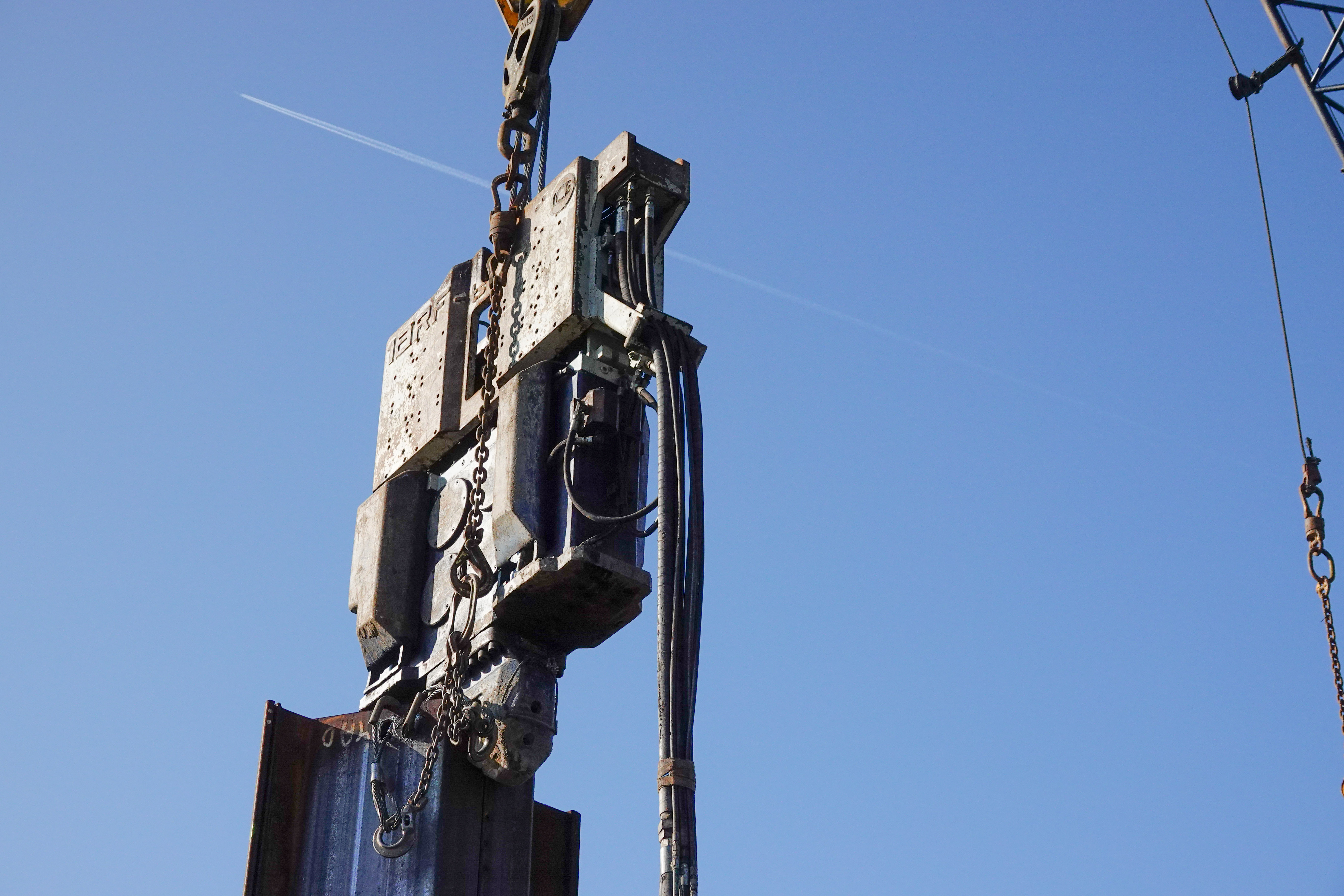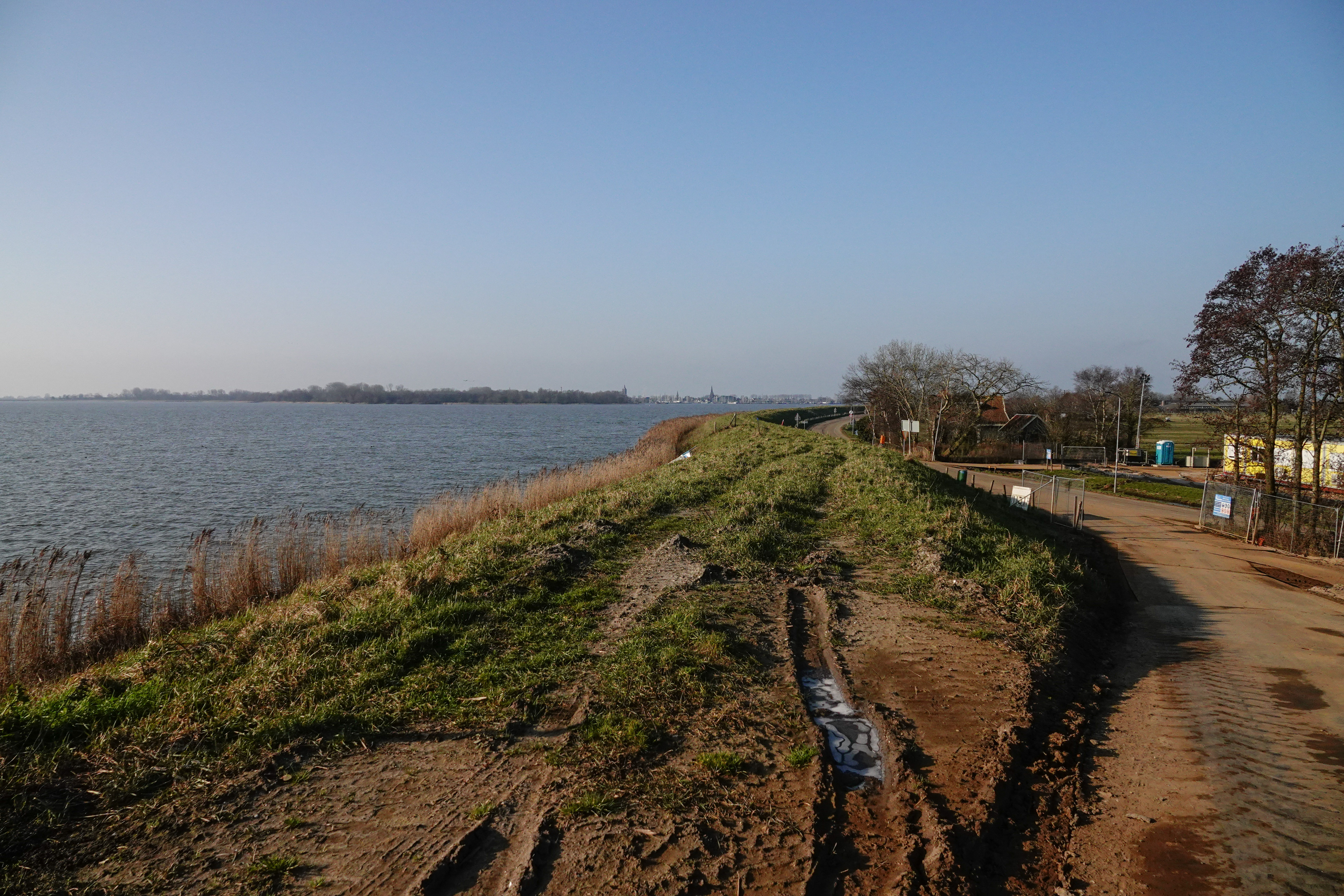 Op de terugweg konden we duidelijk zien hoe de lange platen voor de nieuwe damwand, die de dijk moet gaan verstevigen de grond in werden geheid.