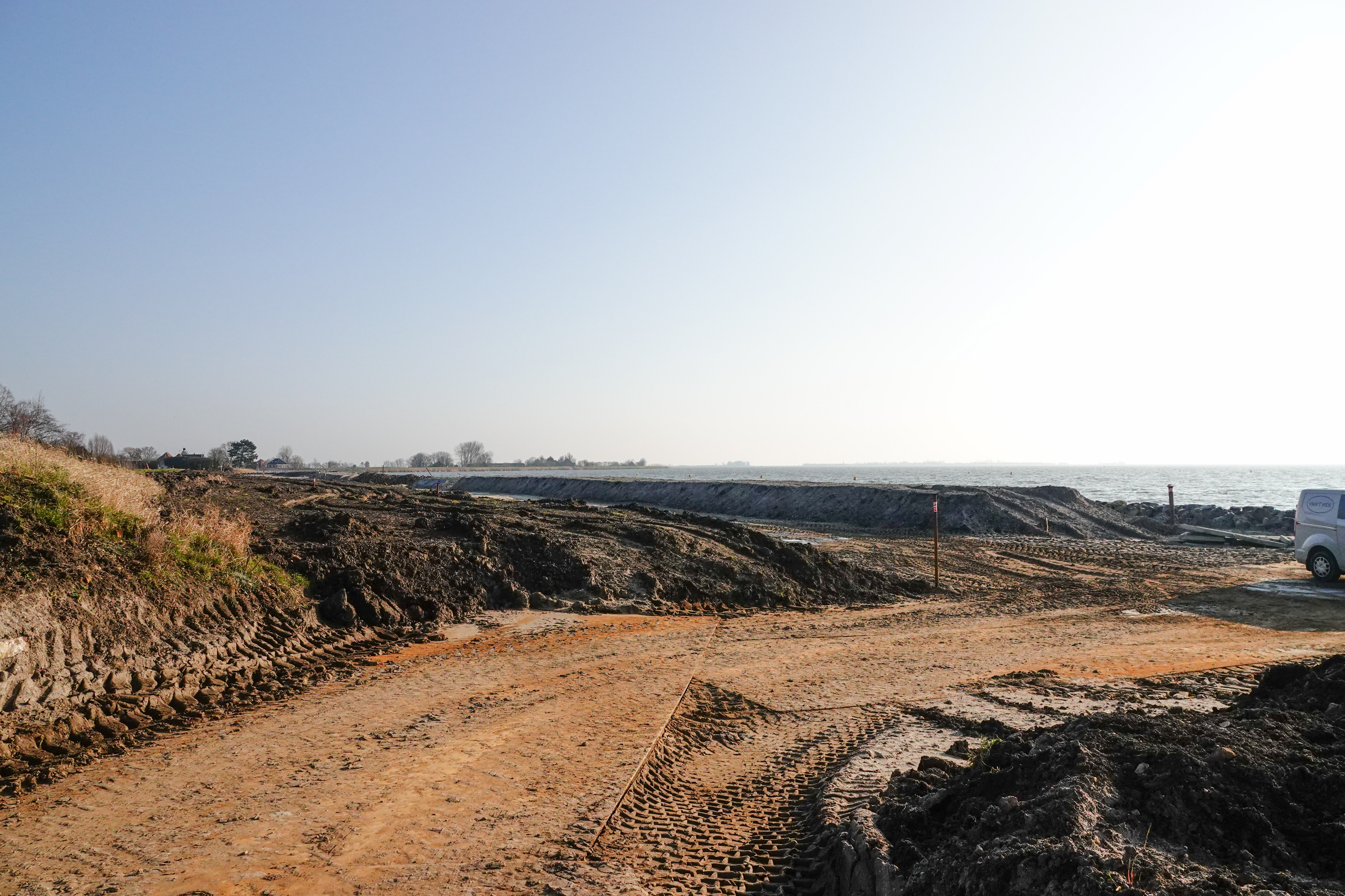 Voor deze klus moet er heel wat grond verplaatst worden. Het lijkt erop of ze de oude dijk afgraven. Dat wat terugkomt moet veel breder en steviger worden.