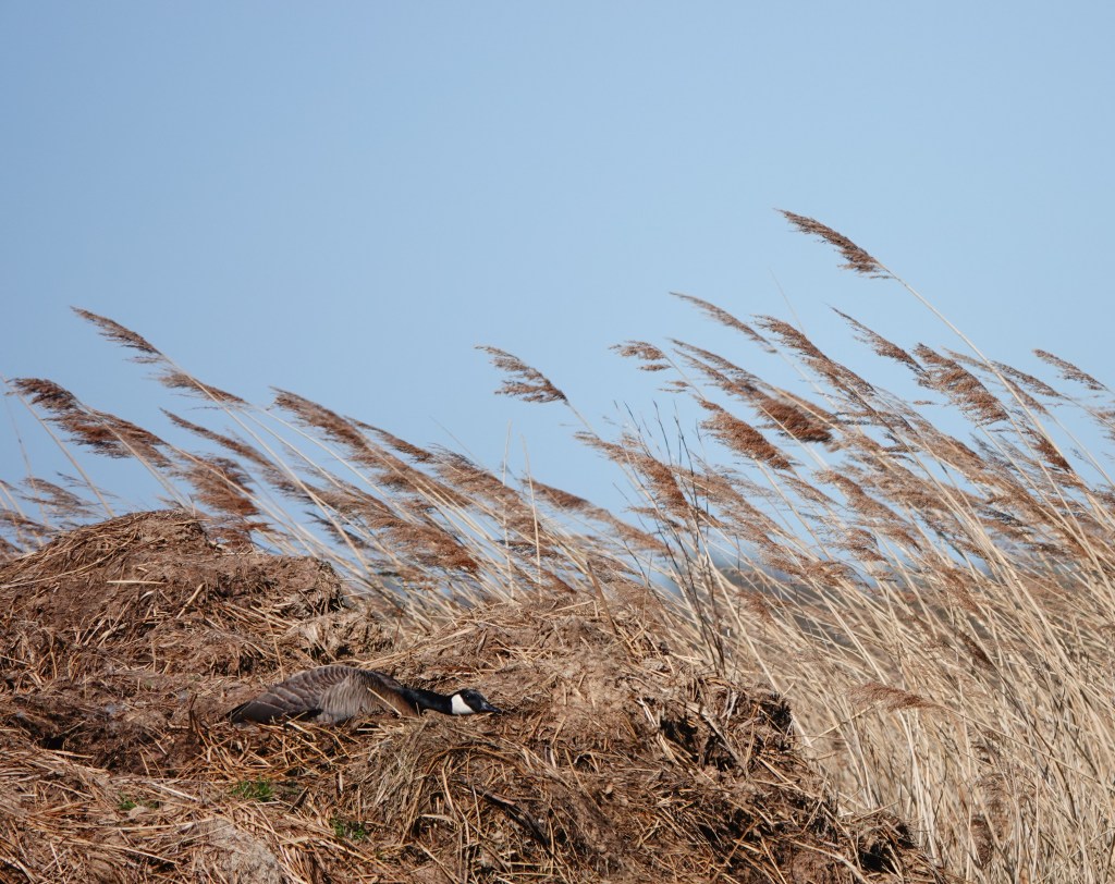 Deze Canadese gans had een aparte nestplek uitgekozen boven op een mestbelt.