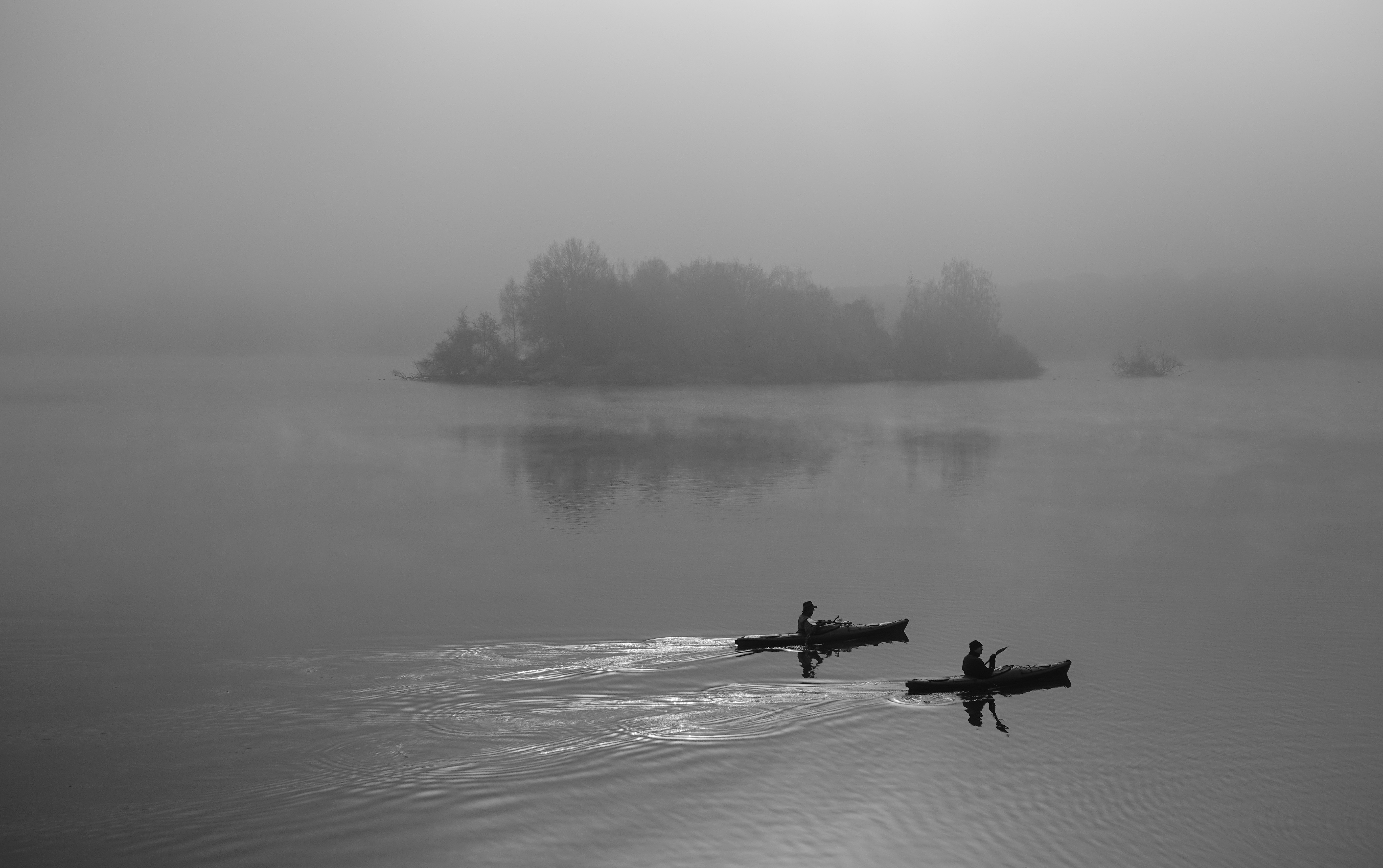 De dag begon met mist. Dat vinden wij hobby-fotografen een leuke uitdaging. We leefden ons uit vanaf het terras van ons ‘huis’ aan het water.