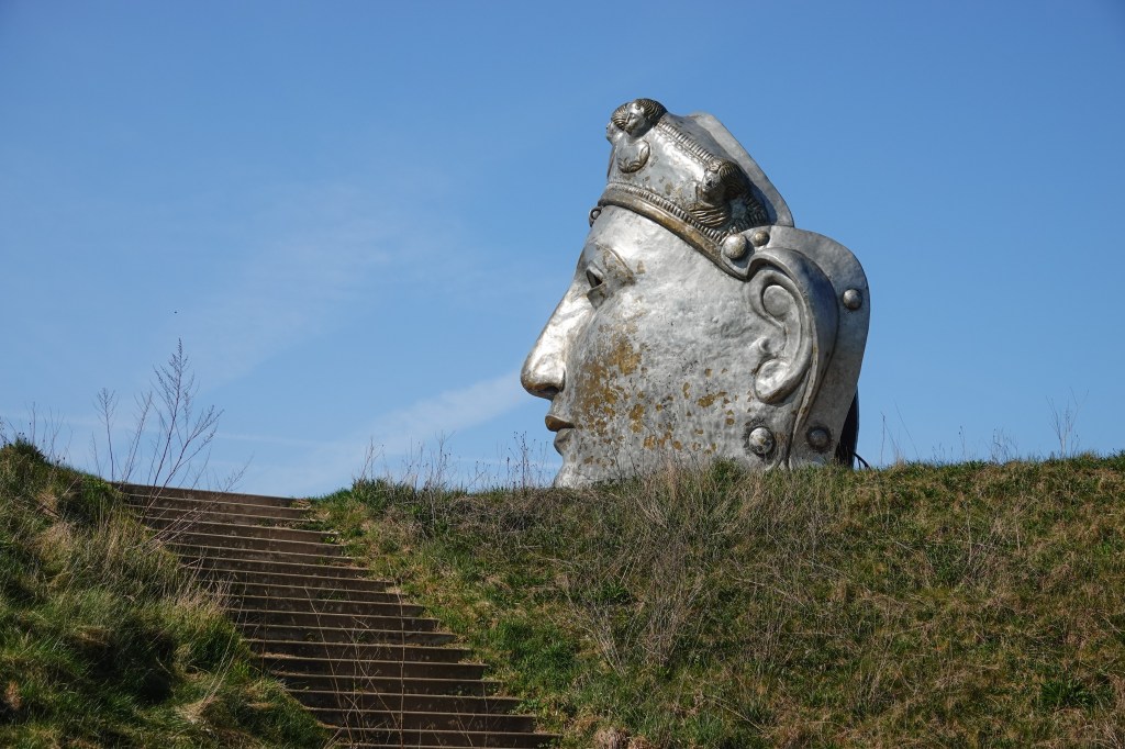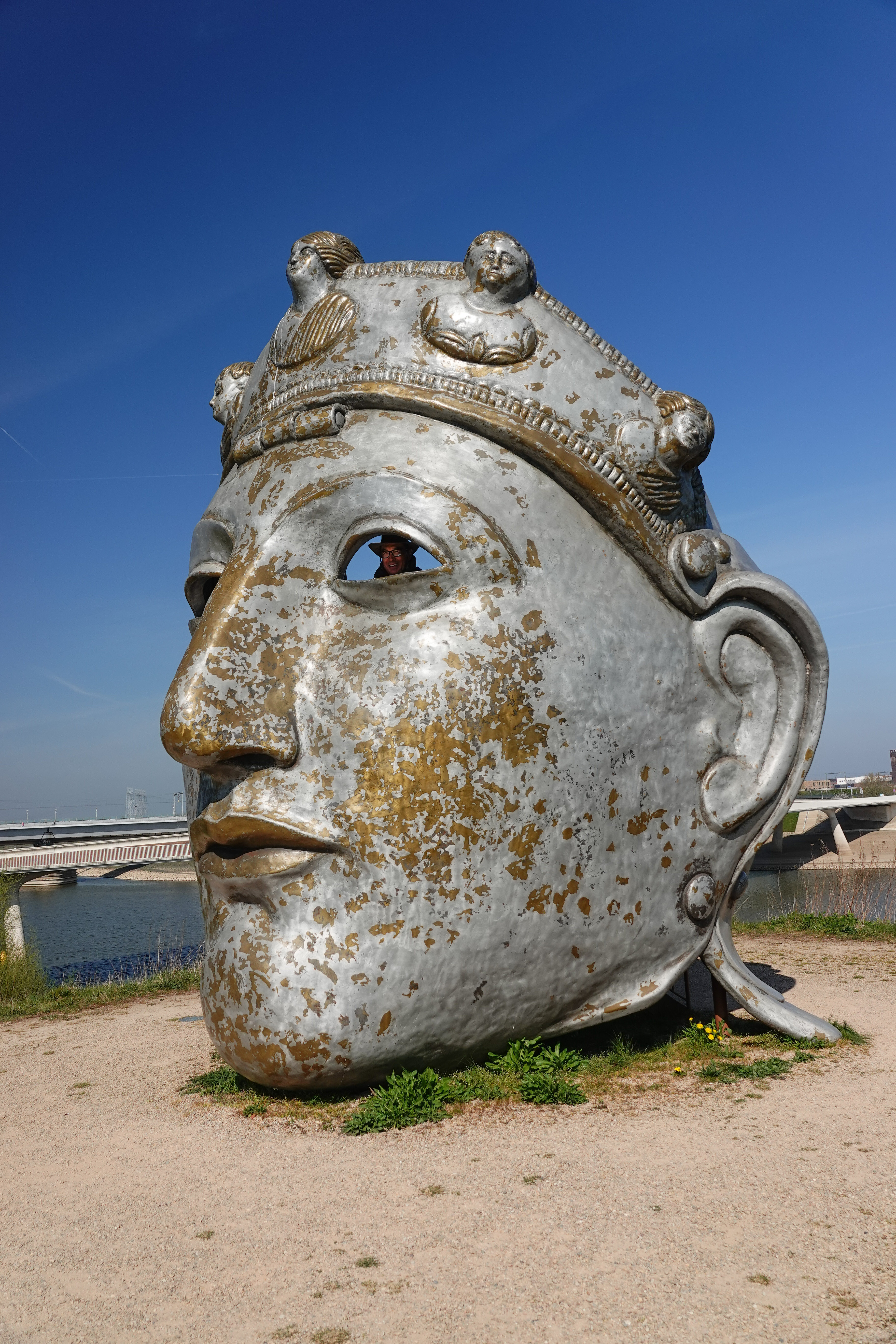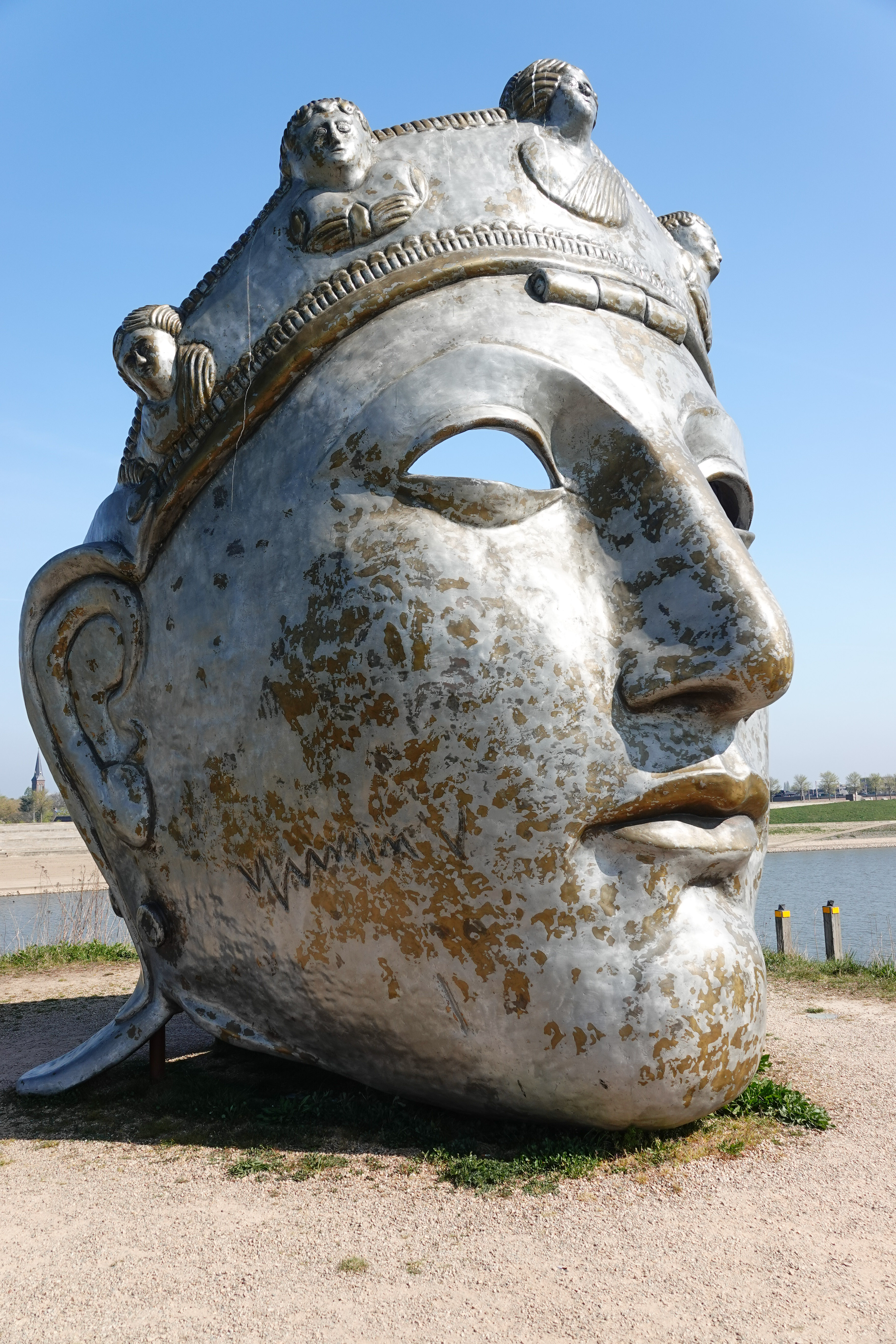 We gingen kijken bij het Gezicht van Nijmegen, gemaakt door kunstenaar Andreas Hetfeld. Het verwijst naar een van de oudste en bekendste bodemvondsten van Nijmegen, een verzilverde gezichtshelm uit het begin van de jaartelling, die te bewonderen is in museum Het Valkhof. Het fraai versierde masker beschermde bijna 2000 jaar geleden het gezicht van een ruiter bij de Romeinen. Kort voor 1915 werd de helm opgebaggerd uit de Waal.