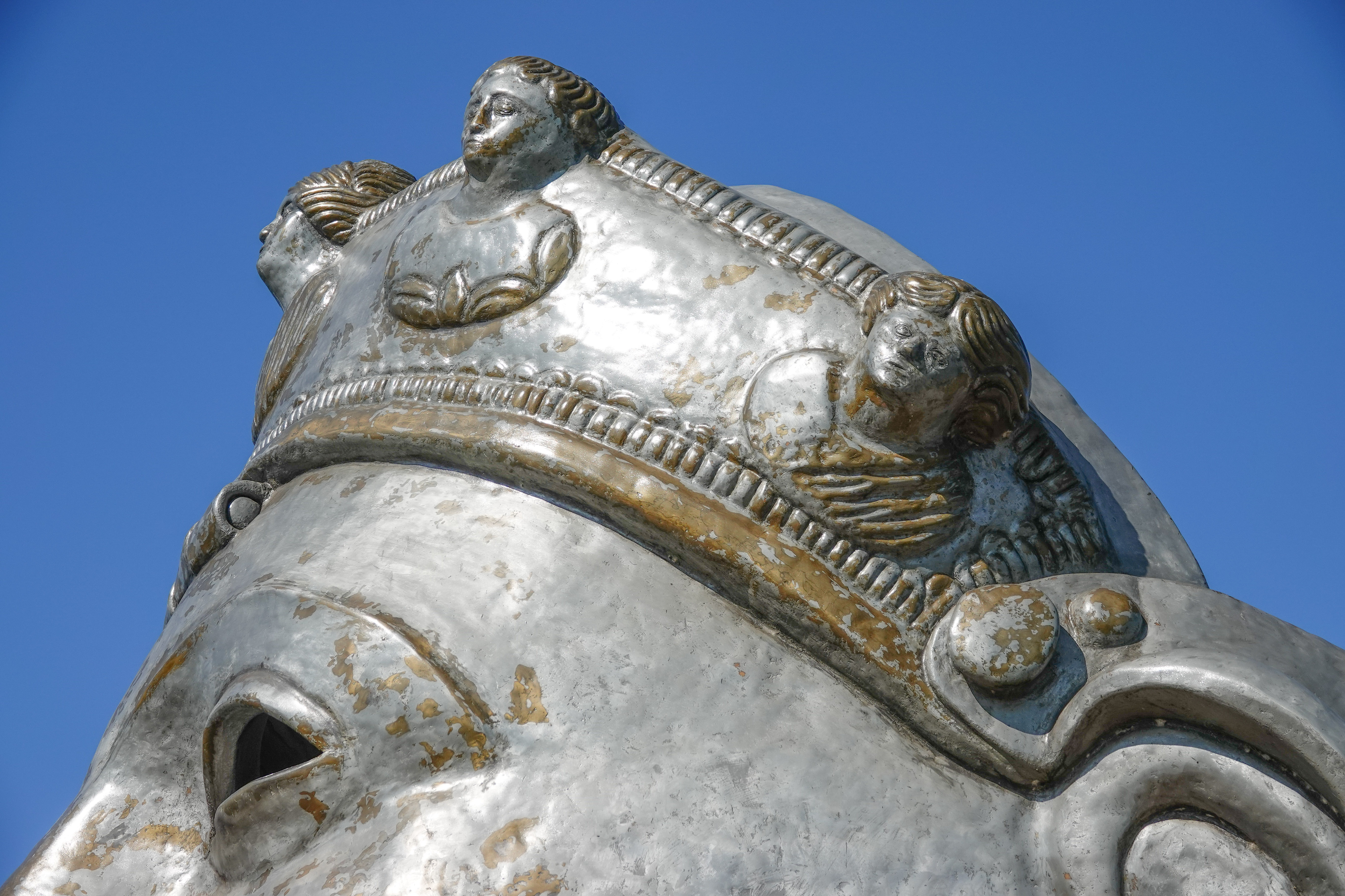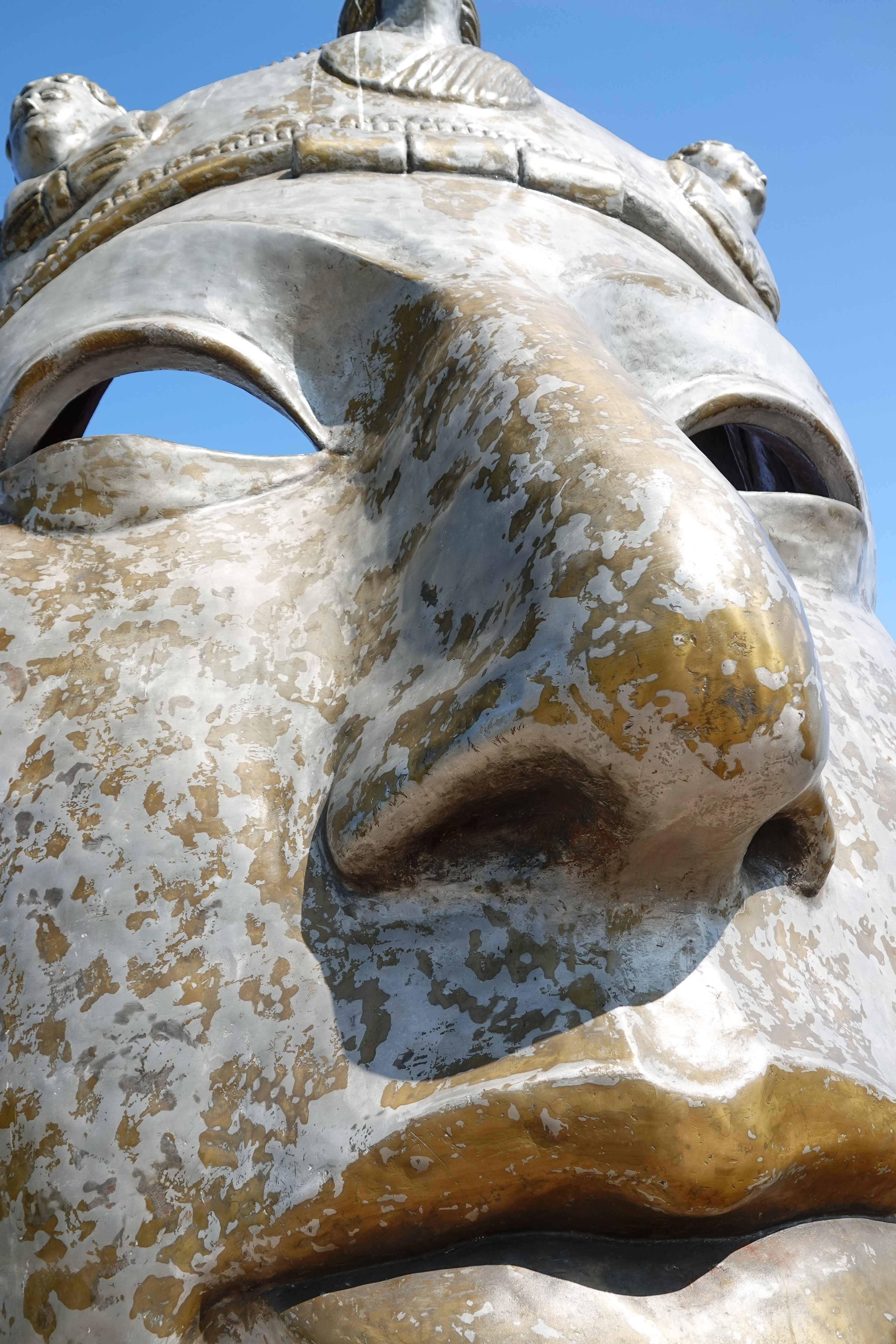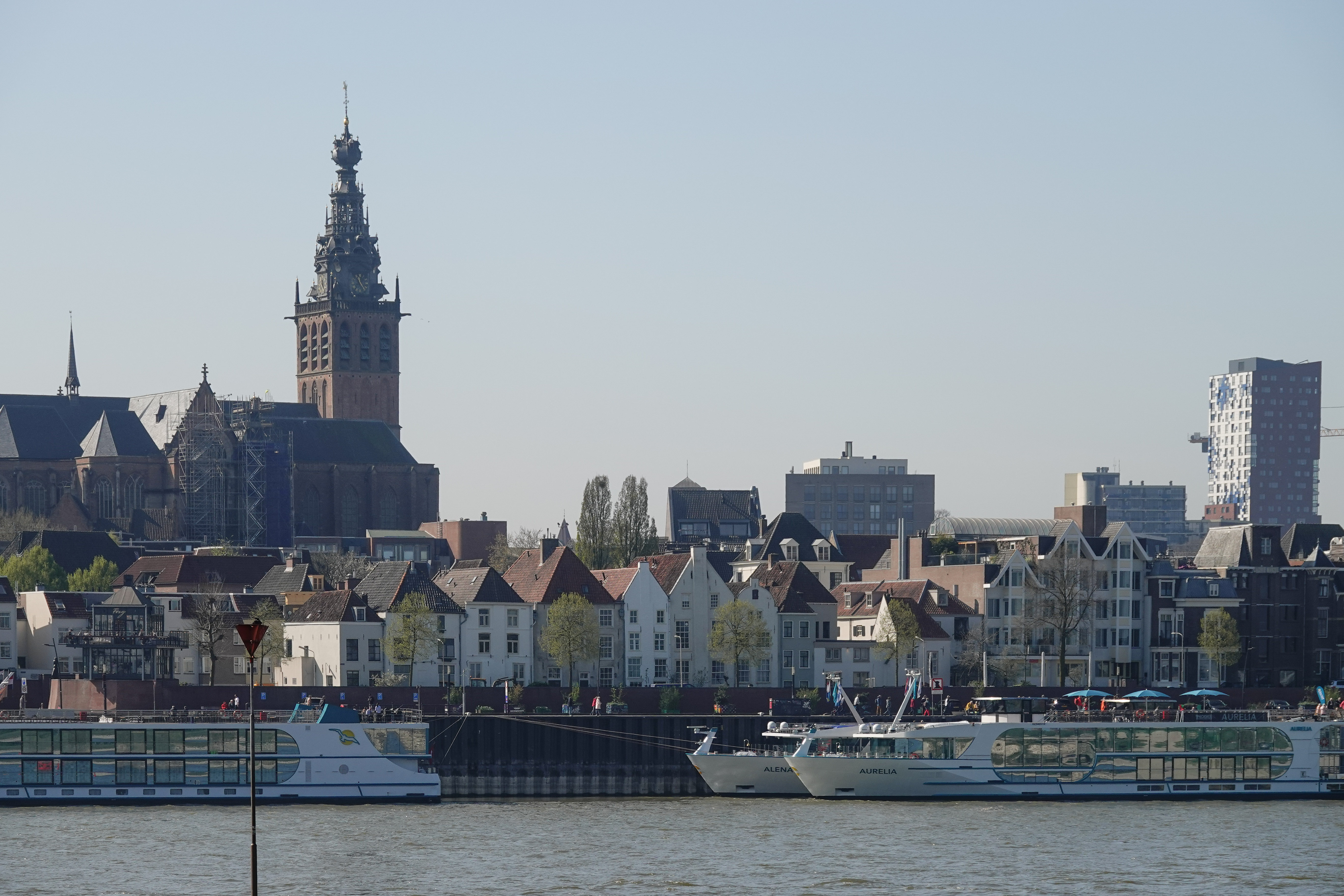 We gingen kijken bij het Gezicht van Nijmegen, gemaakt door kunstenaar Andreas Hetfeld. Het verwijst naar een van de oudste en bekendste bodemvondsten van Nijmegen, een verzilverde gezichtshelm uit het begin van de jaartelling, die te bewonderen is in museum Het Valkhof. Het fraai versierde masker beschermde bijna 2000 jaar geleden het gezicht van een ruiter bij de Romeinen. Kort voor 1915 werd de helm opgebaggerd uit de Waal.