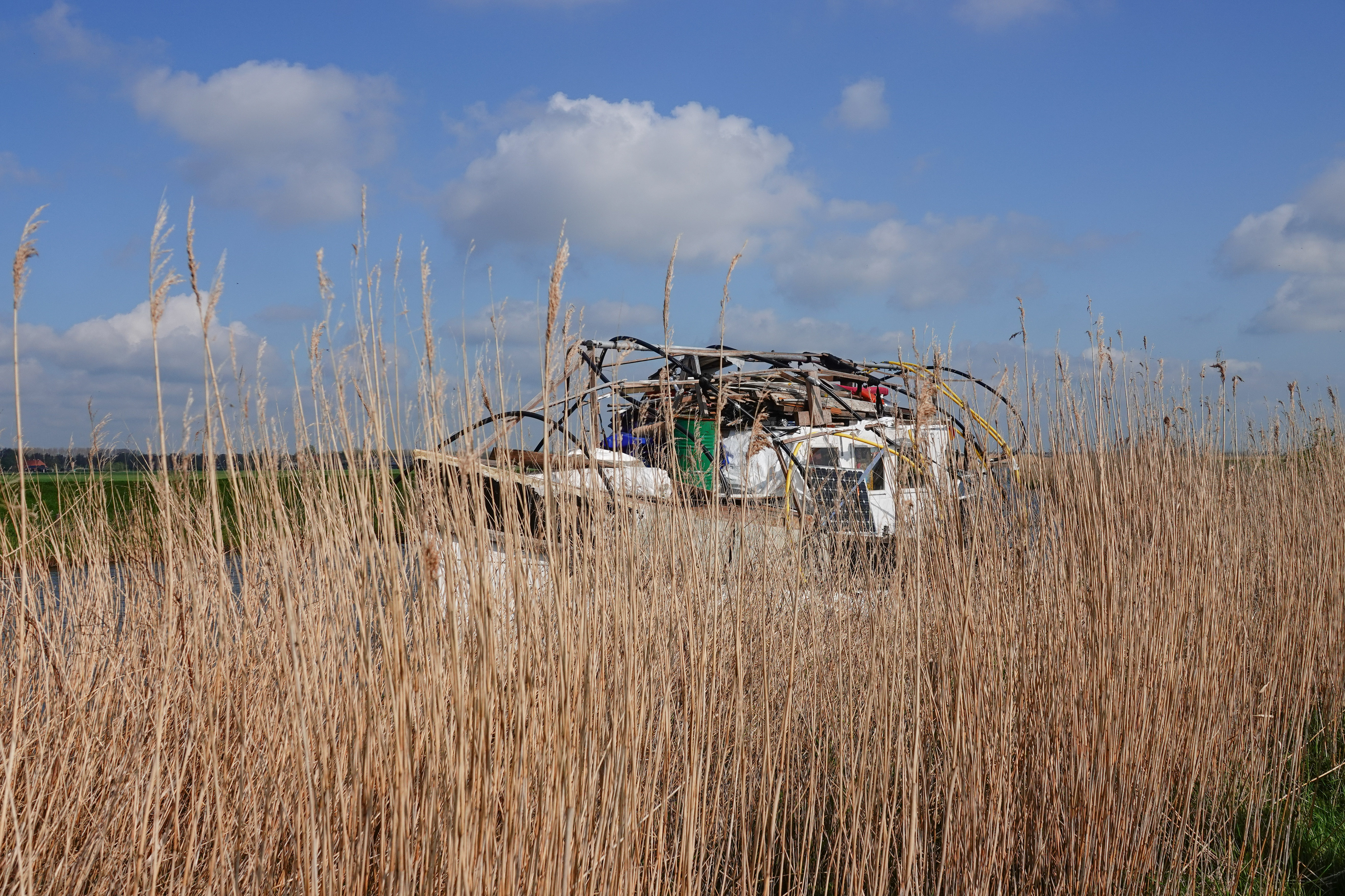 Via een onverhard graspad achter het hek kijken we nog even bij een vreemdsoortige boot, die daar wat verscholen in ‘the middle of nowhere’ ligt.