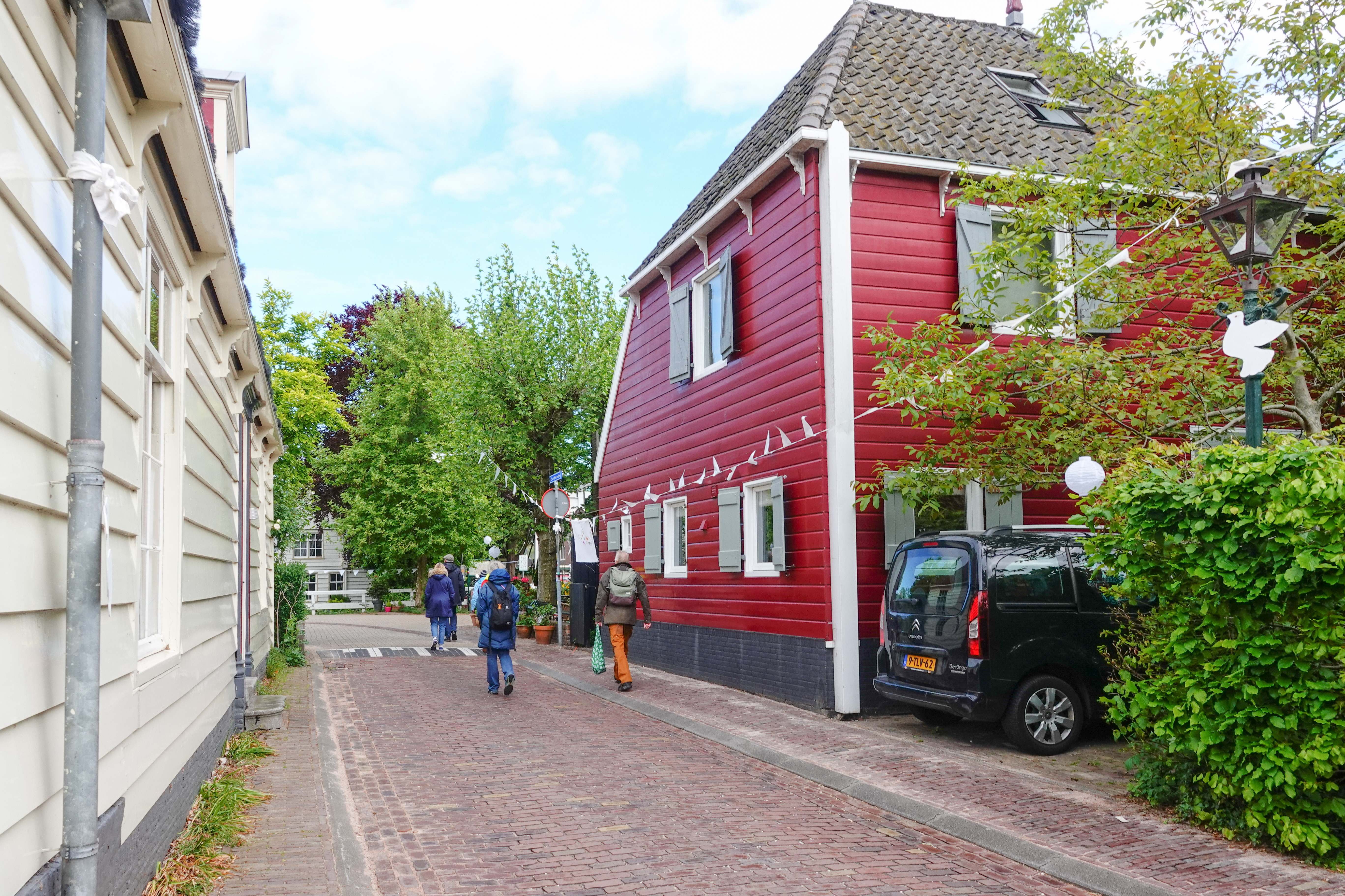 Vanwege Bevrijdingsdag was het Huis aan het Water, de wekelijkse startplek voor onze wandeling, gesloten. M. had daarom met een speldenprik op de kaart bepaald, waar we zouden verzamelen. Het werd een buitenwijk van Broek in Waterland. Vandaaruit staken we het het hele dorp door, ondertussen genietend van de mooie versieringen overal.