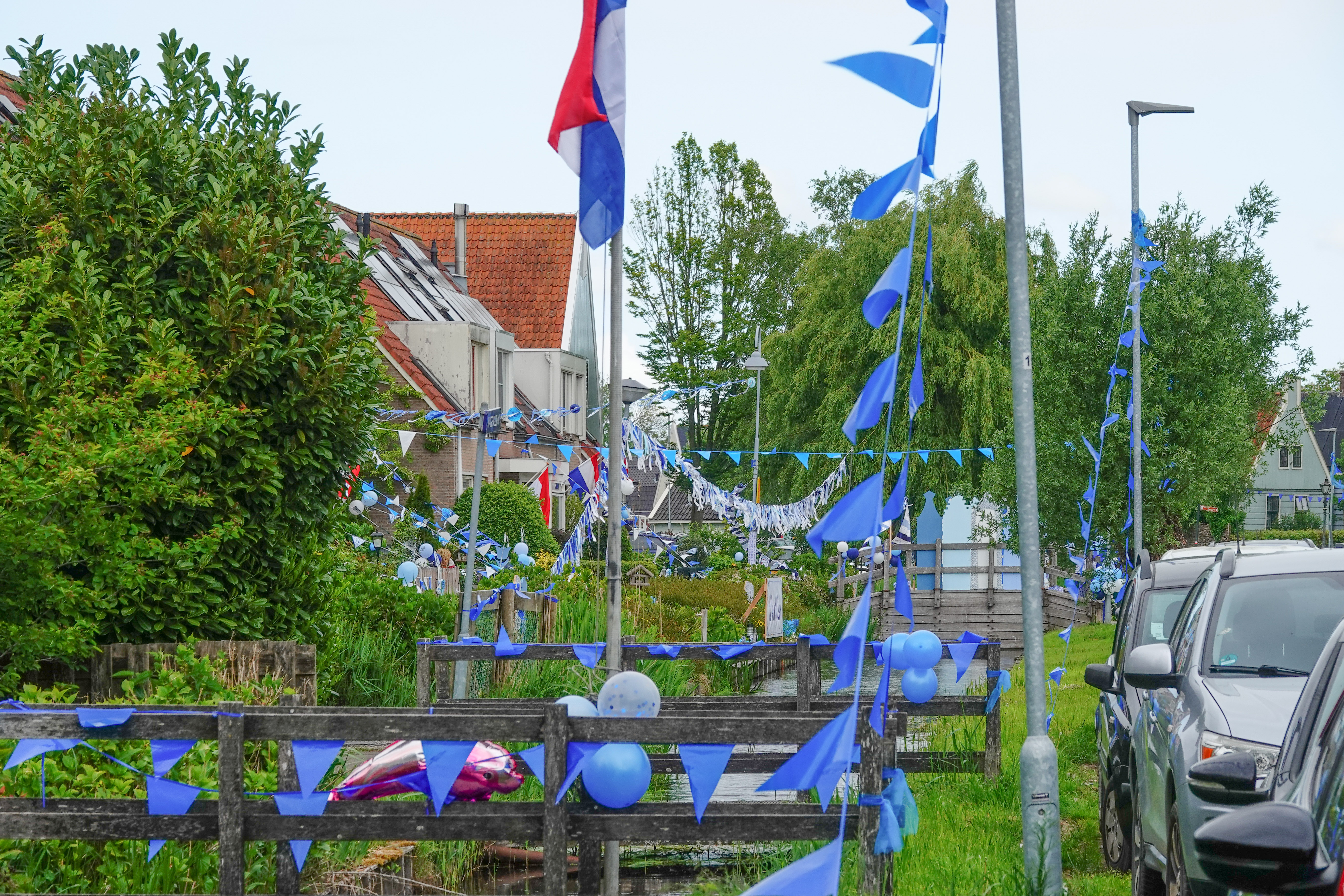 In Broek in Waterland vieren ze om de 5 jaar een week lang de zogenaamde Meifeesten. Nu was het 5 jaar geleden corona, dus was het alweer 10 jaar geleden, dat ze het groots gevierd hebben. Dit jaar kwam er nog eens bij dat het 80 jaar na de bevrijding was, dus ze gingen helemaal los. Het hele dorp was versierd in de kleuren van de Nederlandse vlag. Je had een witte, rode en blauwe wijk. Wij startten met onze wandeling in de blauwe wijk