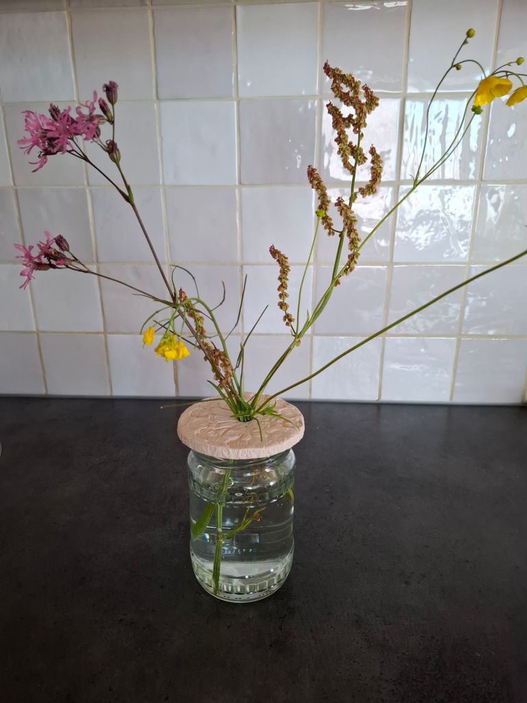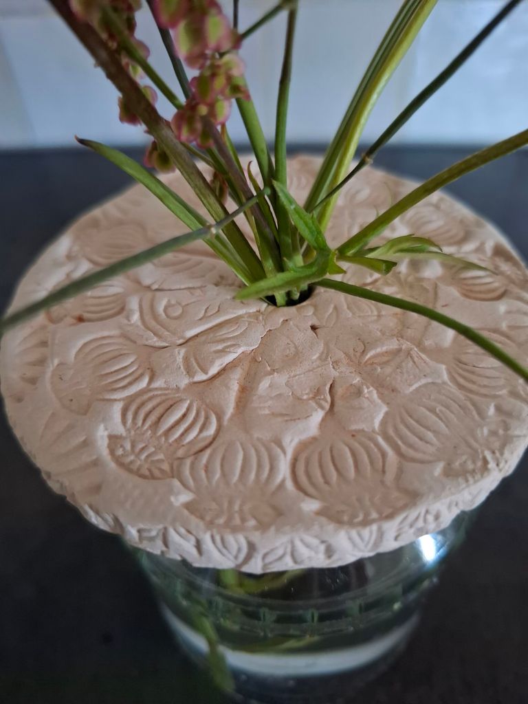 Bij Helen, kunstenares uit het dorp kon je een potje kleien en zen worden. Ook had ze zelf zogenaamde bloemhouders gekleid, waardoor je bloemen leuk kunt decoreren in de vaas.