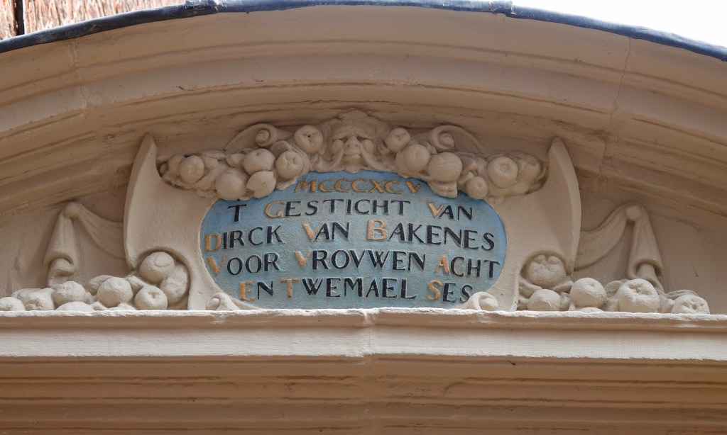 De gevelsteen boven de ingang bevat naast de naam van de stichter nog een bijzonder raadseltje: voor Vrouwen acht en twee mael ses. Je kunt erin lezen, dat er 20 kamers zijn (8 +2 x6), maar ook, dat de leeftijd van de vrouwen 60 jaar is. (8+2×6)