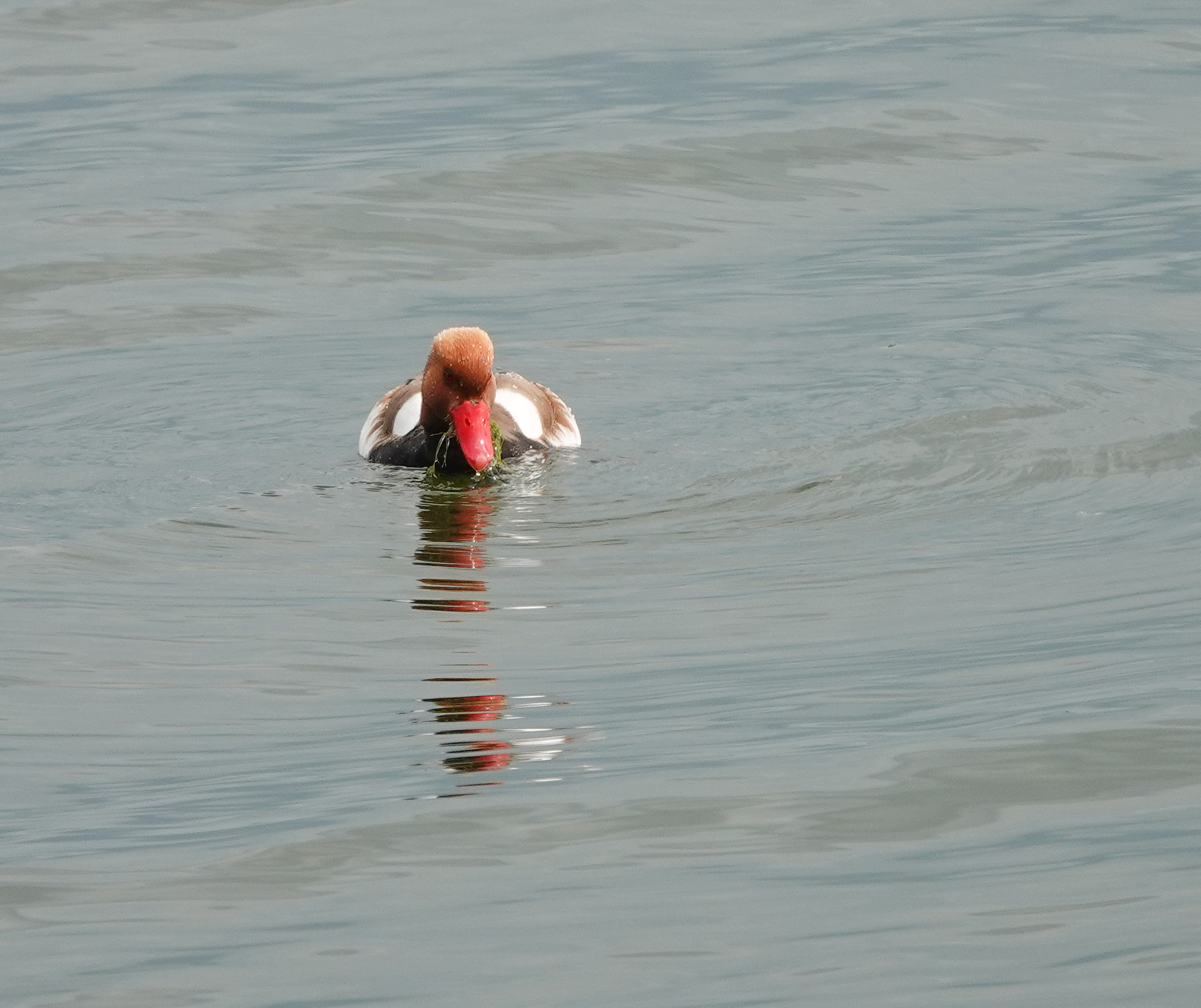 We bewonderden een paar prachtig gekleurde mannetjes-krooneenden. Het vermoeden bestond, dat de vrouwtjes ergens tegen de rand van de dijk zaten te broeden.