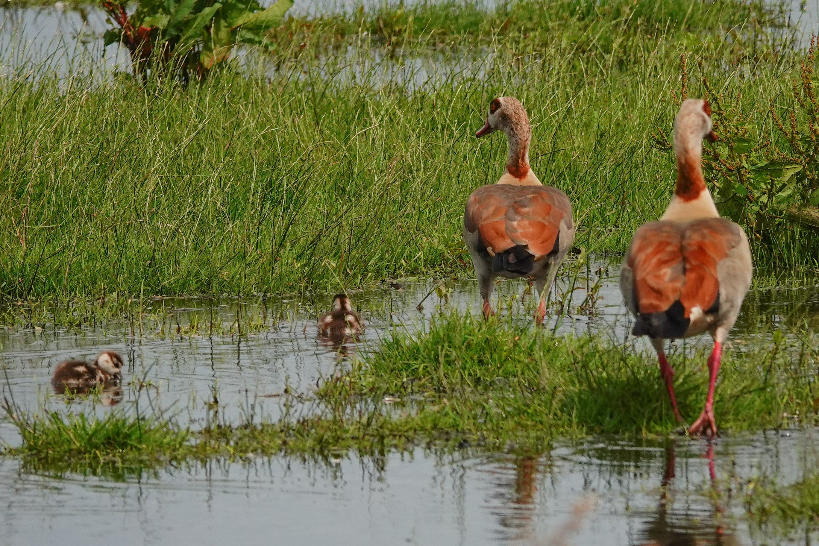Warempel deed het gebied de naam kraamkamer eer aan. Daar liep een trotse familie nijlgans, pa, moe en hun pulletjes.