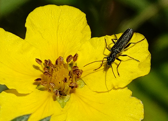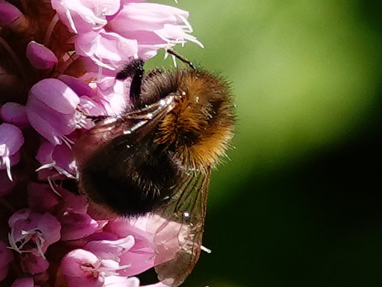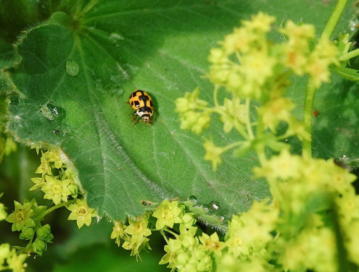 En ik was helemaal overdonderd door de vele insectensoorten, die ik daar in een kwartier tijd zag: helmkruidbladwesp, gewone pendelvlieg, dotterbloemoermot?, akkerhommel en een schaakbordlieveheersbeestje.