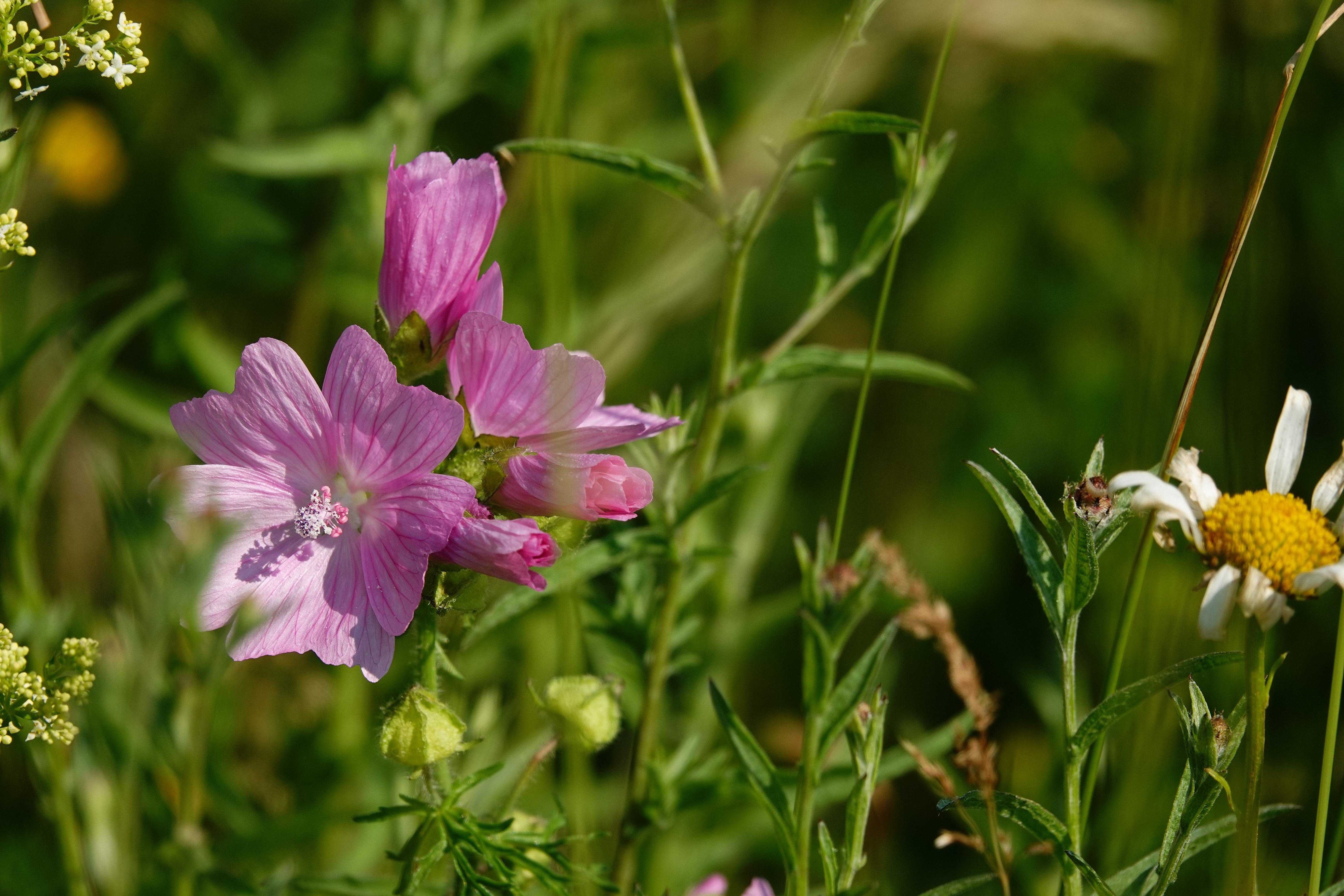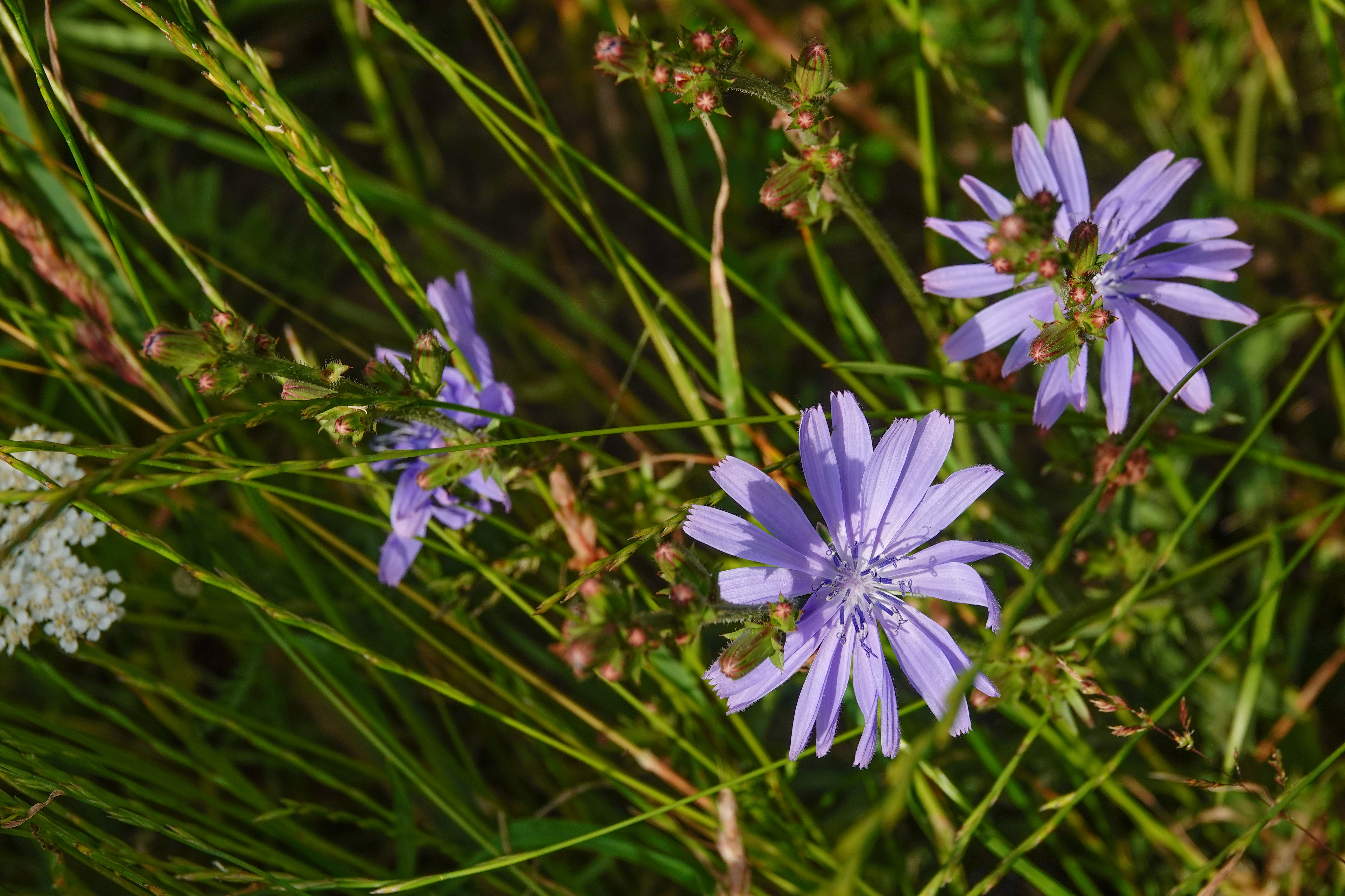 Een paar namen som ik op, maar ik heb helaas niet alles onthouden; chichorei, geel walstro een plant die heerlijk ruikt, margriet, wikkesoort, beemdooievaarsbek, ?, bont kroonkruid, muskuskaasjeskruid, ?. De Volgermeer heeft andere ondergrond dan de omgeving. Dat verklaart de aparte plantengroei. Lees hier maar over de ontstaansgeschiedenis van de polder.