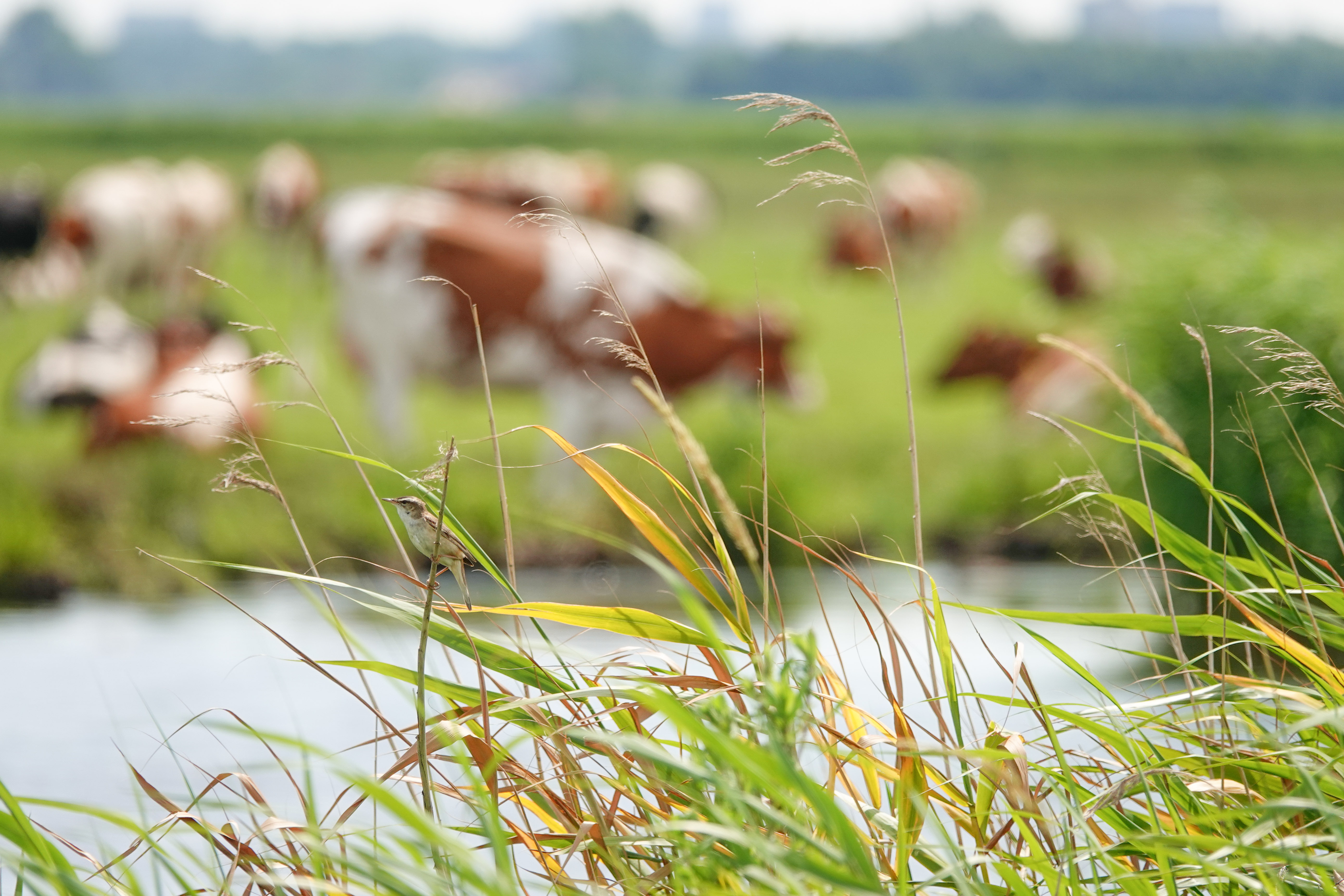 Bij het zien van de orchideeën in de Volgermeer, bedacht ik, dat ik nòg een plek weet, waar orchideeën bloeien en wel aan de overkant van het NH Kanaal. Nu is het tenslotte de tijd van het jaar ervoor. Er moest nog gewandeld worden, dus nam ik de pont. De wind stak op. Dat was lekker, maar bemoeilijkte wel het fotograferen, wat ik natuurlijk niet kan laten. Het werd een extra uitdaging om scherpe foto’s te maken. Dat begon al met de rietzanger, die heerlijk heen en weer zwierde in het riet.