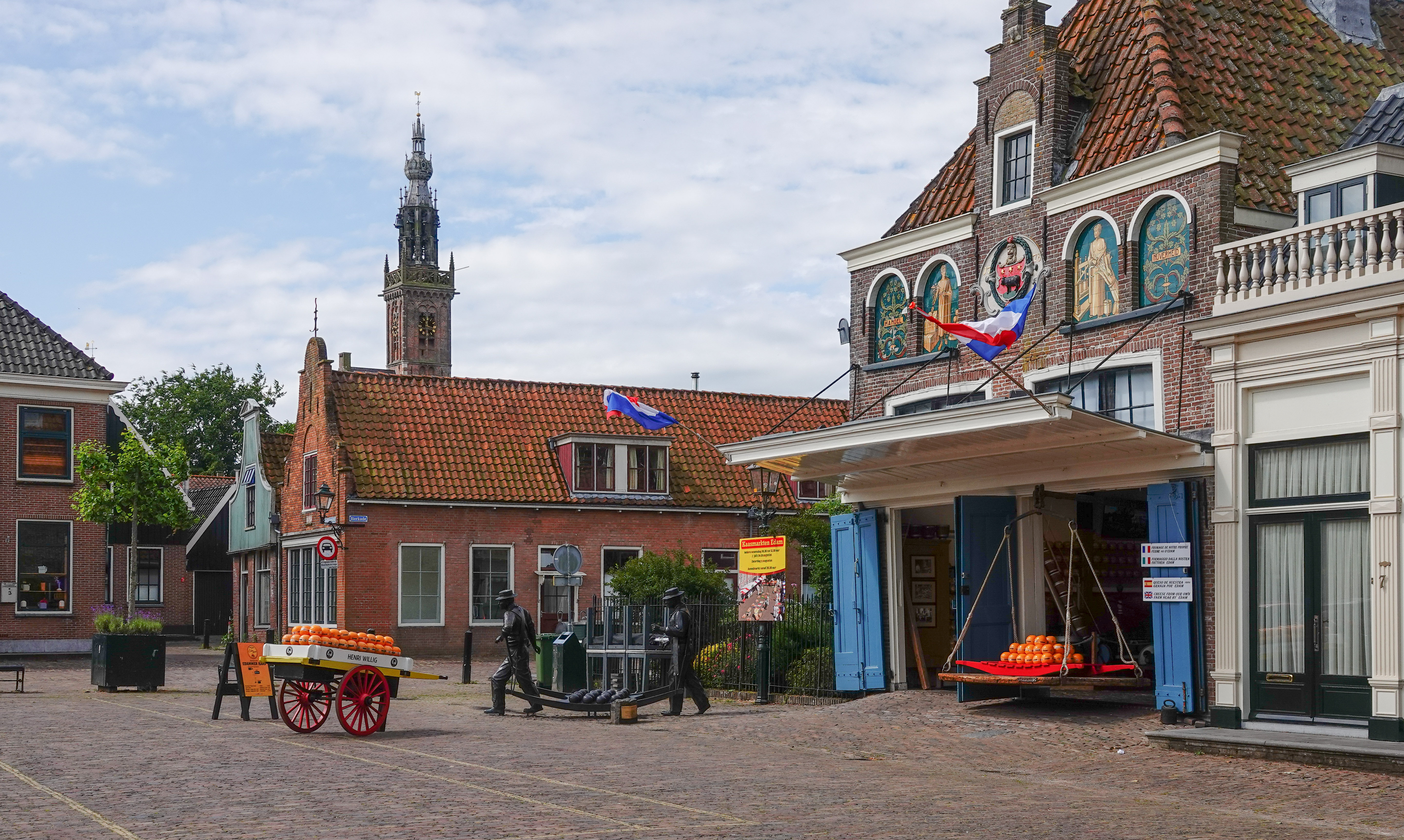 Het was opvallend hoe weinig toeristen er rondliepen in de stad. Blijkbaar is de maandagochtend nog niet zo in trek bij hen. Dat gaf ons de kans om de toerist uit te hangen en even wat toeristische trekpleisters vast te leggen zonder toeristen. De kaasmarkt is zo’n plek. Edam is tenslotte wereldberoemd vanwege de kaas.