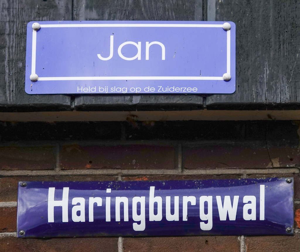 We vervolgden onze route door Monnickendam. Daar wist M nog een anekdote te vertellen op de Haringvlietwal. Tijdens de festiviteiten van het 650 jarig bestaan van de stad, een paar jaar geleden drong door dat de figuur Jan Haring een belangrijke rol heeft vervult in de geschiedenis van de stad. Een naar hem vernoemde straatnaam zou niet misstaan. De gemeente had allerlei bezwaren, waar men niet op wilde wachten. Toen is er een straatnaambordje met de naam ‘Jan’ gekocht en heeft men het eigenhandig opgehangen en daarmee de Jan Haringstraat gecreëerd.