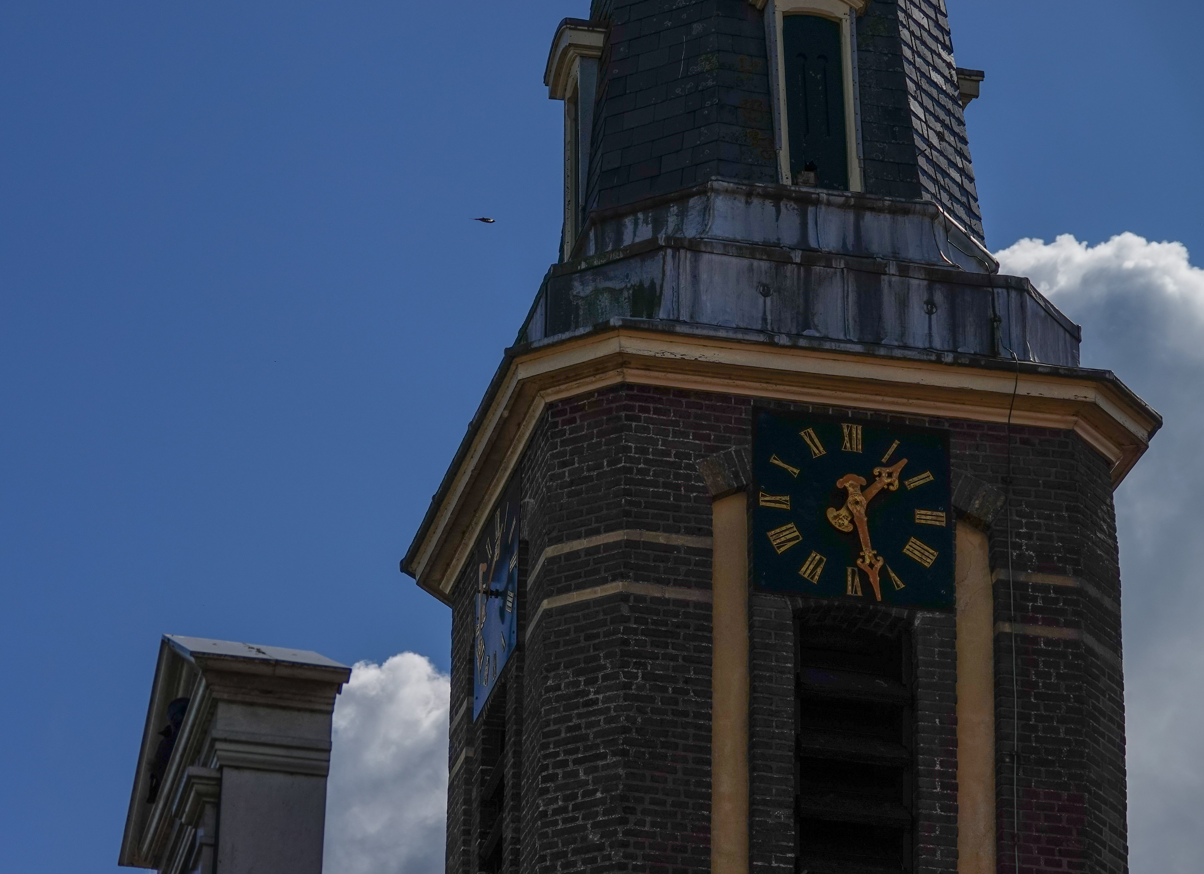 Het zonnetje was dan ook nog zo weldadig en vaak heb ik er deze zomer niet ingezeten. Mijn uitzicht is zoals altijd op de kerktoren. Nu kon ik de kapriolen van een groepje zwaluwen bekijken, mooie wolkenluchten