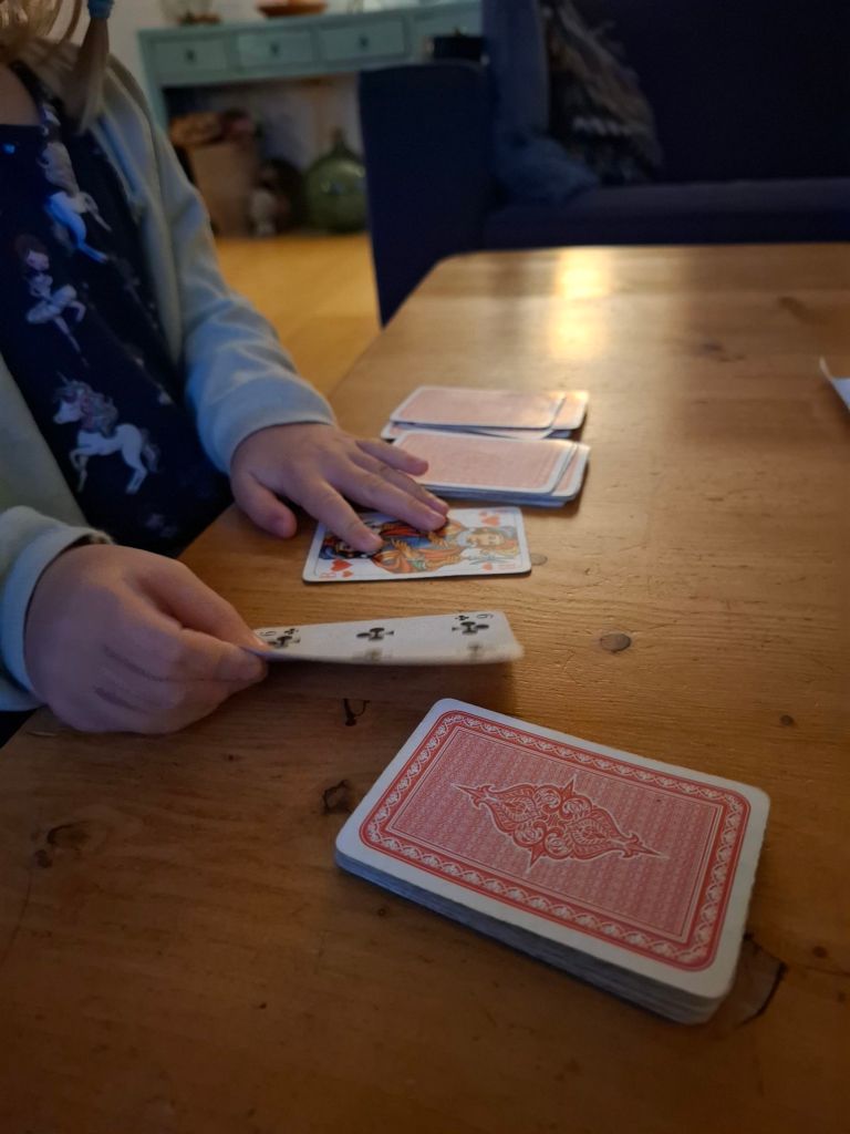 Knutselen, kaarten en naar het café. Je zou niet denken, dat het alle drie bezigheden zijn geweest, die ik samen met mijn kleindochter van vijf deed. Knutselen ligt wel voor de hand. Als ex schooljuf schud ik makkelijk iets uit mijn mouw. Fien vraagt erom en doet het enorm graag, dus ontstonden er vandaag poppetjes van muizentrappetjes.