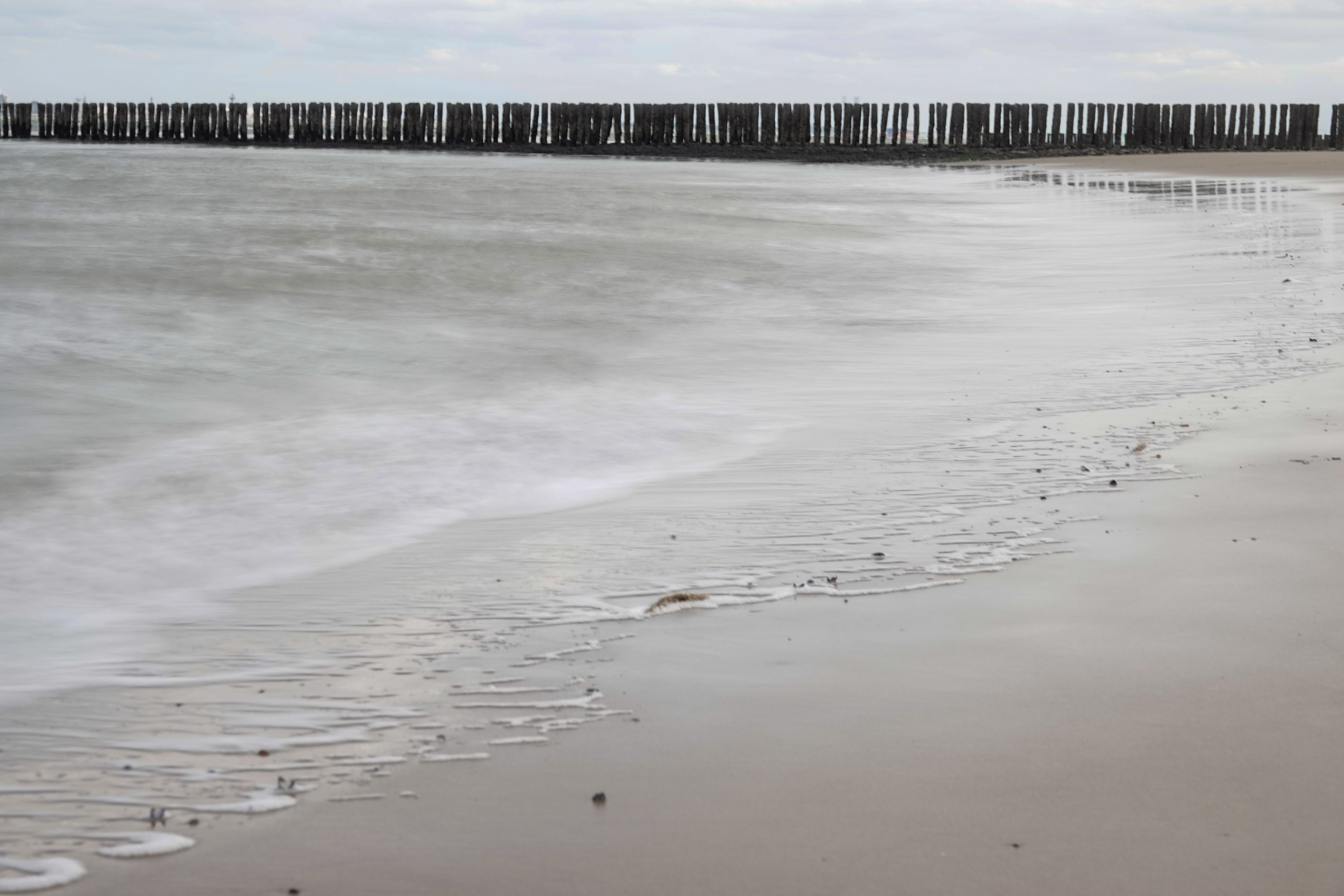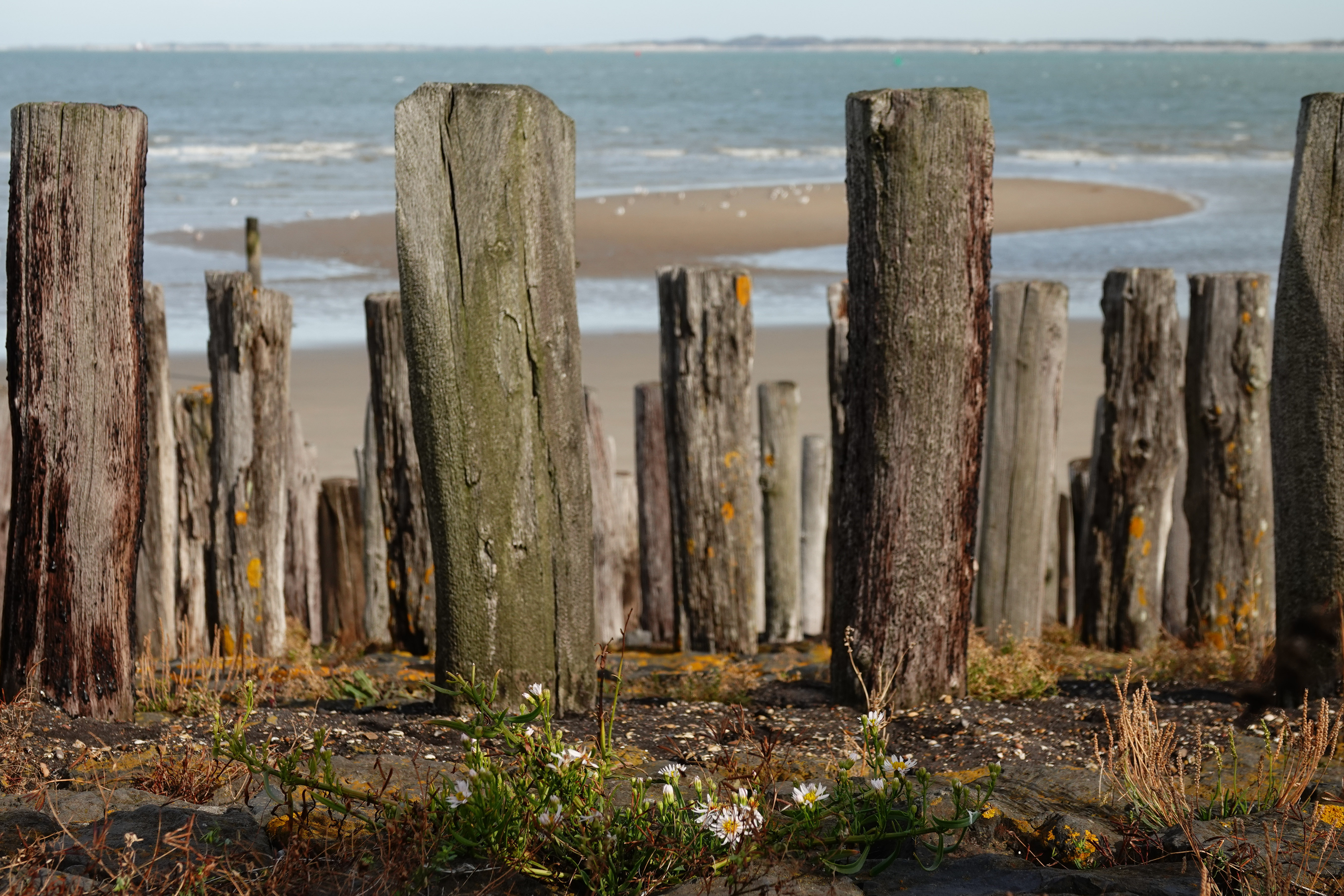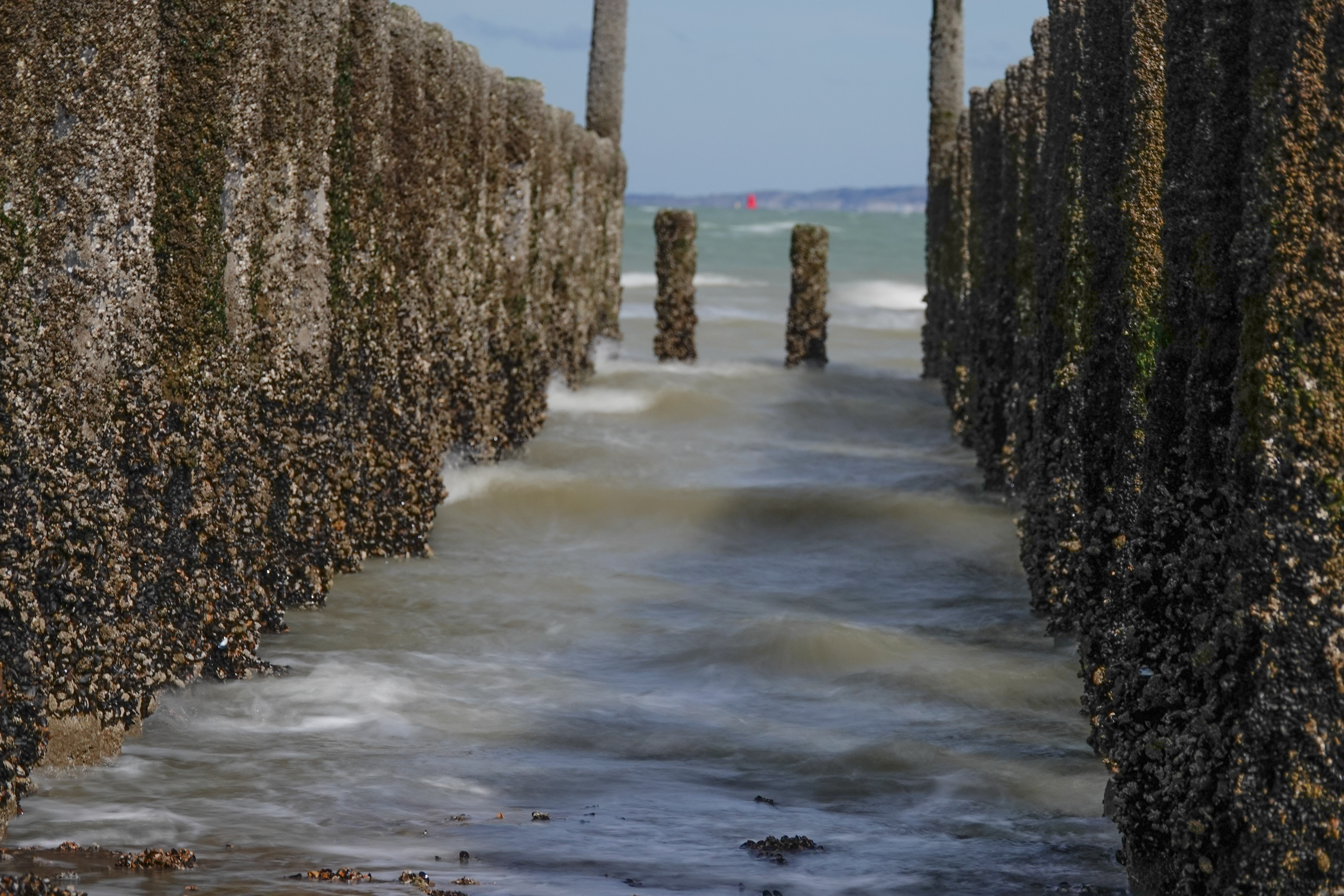De palen nodigden uit om te spelen met lange sluitertijden. Als je je sluitertijd op je fototoestel lang maakt krijg je verstilling van het water, een extra bijzonder effect als er een flinke golfslag is. Ik vond dat erg moeilijk om te doen. Ik heb een paar resultaten.