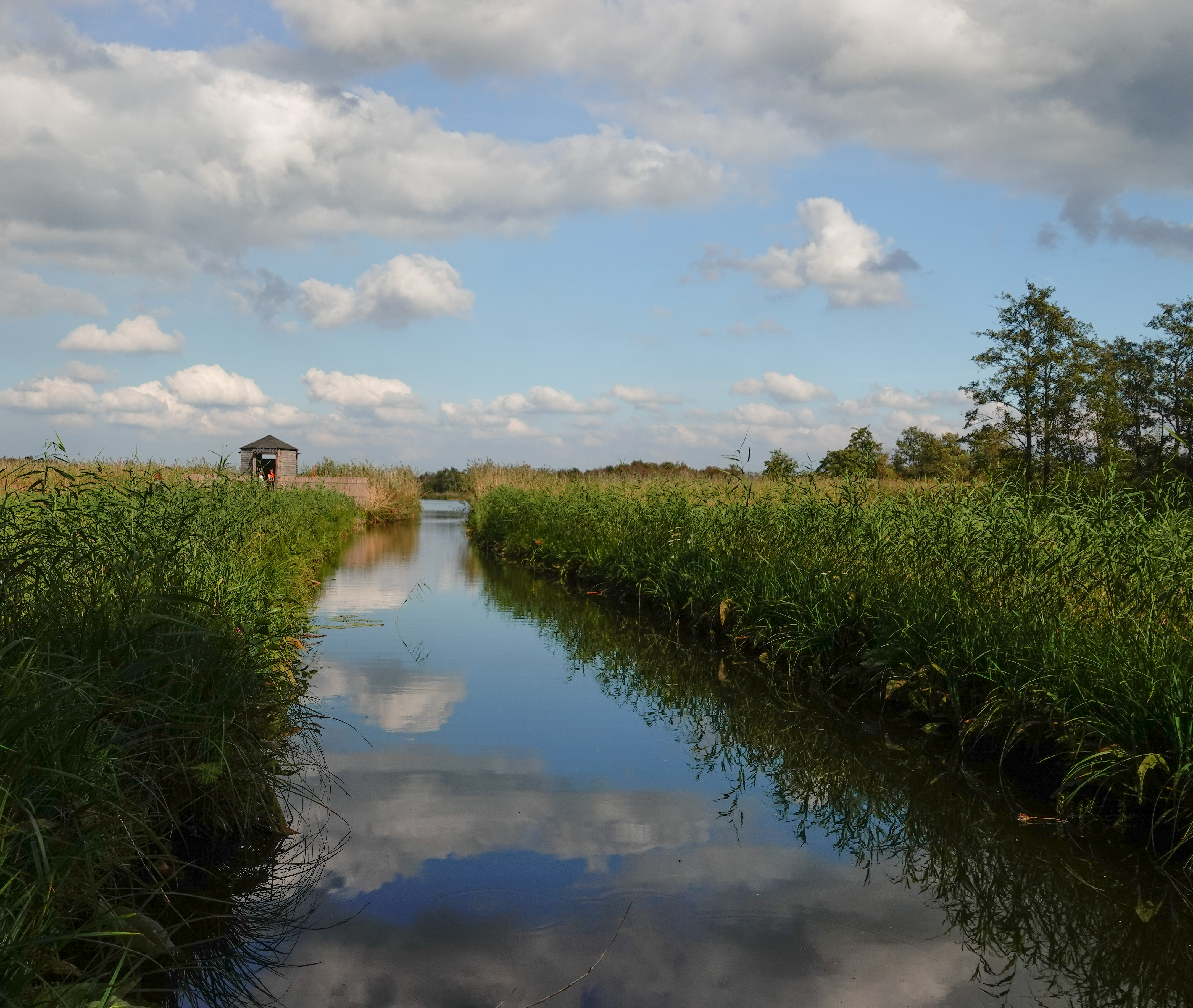 We liepen tot aan de vogelhut aan het Naardermeer. Het uitzicht daar was teleurstellend. Het riet was te hoog. Geen vogel te bekennen. Maar de wolkenluchten maakten veel goed.