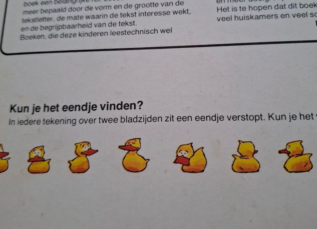 We zullen al wat eendjes gezocht hebben, toen ook al. Ook dochter en kleindochter hebben hun speurzin met dit boek ontwikkeld. En nu gaan we weer vrolijk verder en is het de beurt van mijn kleinzoon. Het boek hangt nog slechts met dunne draadjes aan elkaar. Je kunt wel zeggen, dat dit exemplaar stuk gelezen is en zijn geld heeft opgebracht.