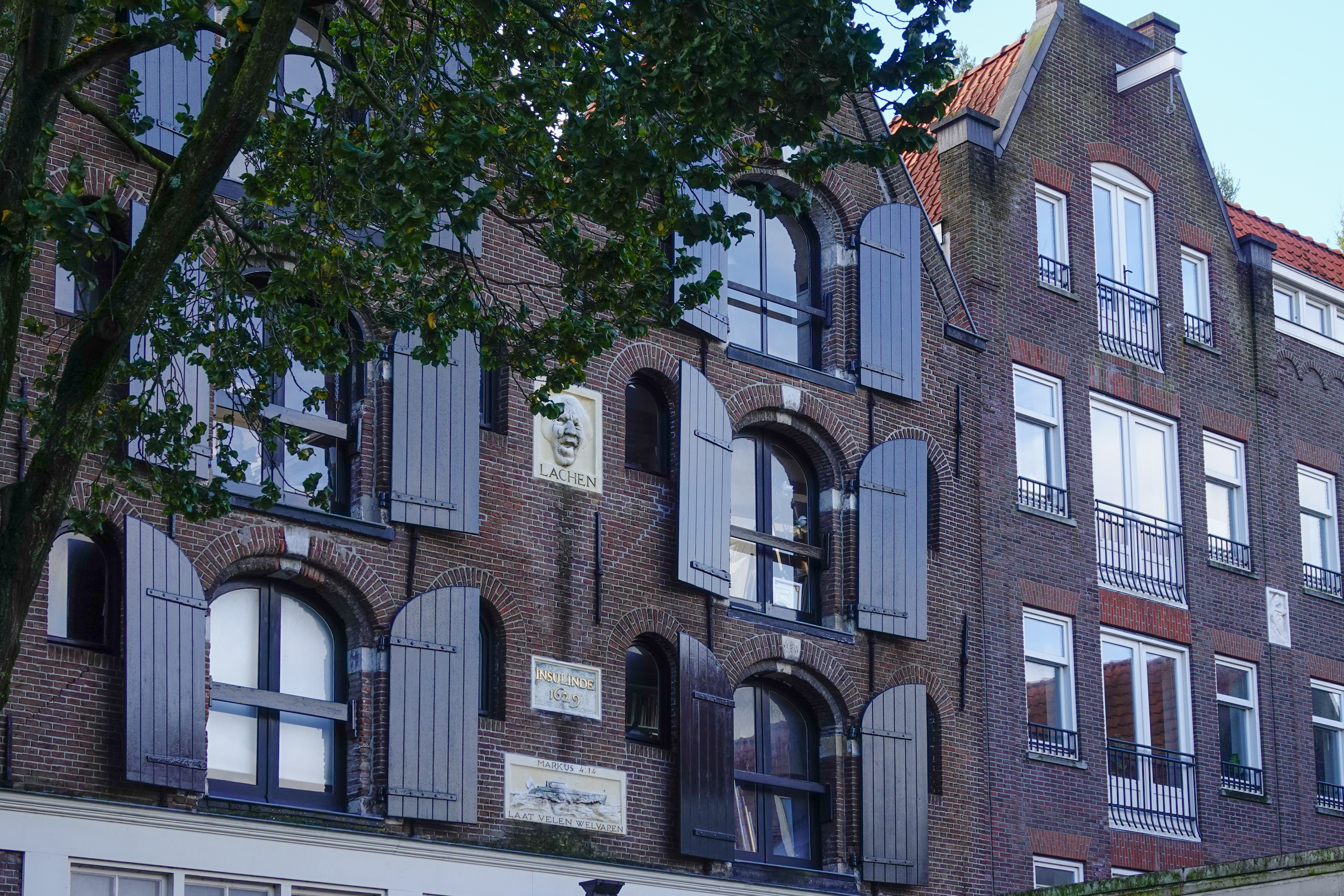 In één ervan woont Ans Markus, beroemd kunstenaar. Haar pakhuis is al uit 1629, getuige een gevelsteen. Nog twee gevelstenen vertellen een verhaal over haar. In haar atelier, dat gesloten was, gluurden we even naar binnen,