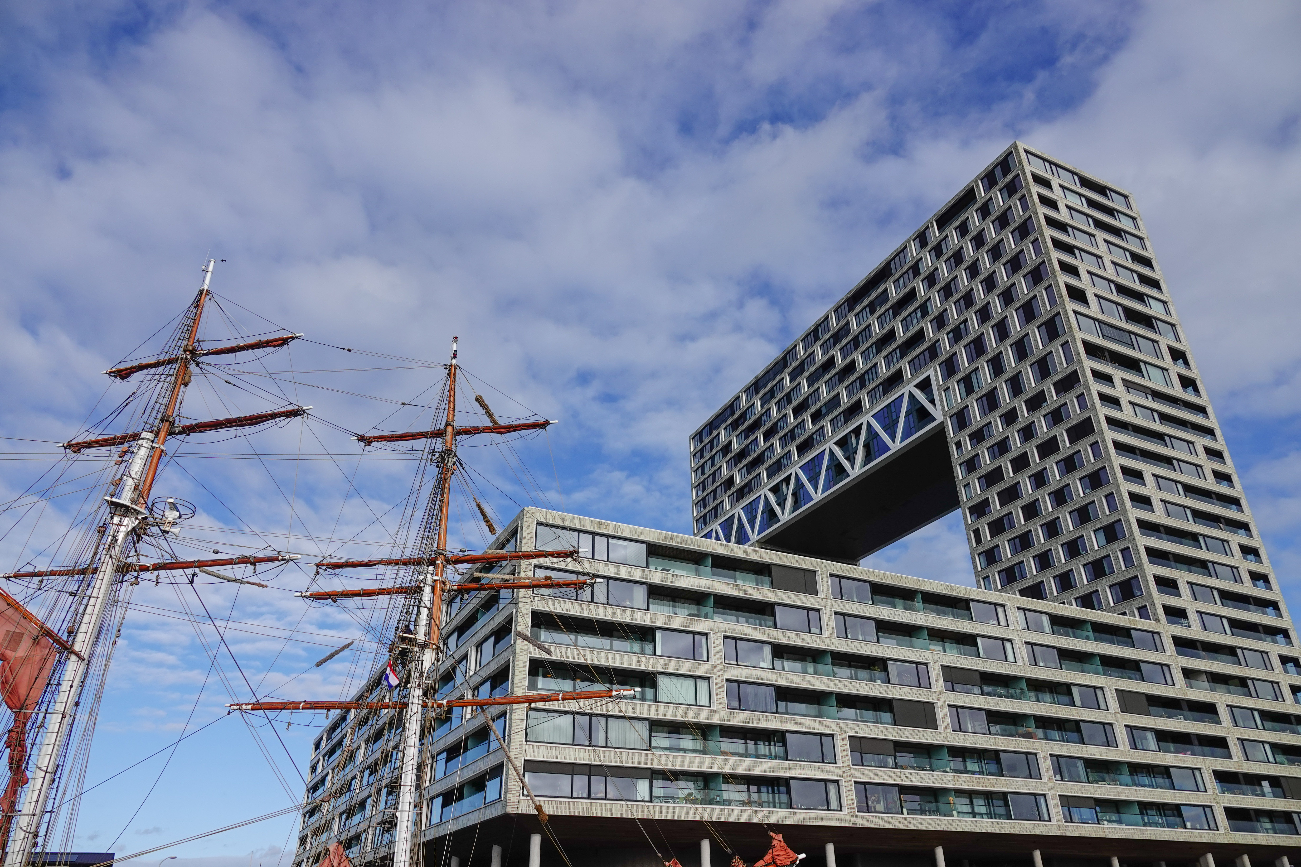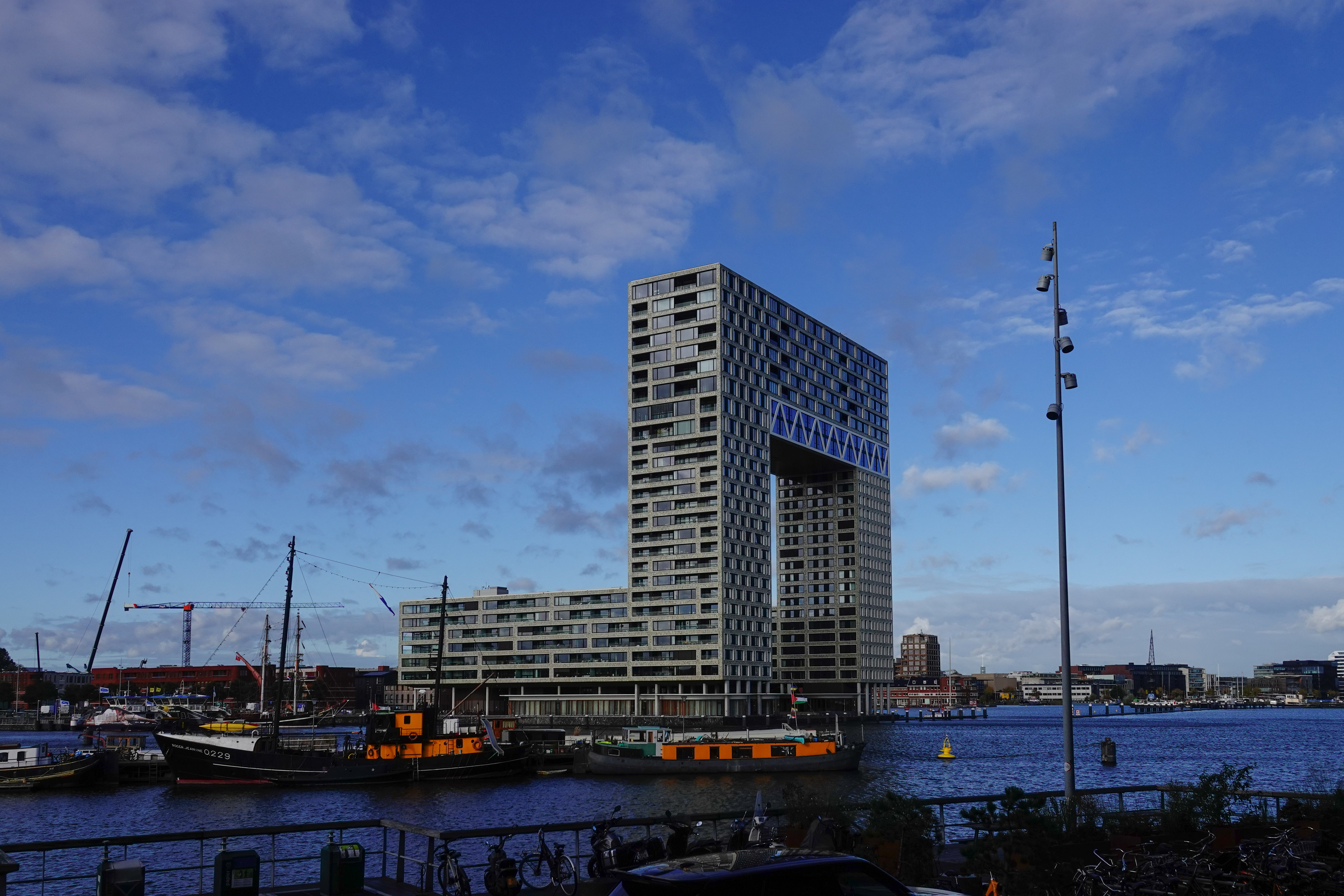 De ‘Silodam’ is er sinds 2002 bijgeplaatst en is een voorbeeld van moderne architectuur. Het doet denken aan gestapelde containers, in de stijl van dit haven gedeelte. We wilden kijken op een platform onder dit gebouw, waar je een schitterend uitzicht hebt op ’t IJ. Helaas waren de deuren dicht en moesten we het doen met uitzicht vanachter glas. Waarschijnlijk was dit een voorzorgsmaatregel voor de aangekondigde storm.