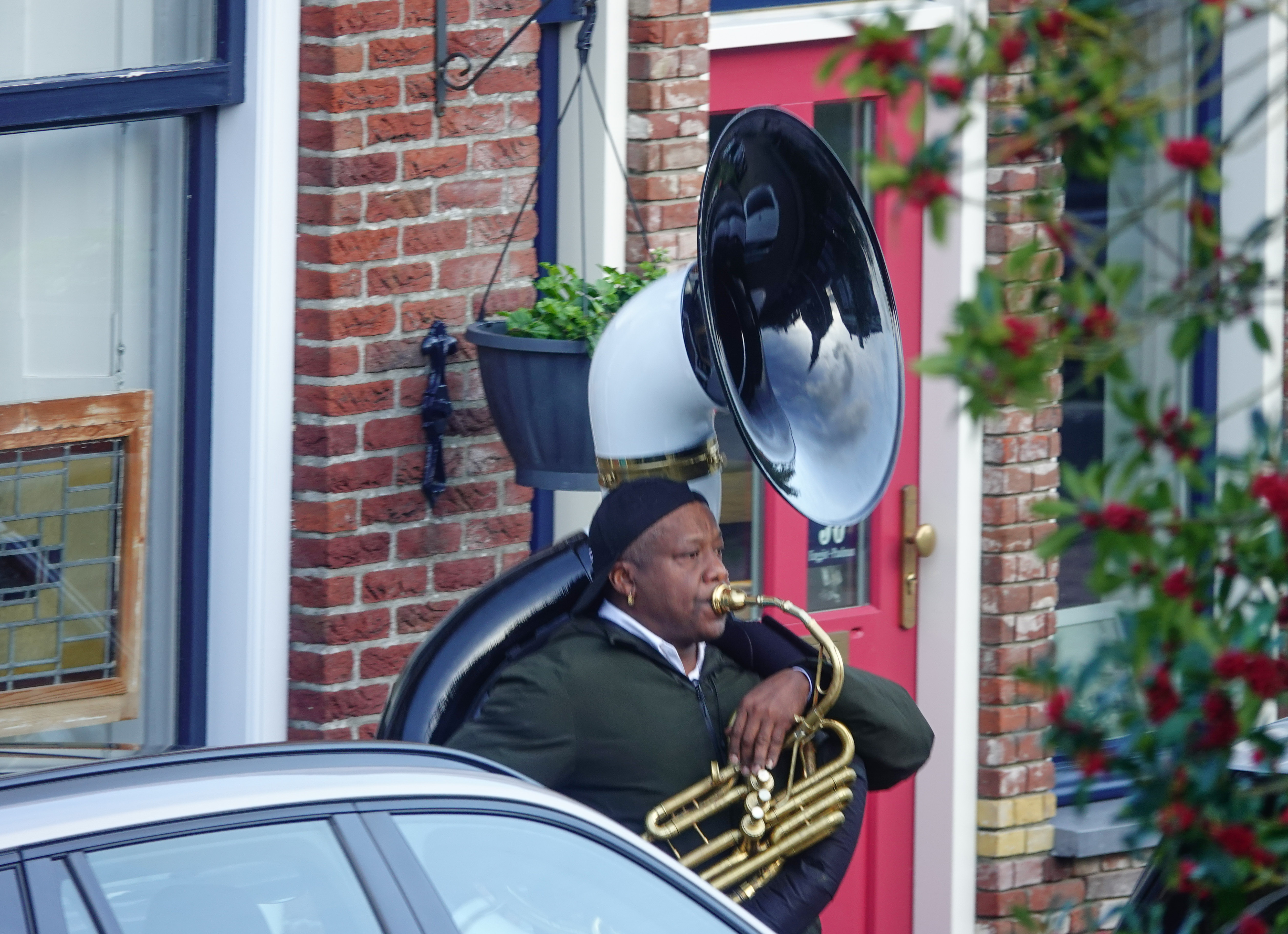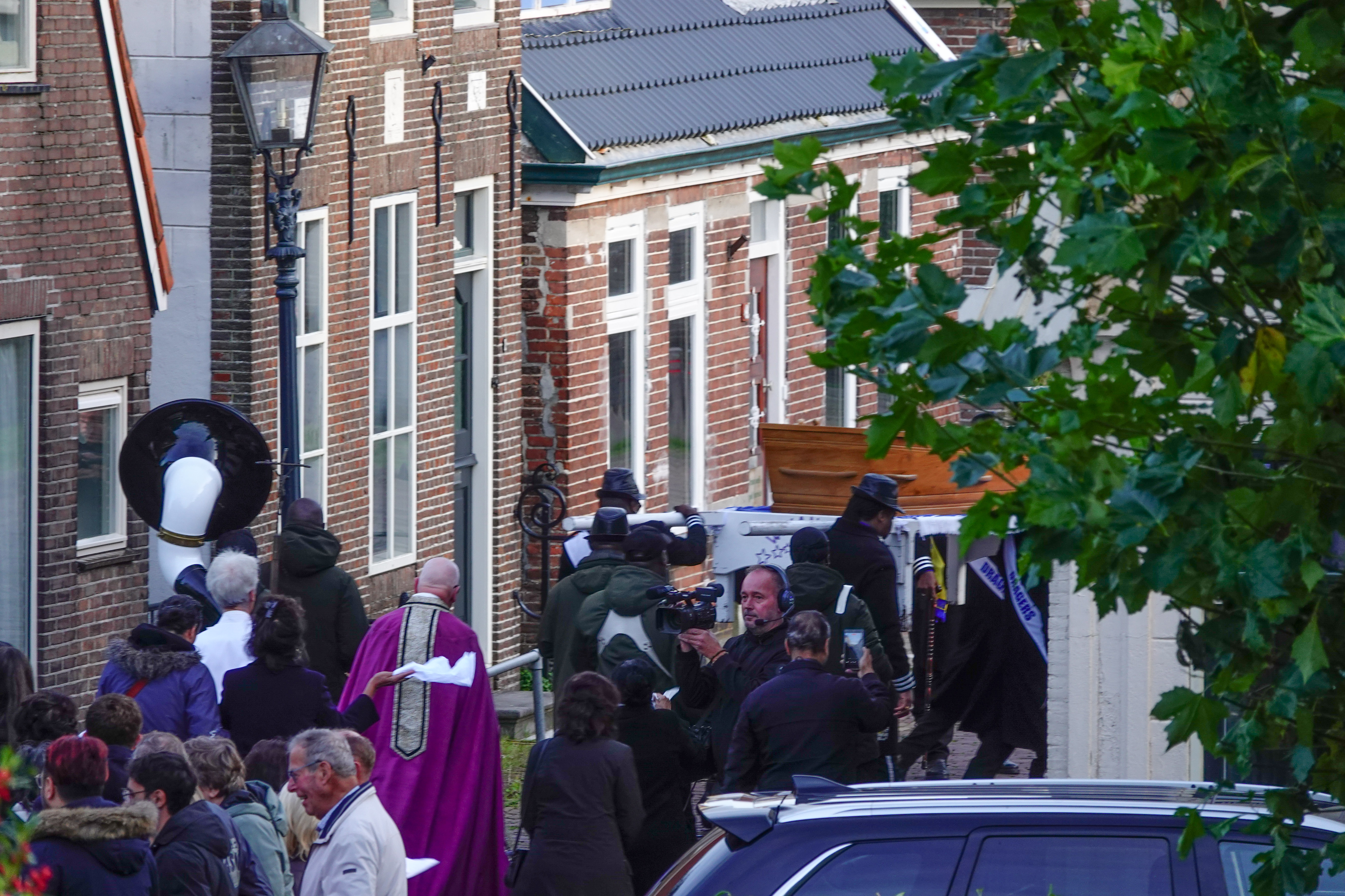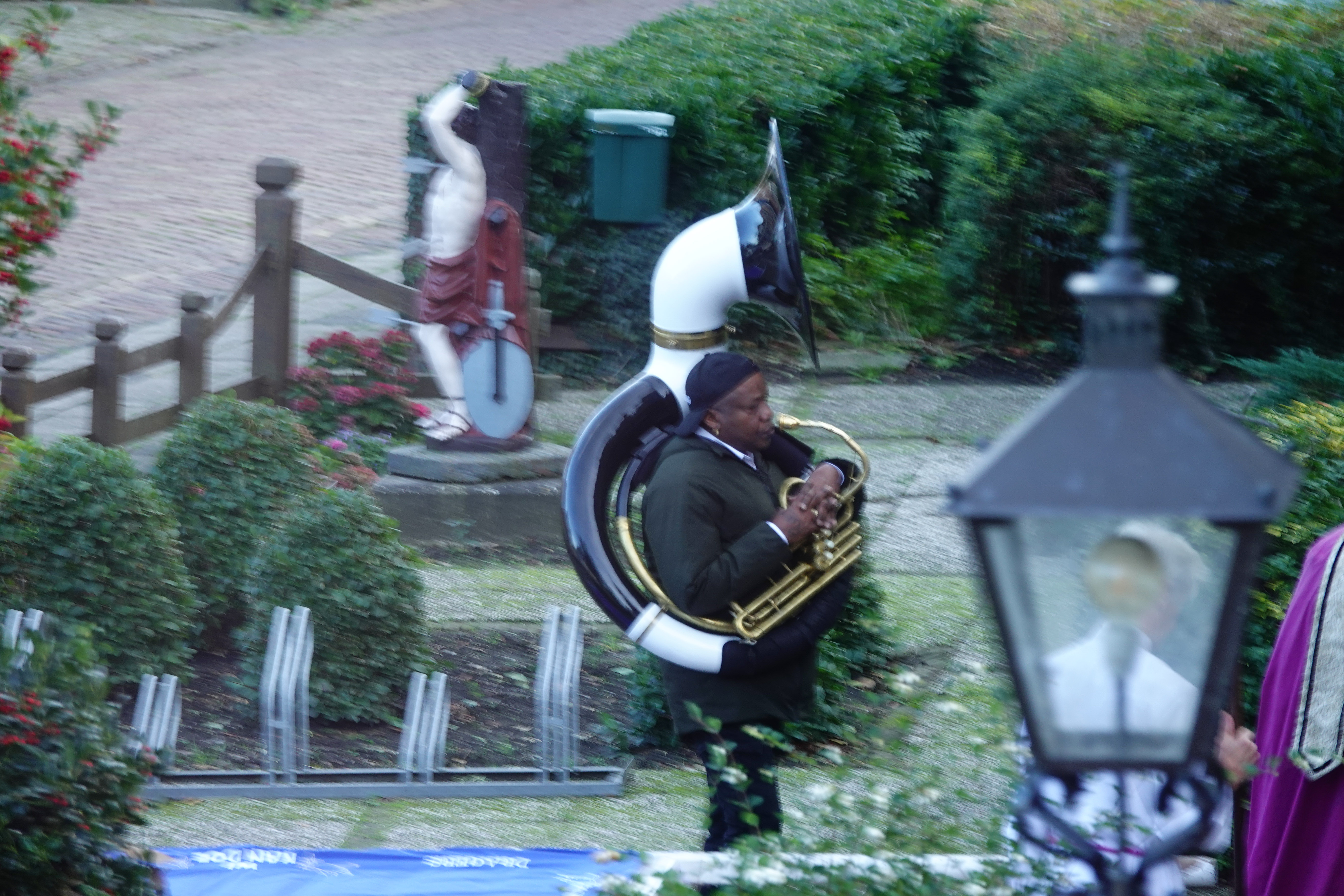 Vanaf mijn balkon zag ik een drone hangen en er stond een man aan de overkant van de straat met een heuse bombardon, die na verloop van tijd in de kerk verdween.