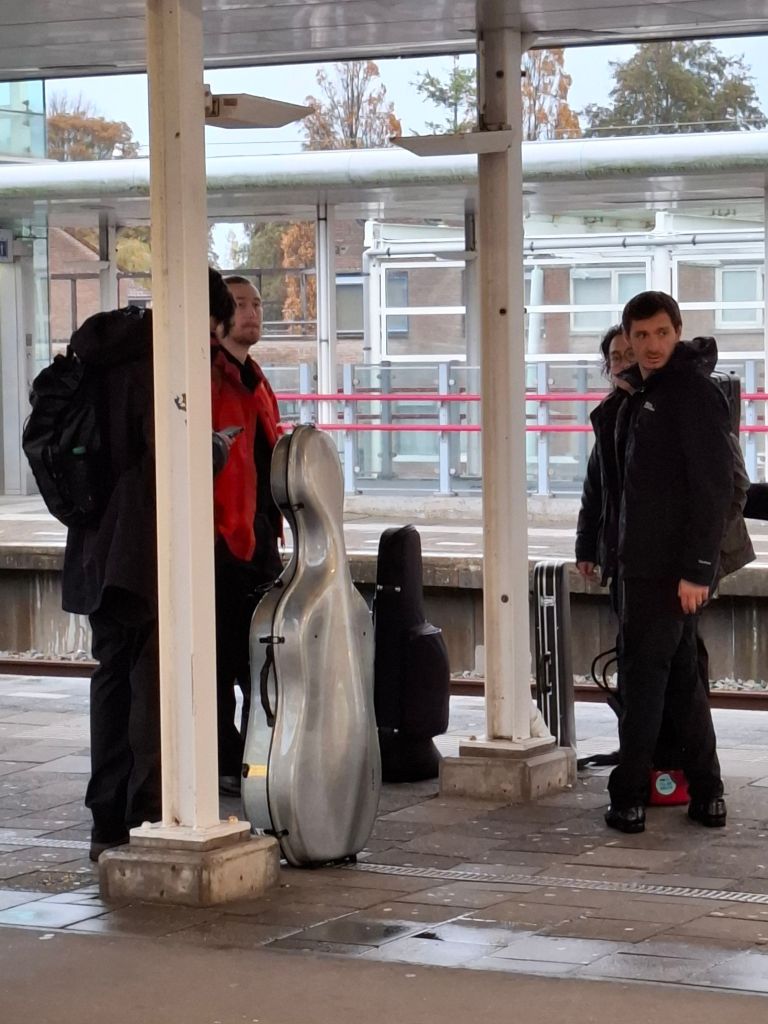 Op het perron stond een groepje muzikanten, die met dezelfde trein teruggingen, als ik en mij zo’n fijne middag hadden bezorgd.
