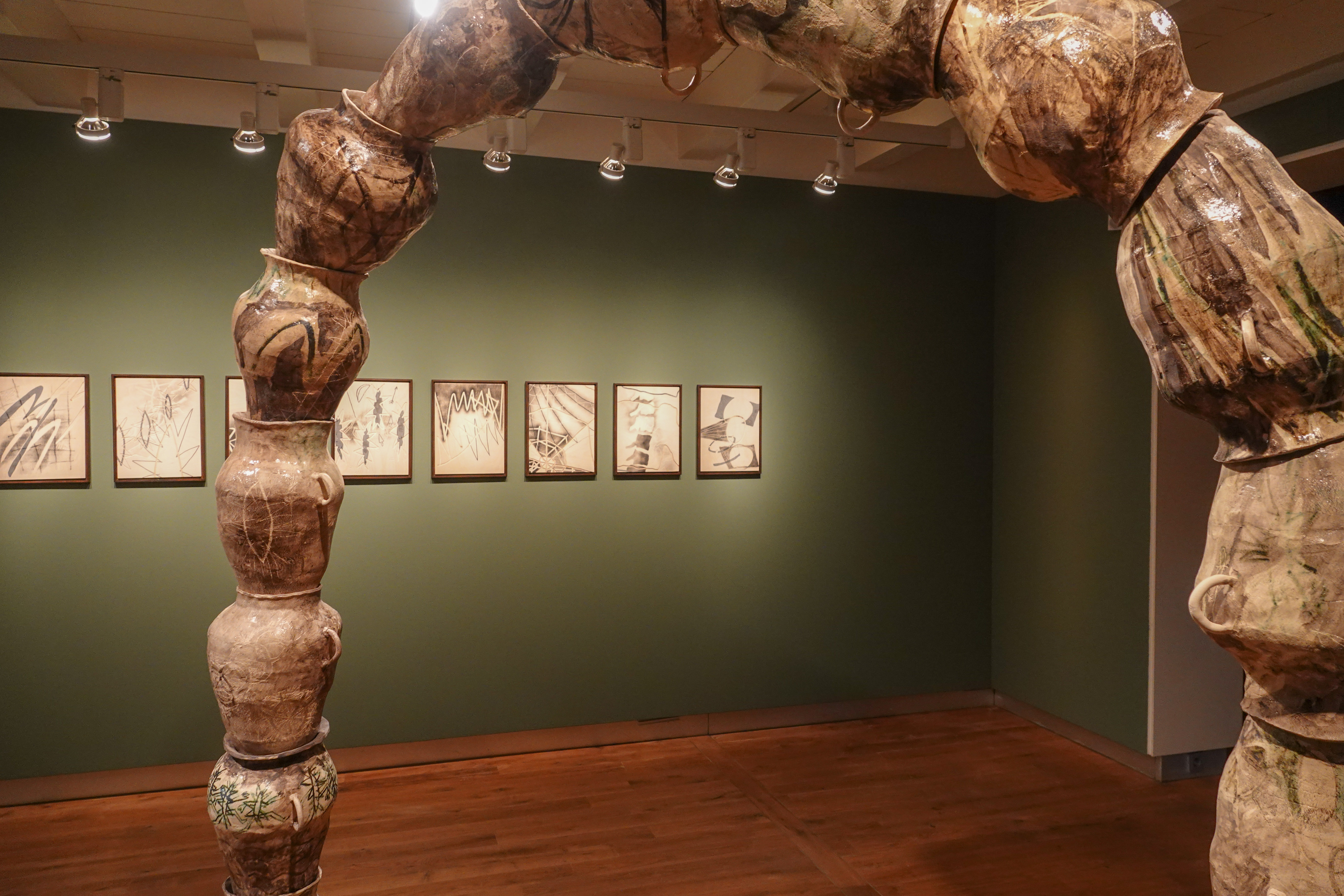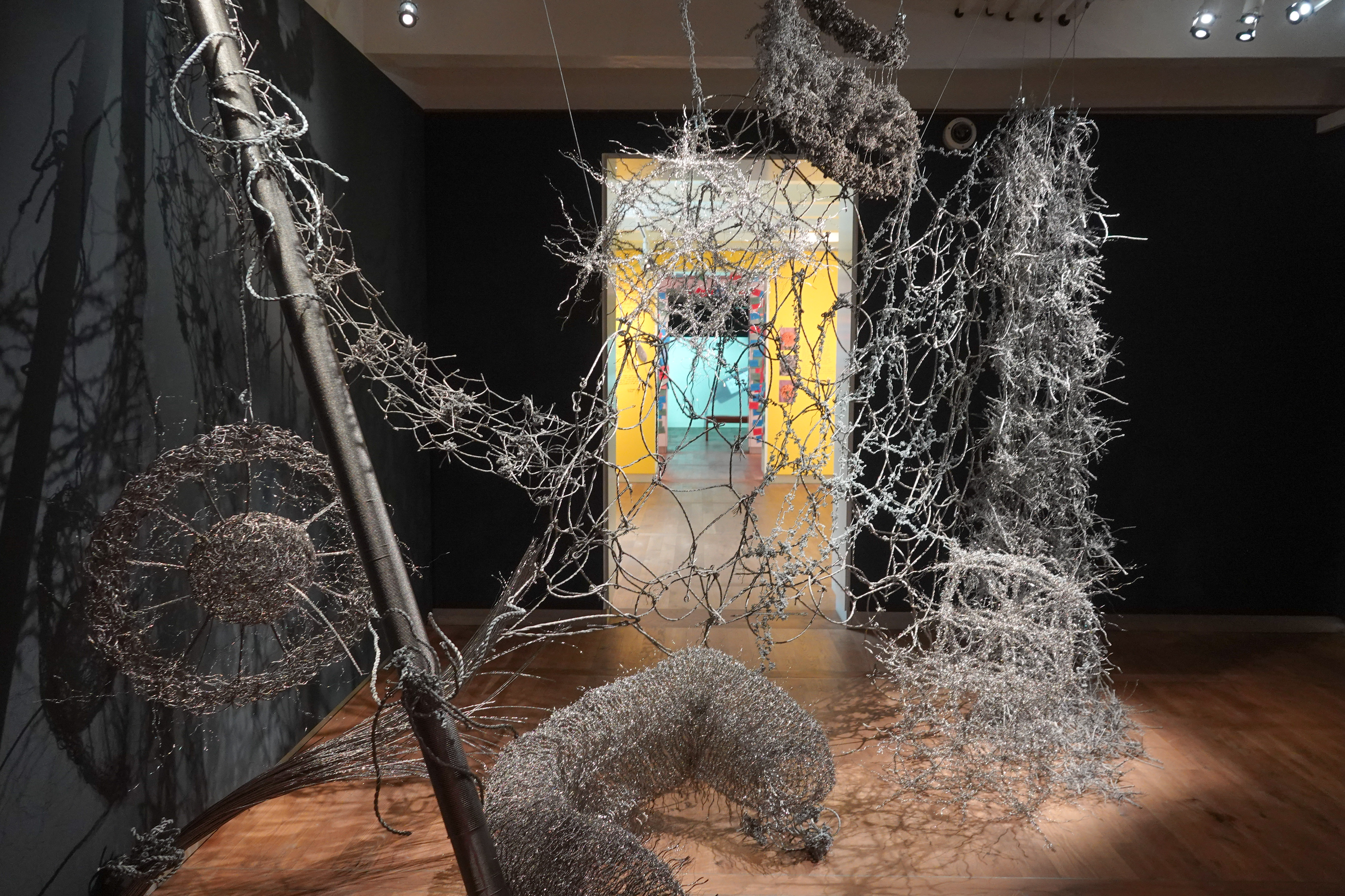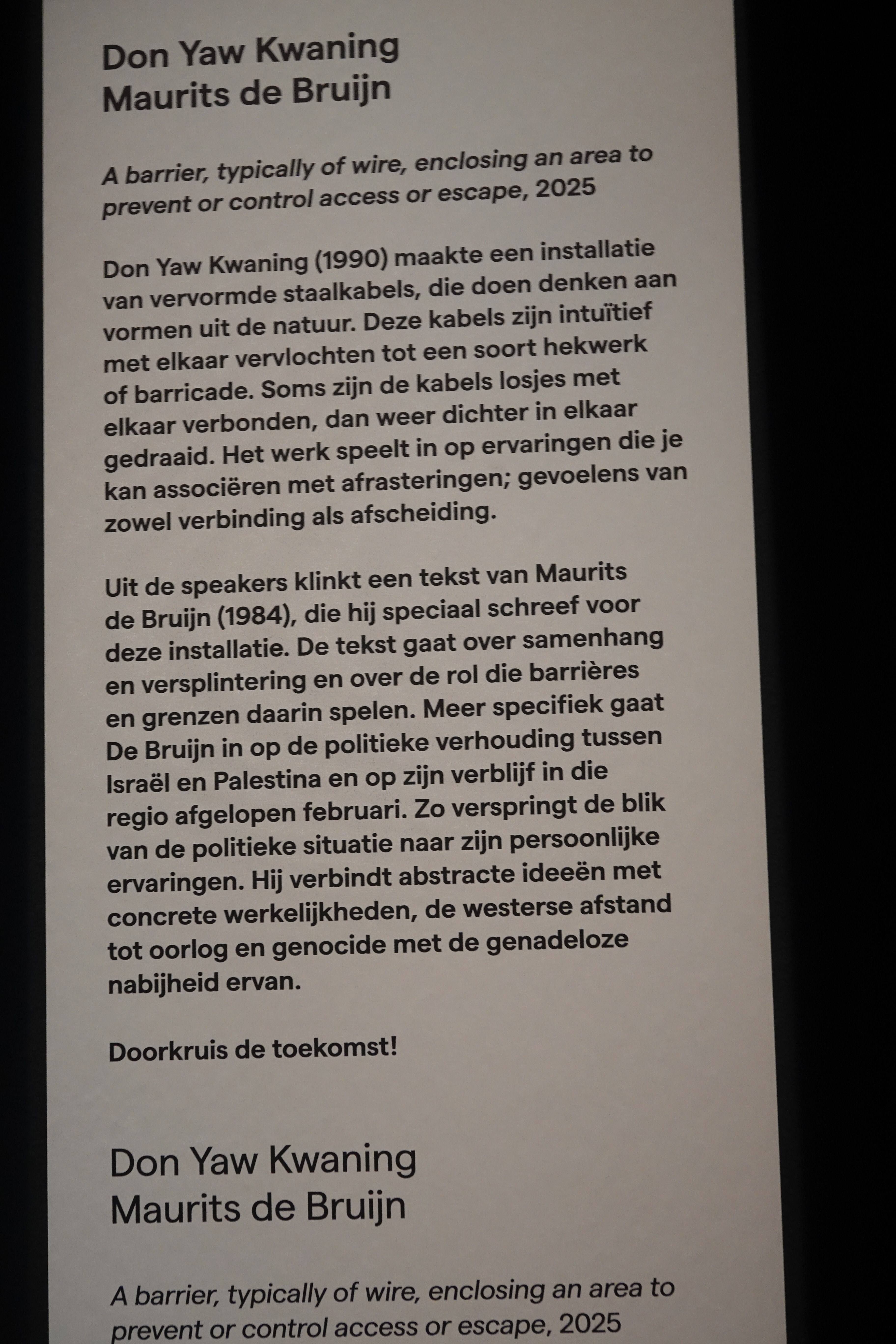 Don Yaw Kwaning maakte een installatie van vervormde staalkabels, die doen denken aan vormen uit de natuur. De kabels zijn intuïtief met elkaar verbonden, soms losjes, soms stevig. Dit werk gaat over de rol van barriéres en grenzen.